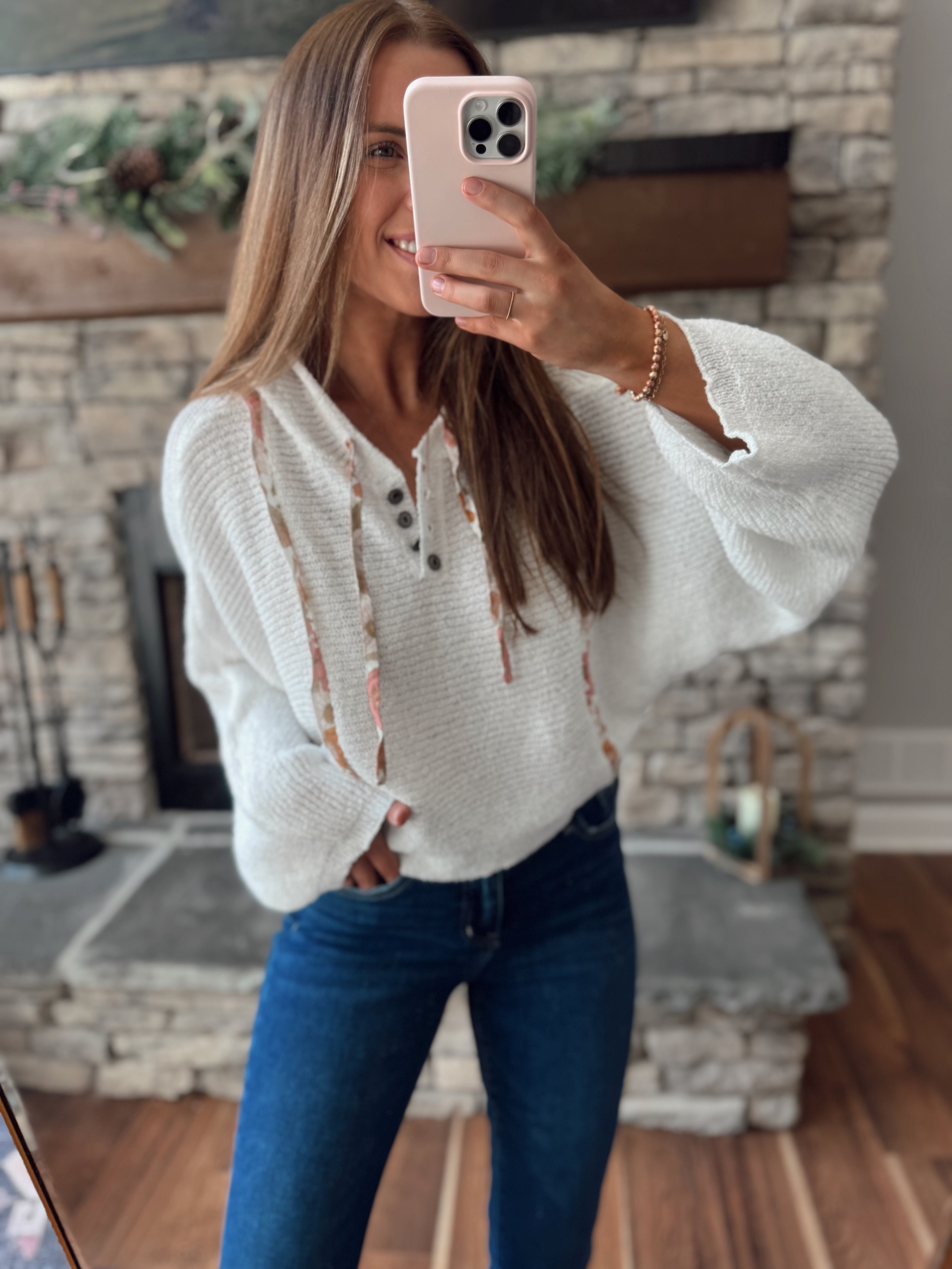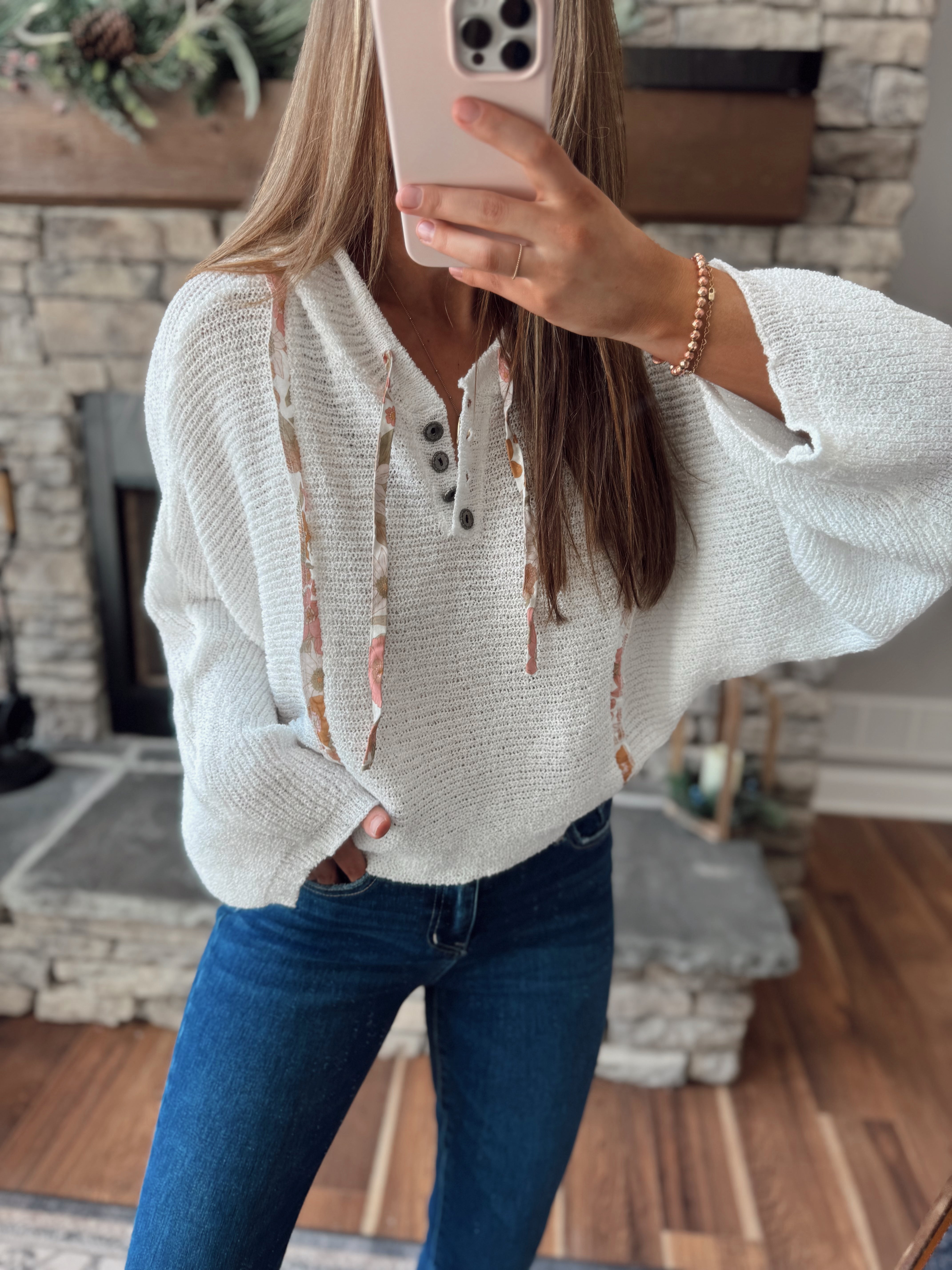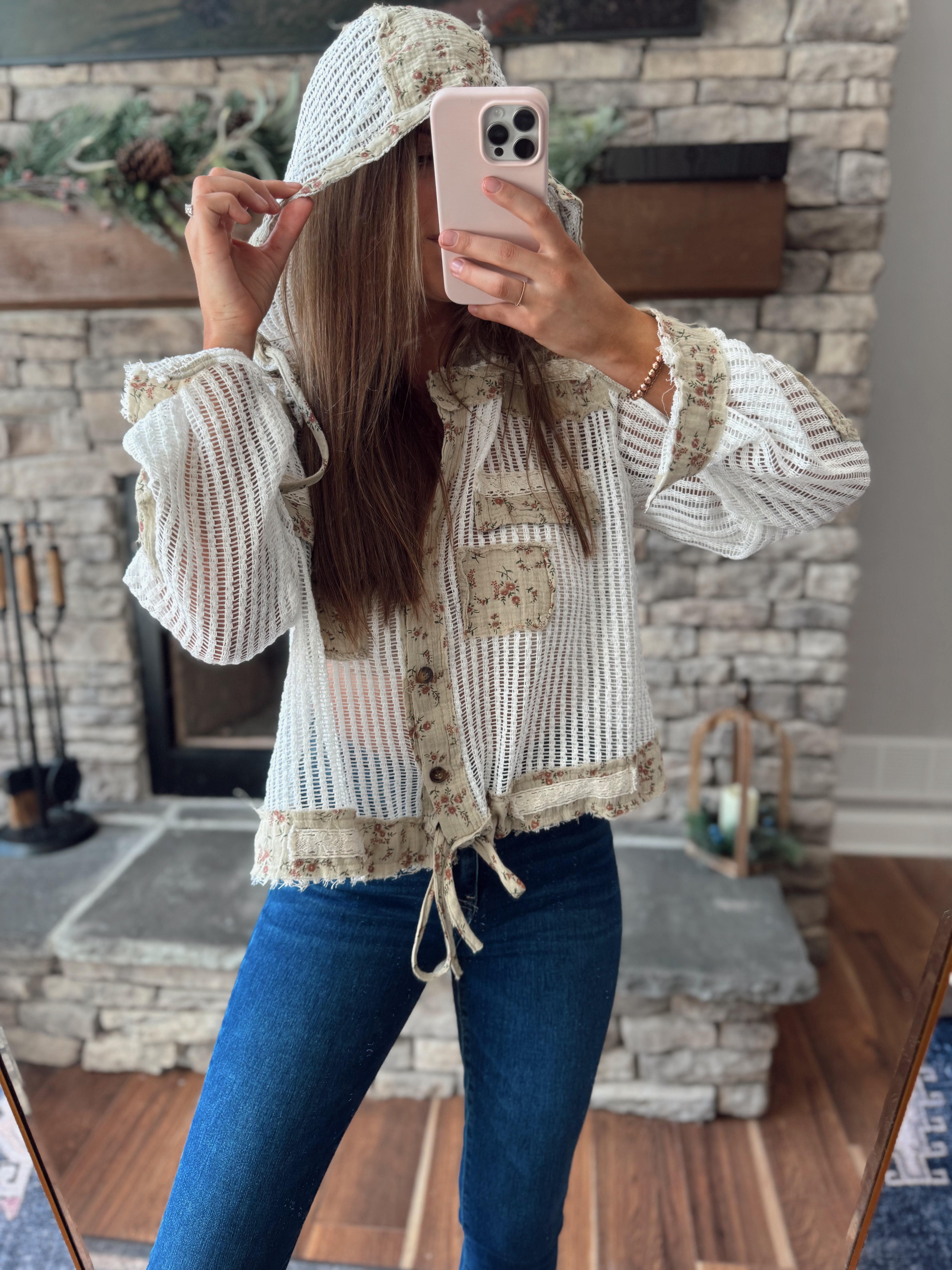Warm Breeze Off White/Natural Floral Gauze/Mesh Mix Hooded Button Down