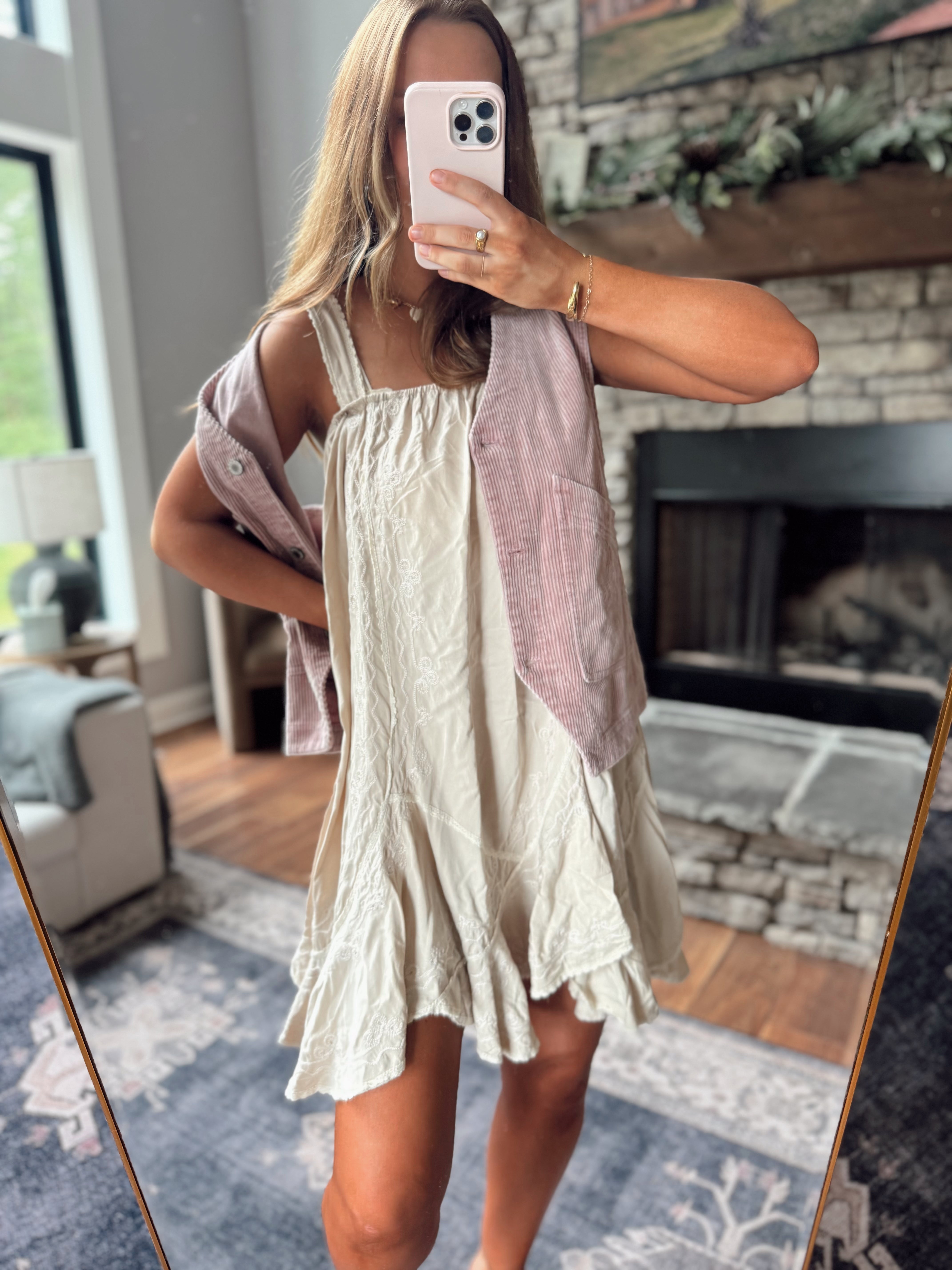 Coastal Elegance Beige Mock Overall Embroidered Flowy Mini