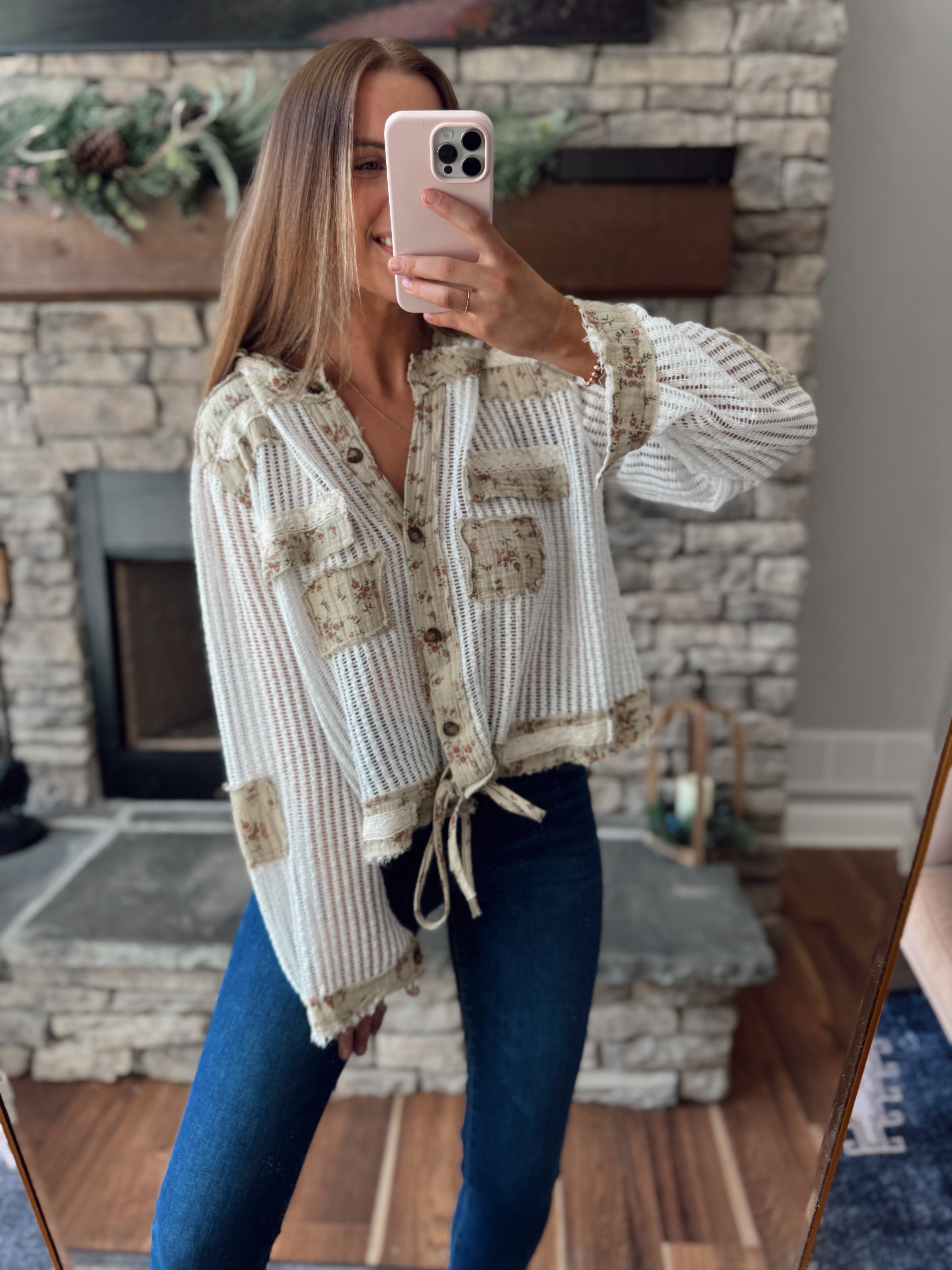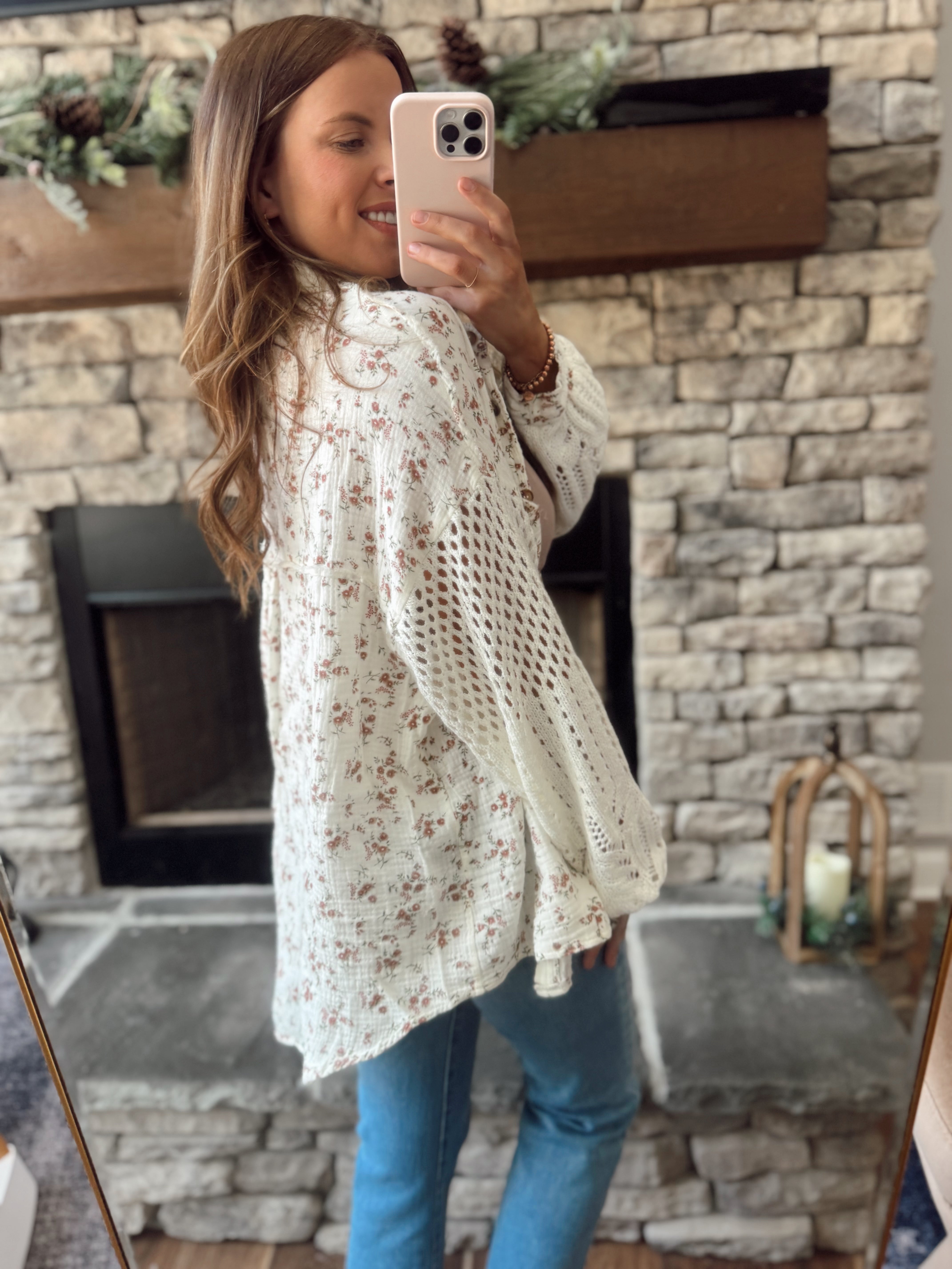 Cream Floral Sweater Sleeve Gauze Button-Up