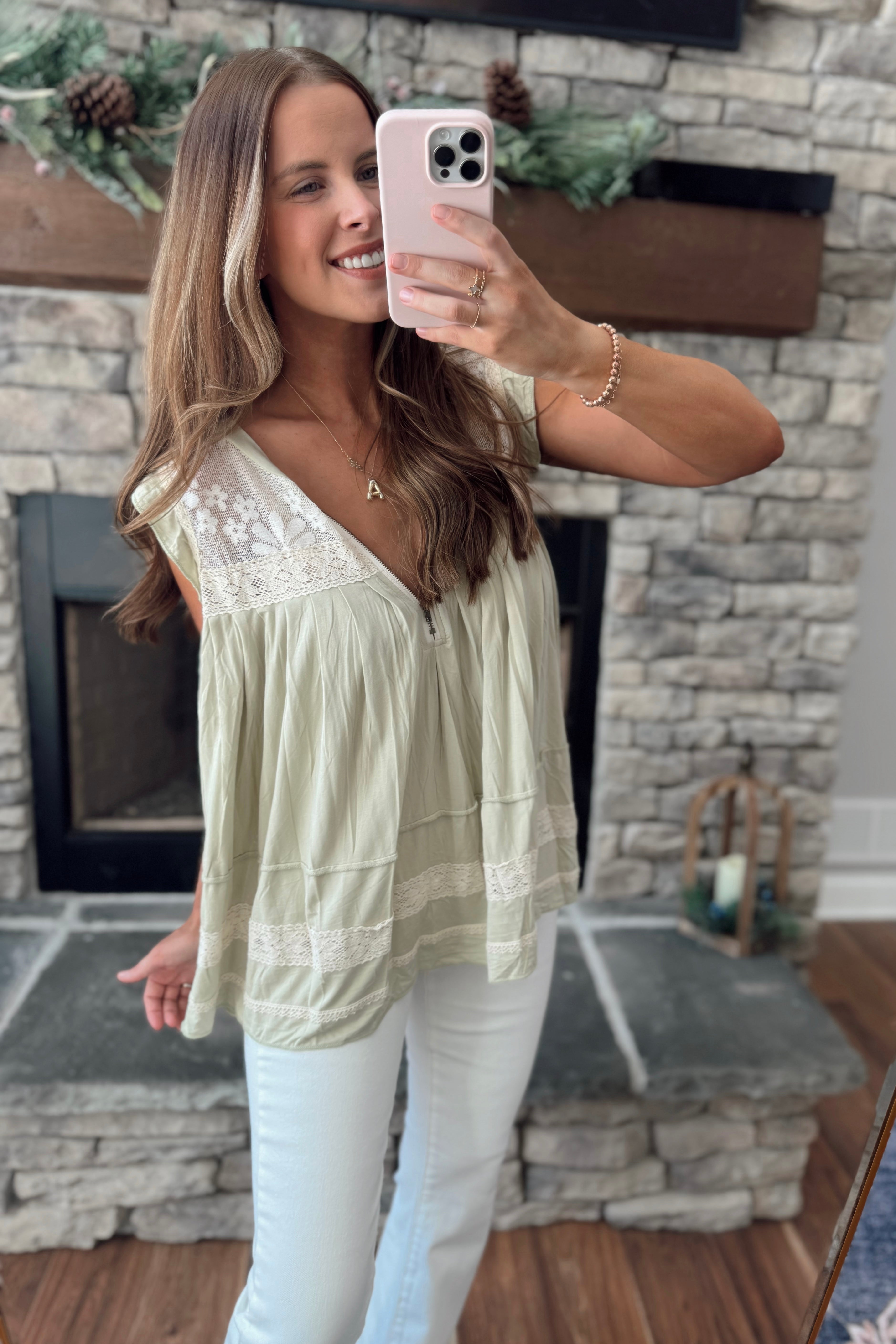 Kennedy Pistachio Lace Accent Zip Neck Tank