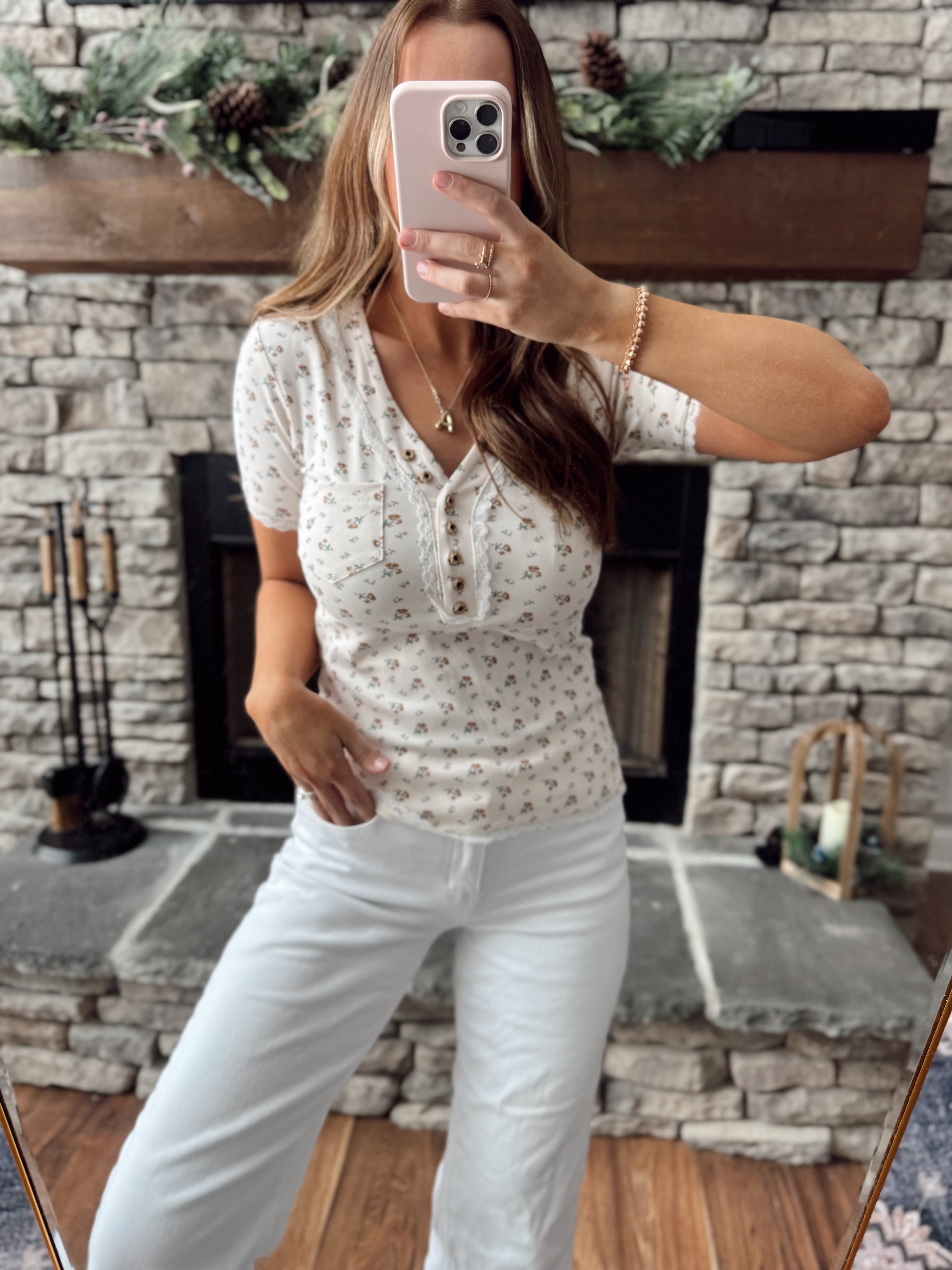 Naomi Cream Floral Lace Trim V-Neck Tee