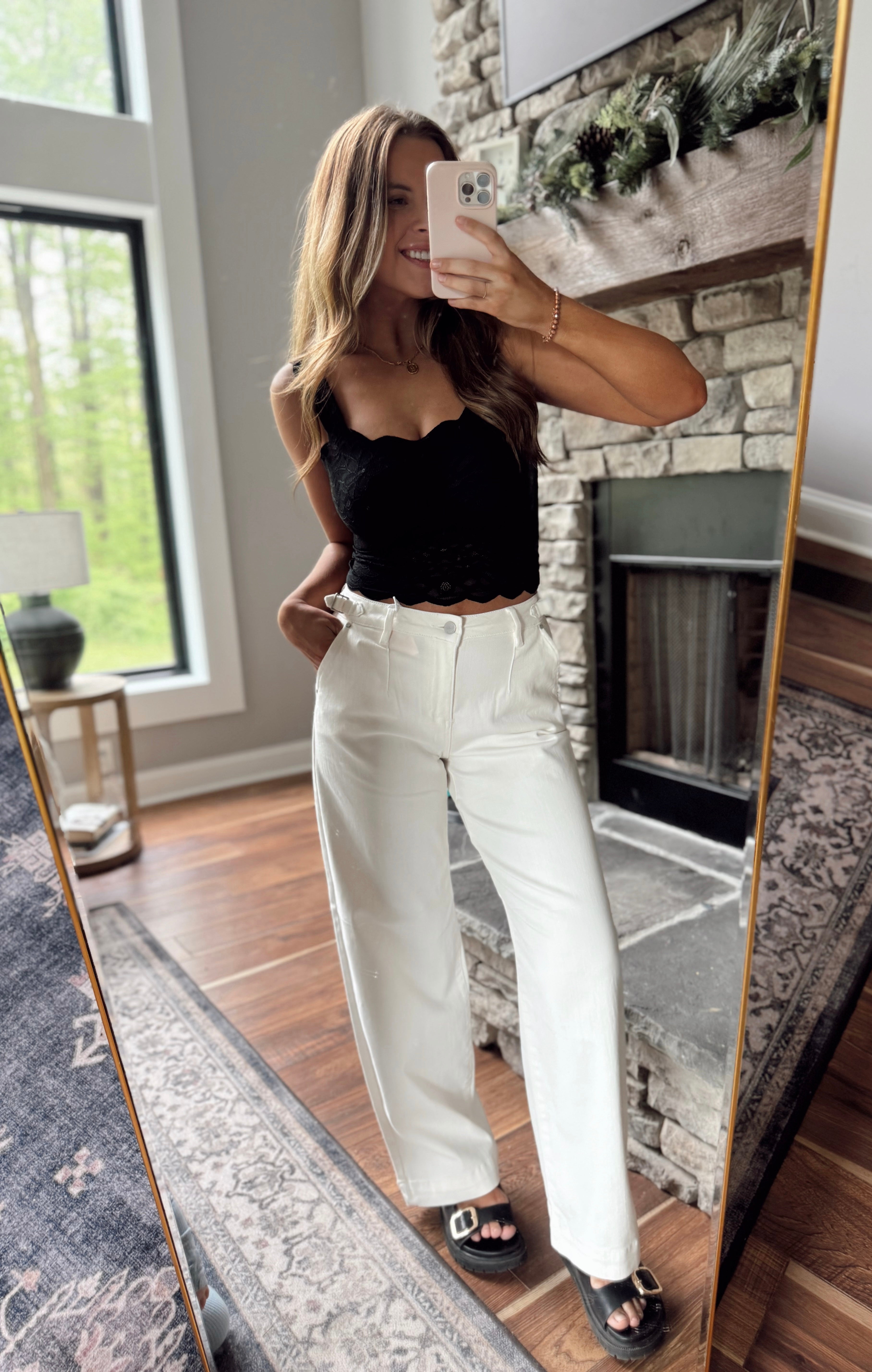 Mid Rise, wide leg jeans with pleated front detail and adjustable waist. Rise 11" | Inseam 31" in size 3/26 - 92% Cotton, 6% Polyester, 2% Spandex