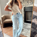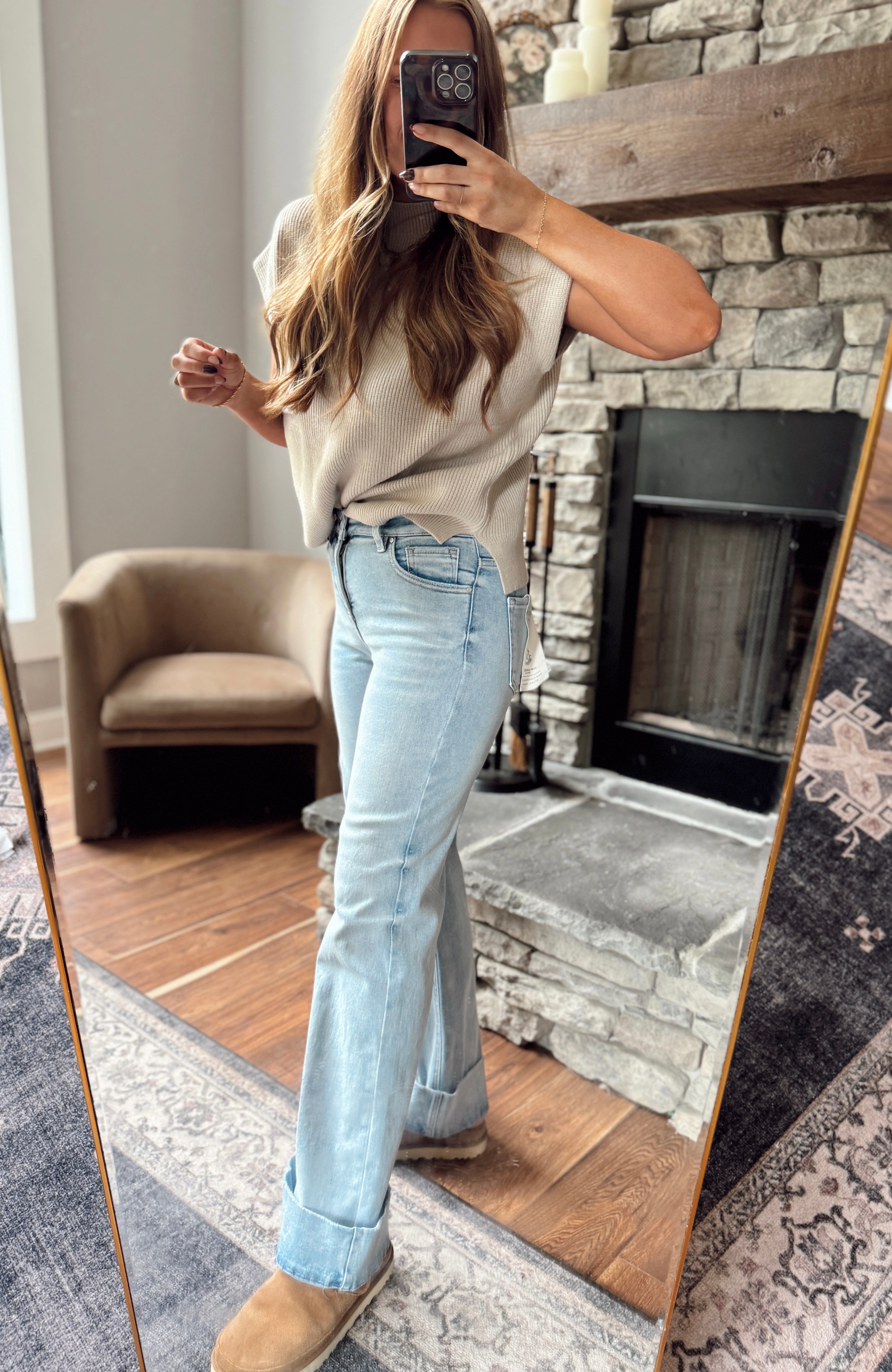 Step out in style with the RISEN High Waist Tummy Control Ankle Wide Cuffed Jeans. These light wash, wide-leg jeans feature a trendy cuffed hem and provide a flattering tummy control fit that hugs your curves just right. Perfect for balancing comfort and fashion, they make every step playful and confident.