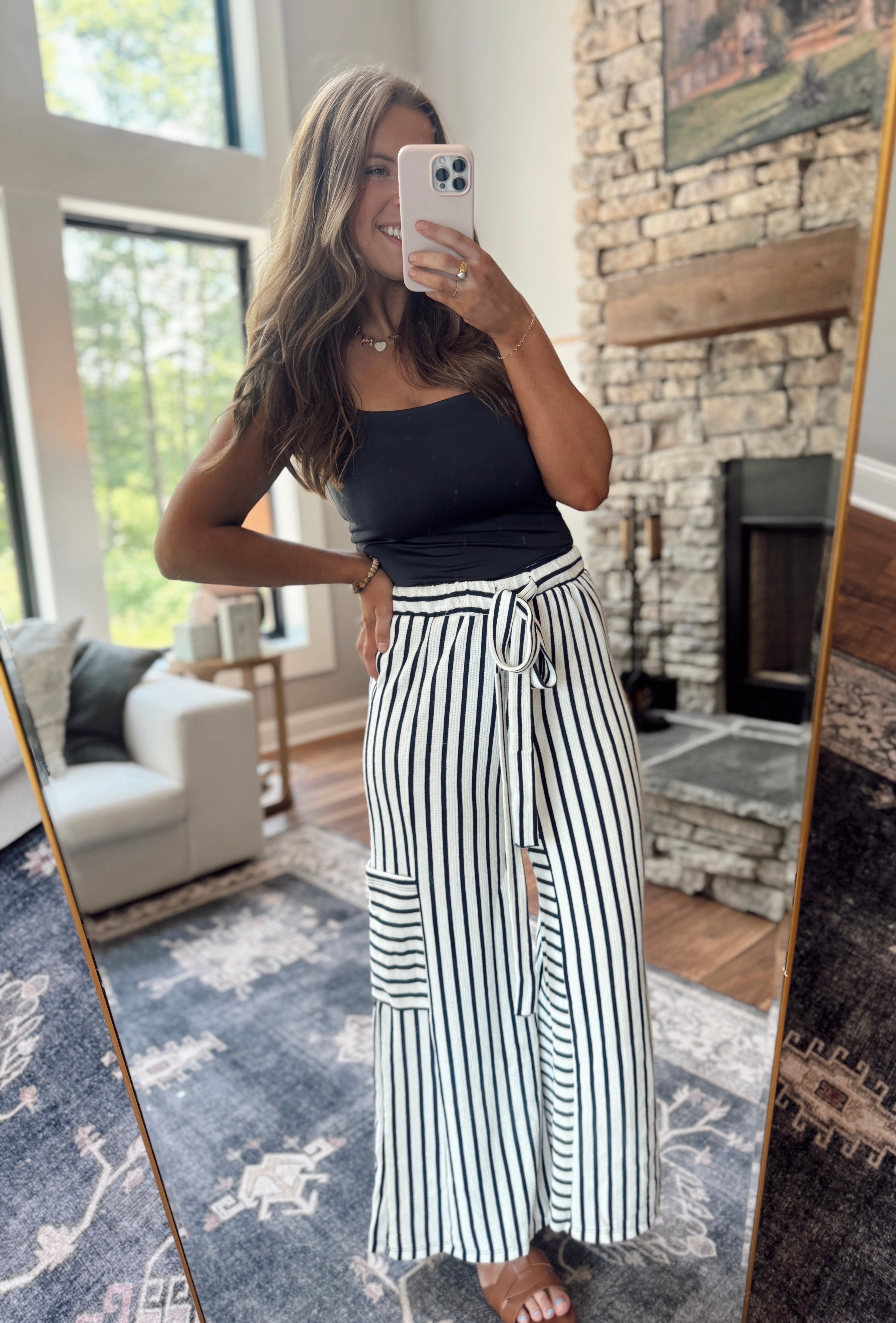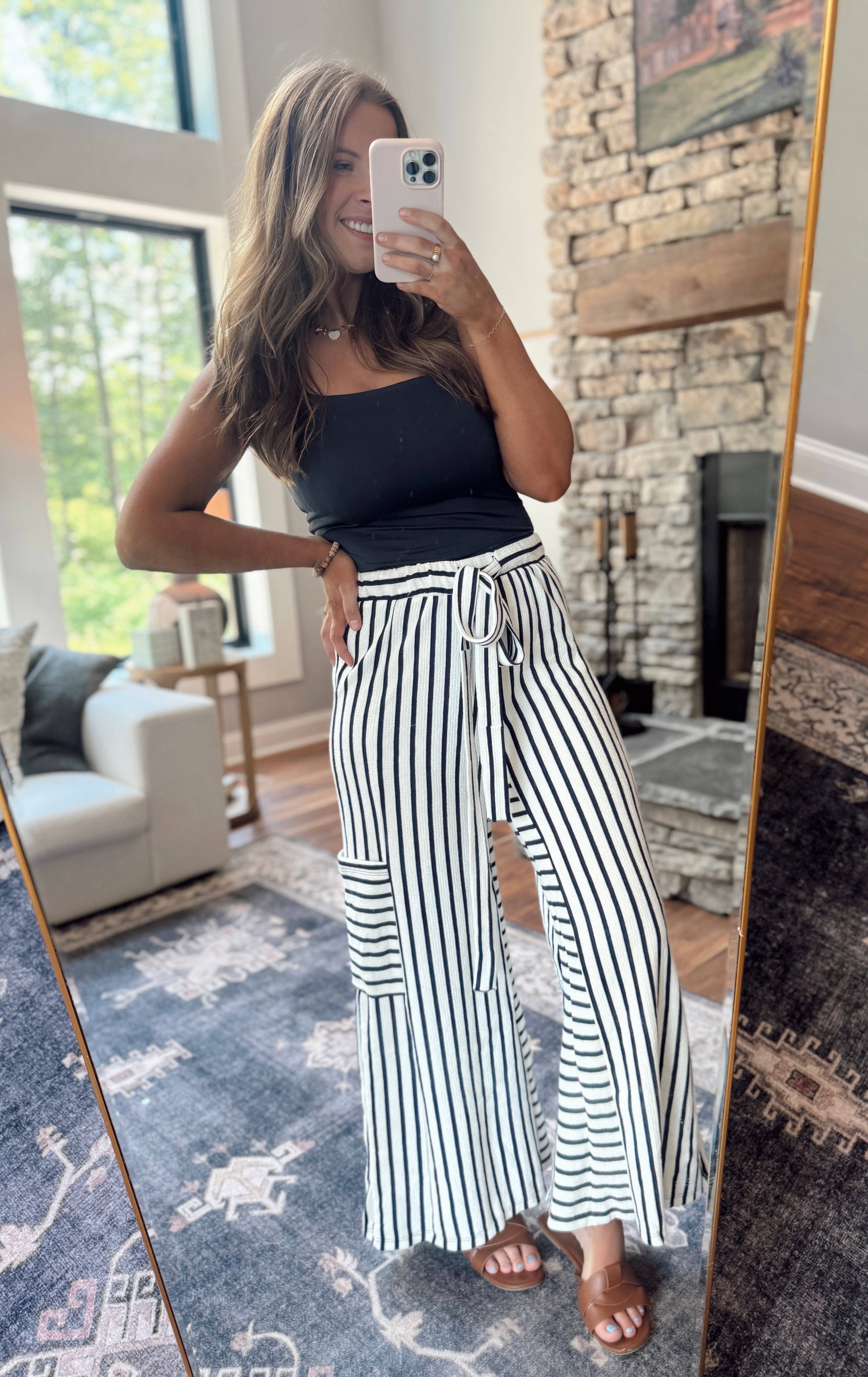 The cutest pants evaaaaa! Navy stripes - adorable pockets! Love the mismatched stripes. Relaxed fit - elastic waist waist. I’m 5’7 for length reference too.