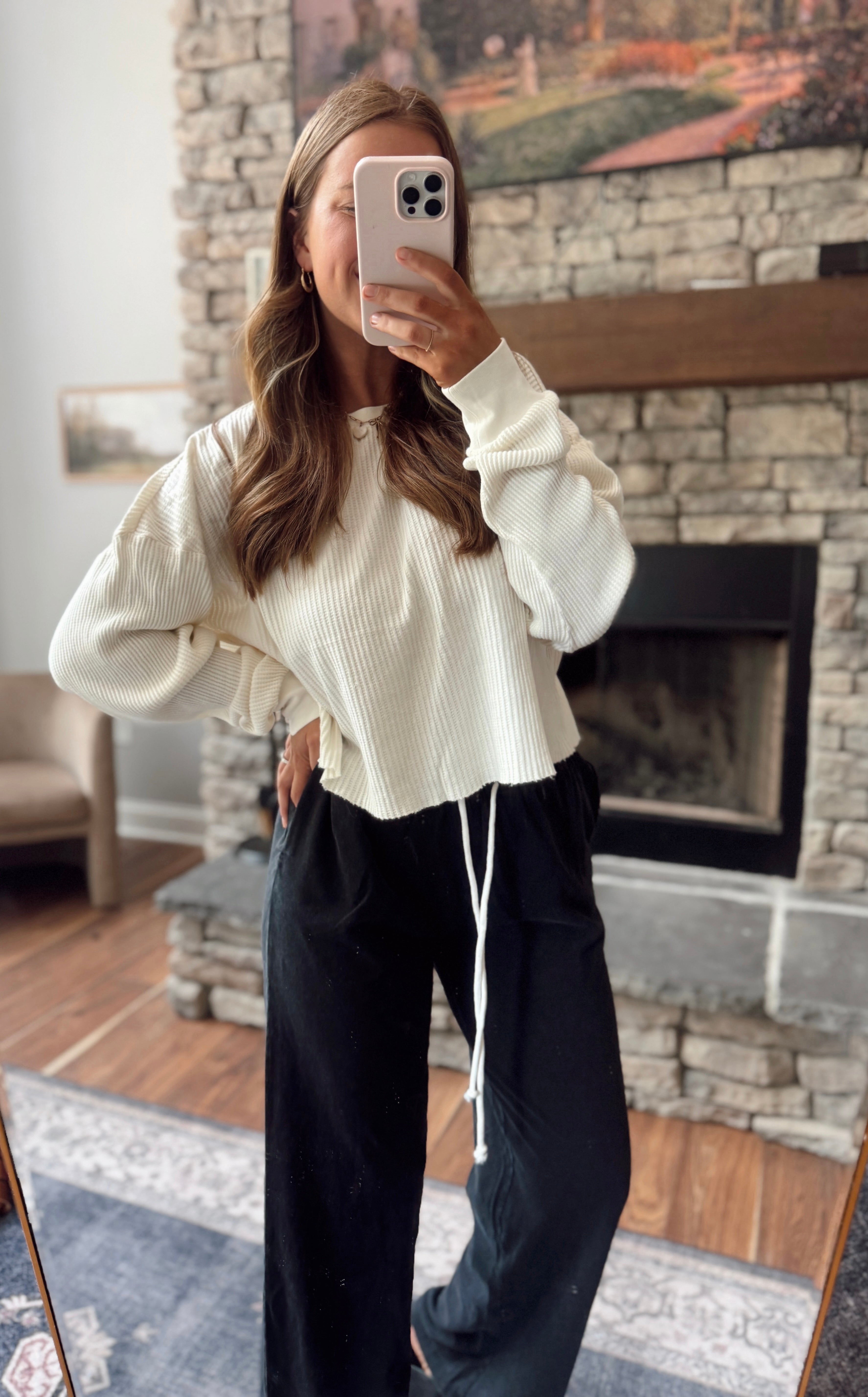 Cozy up in this go-to waffle knit long sleeve! Perfect for layering on chilly days or wearing solo for that effortless, comfy vibe. The textured waffle fabric adds a touch of style while keeping things soft and breathable. Whether you're running errands or curled up on the couch, just add high-waisted jeans or your favorite sweats, and you’re good to go!