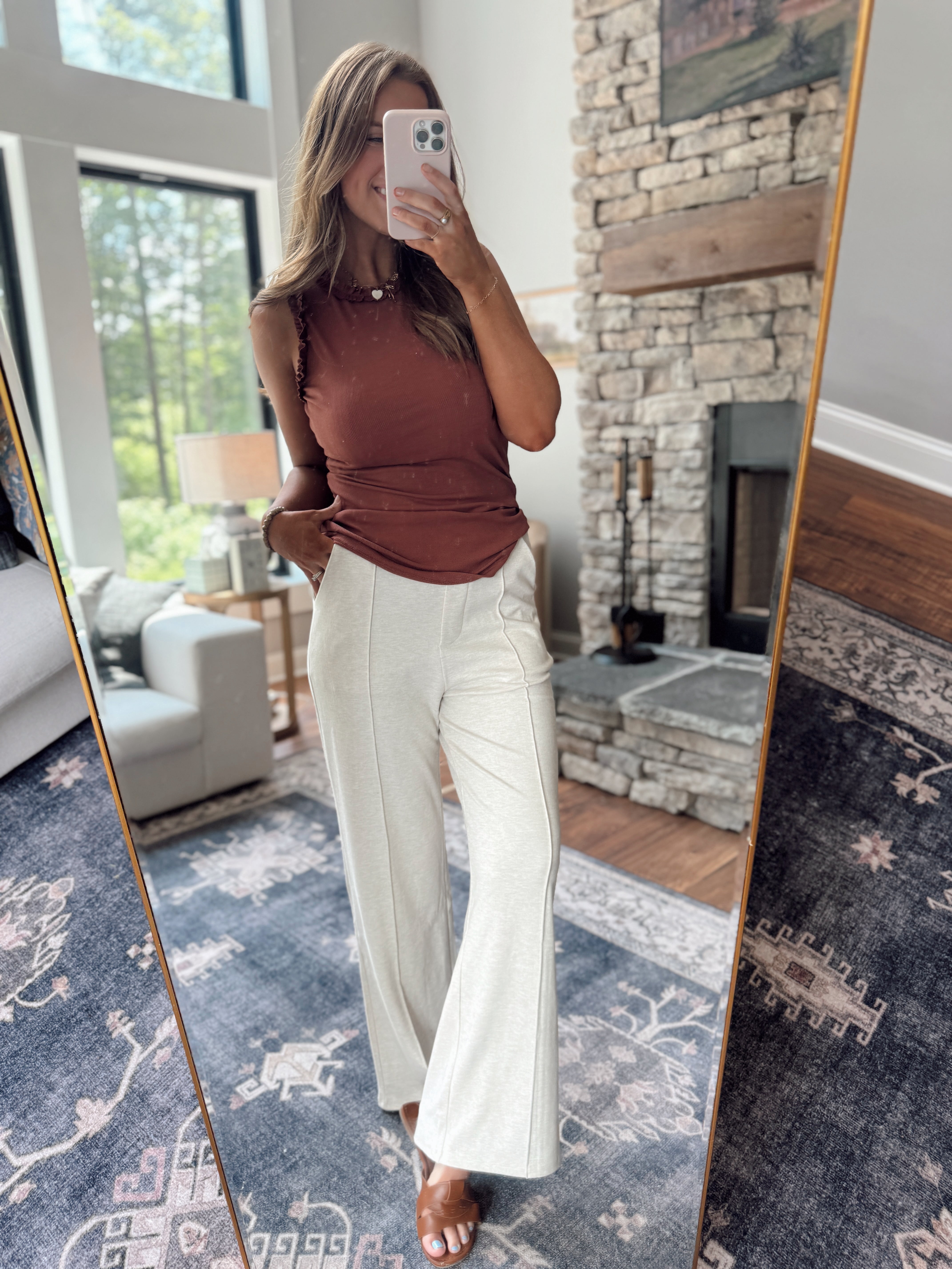 Buttery Soft! So comfy. I love that they can be dresses up or down. I’m 5’7 and in the small.