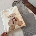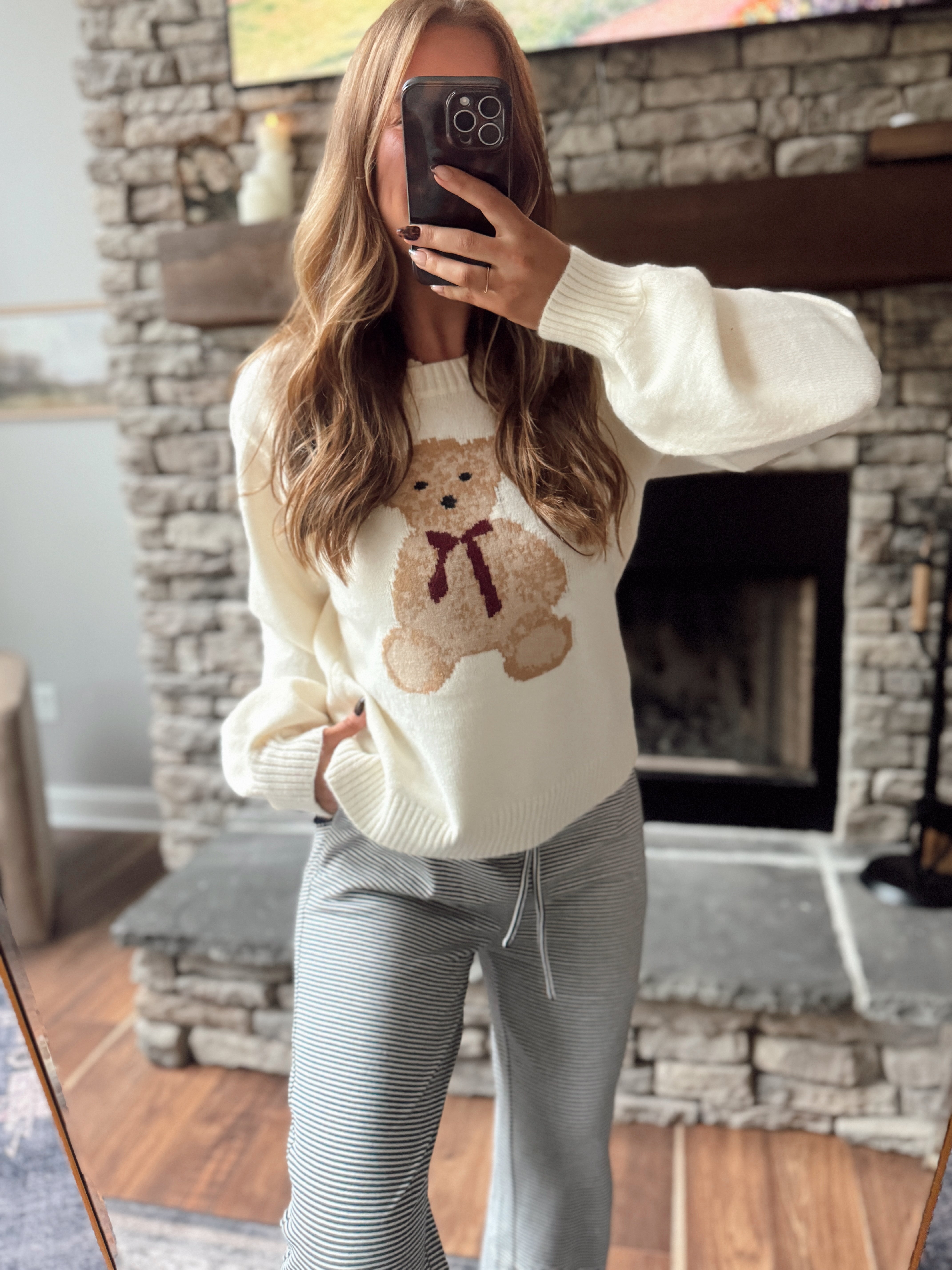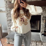 Bring on the nostalgia with the softest statement knit of the season. This ivory sweater features an adorable teddy bear design that instantly adds charm to your look—whether you’re cozying up at home or stepping out with denim and boots. The fabric is plush and dreamy, making it as comfortable as it is cute.