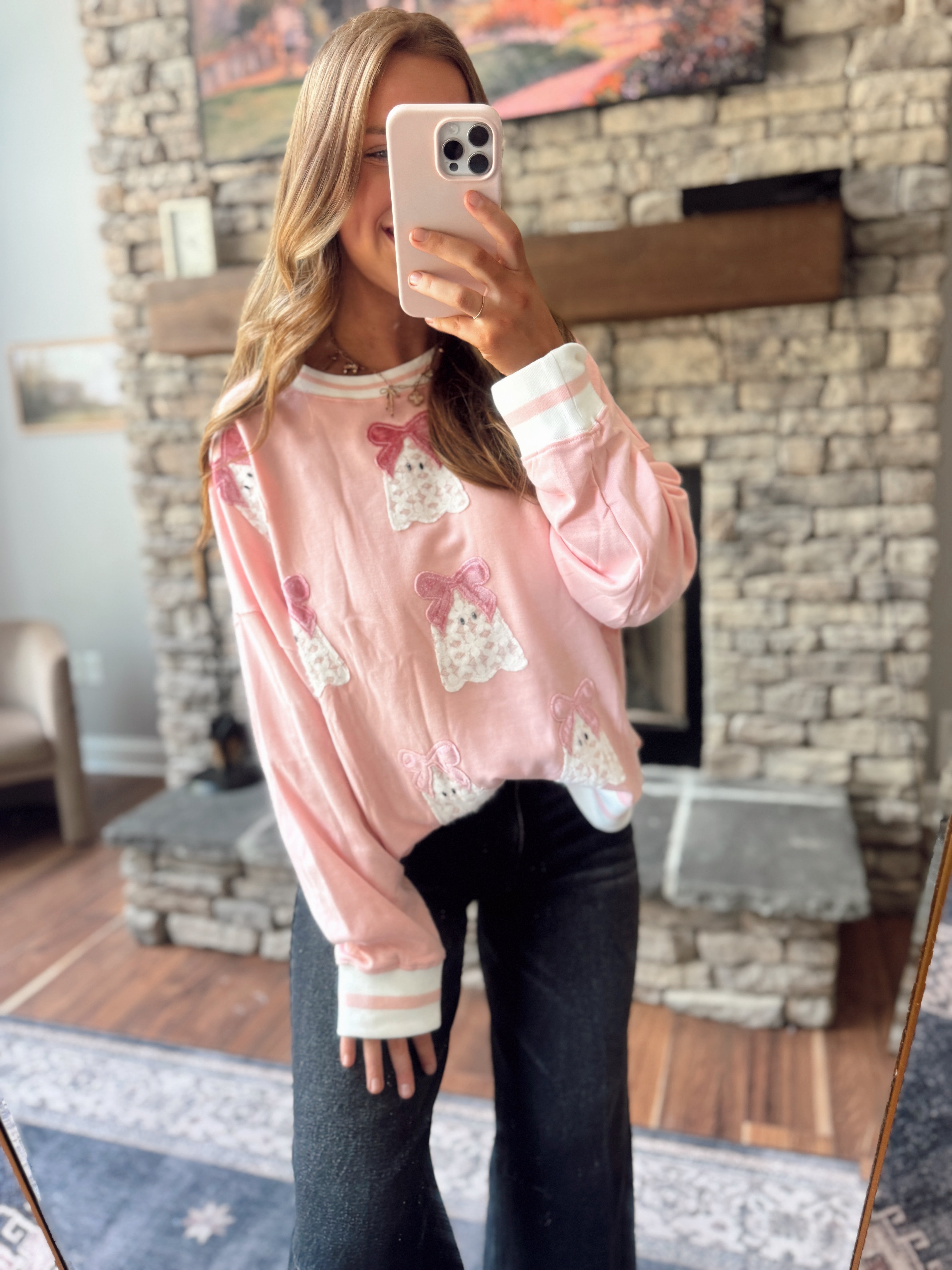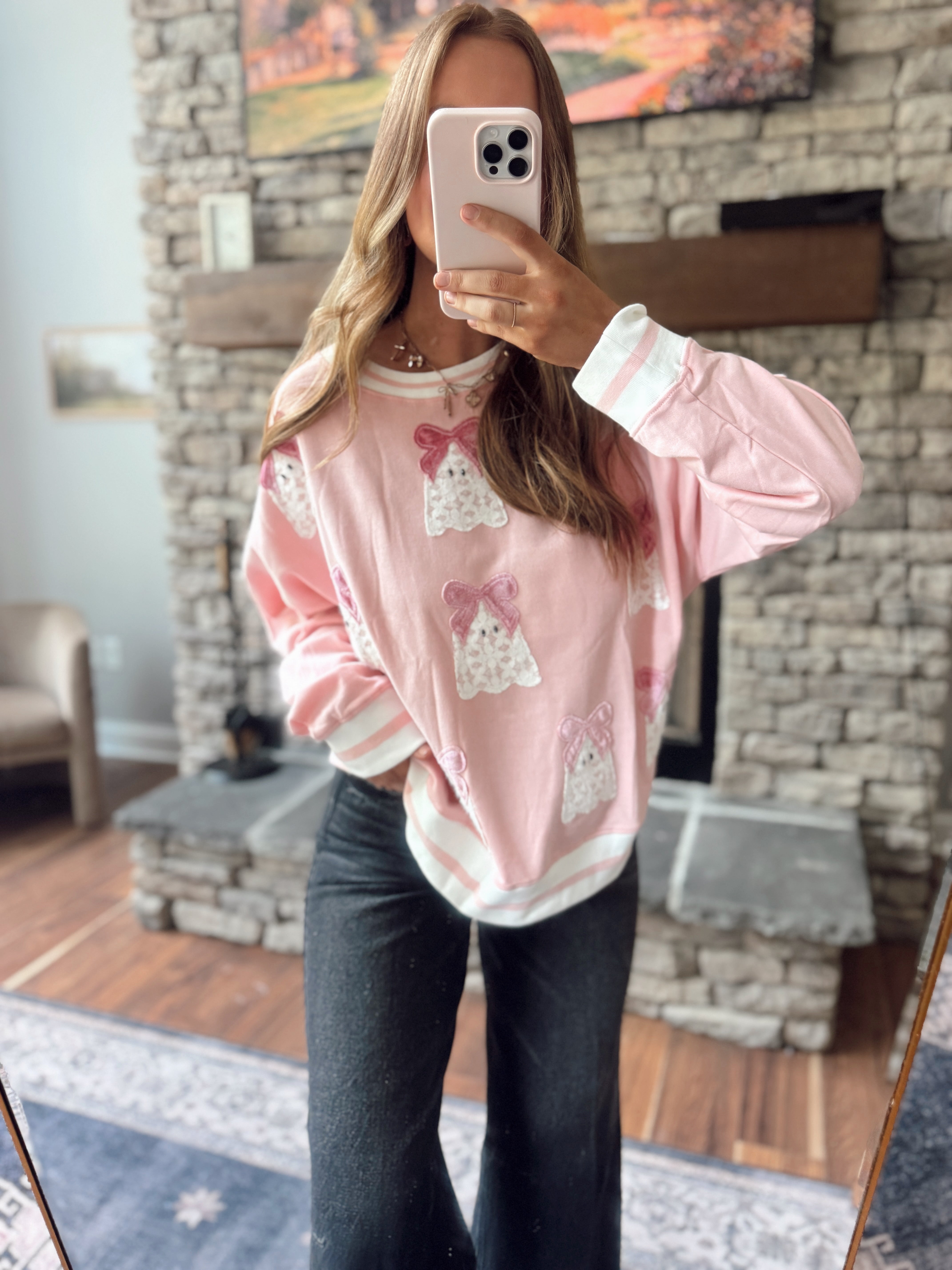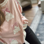 For the girls who like their spooky extra sweet 🎀 This pastel pink crewneck is sprinkled with lacey little ghost gals, each topped with a soft velvet bow. The striped cuffs and hem give it that vintage varsity vibe—cute, cozy, and Halloween-approved.