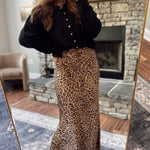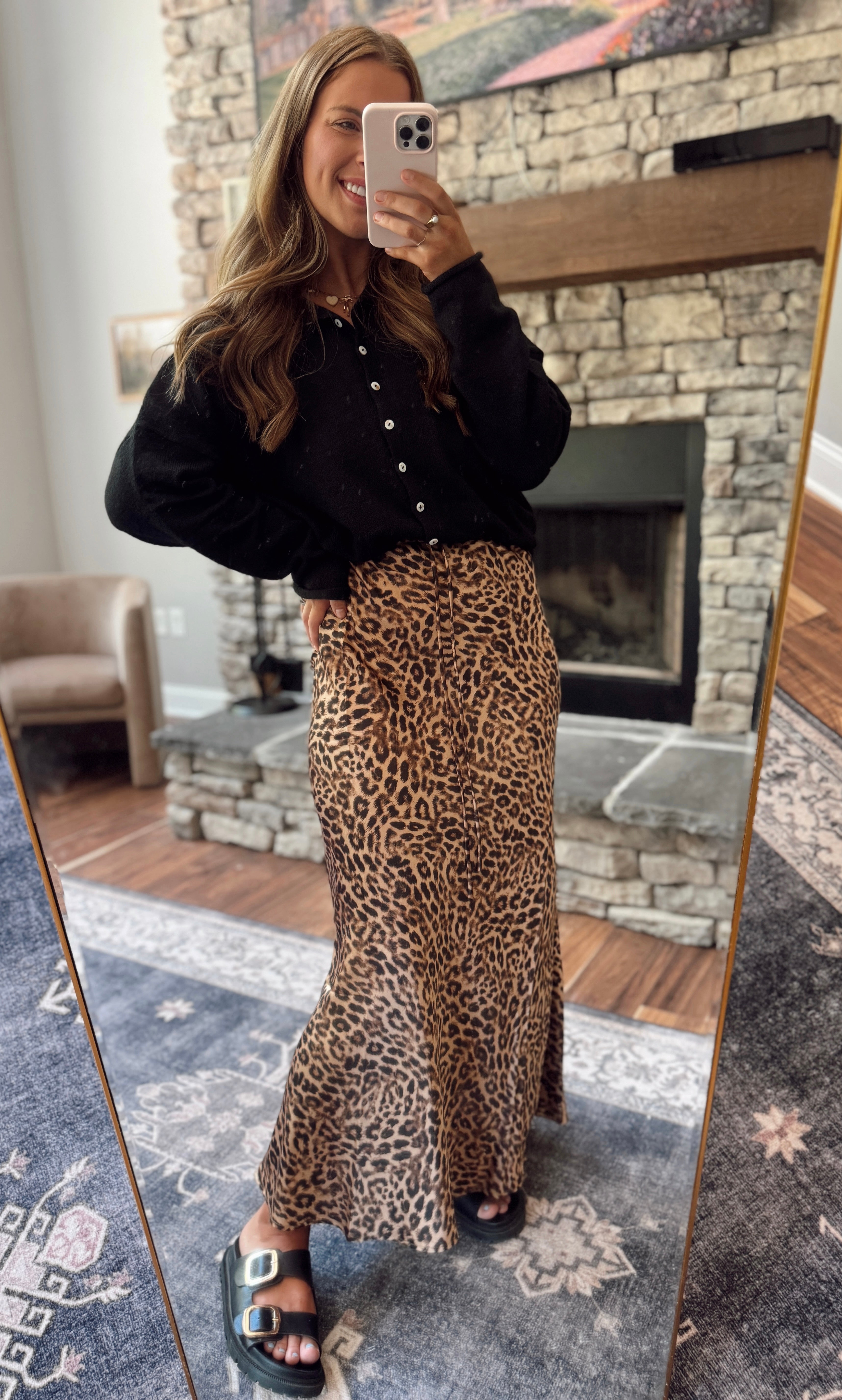 This satin leopard skirt hugs in all the right places with a flattering bias cut and effortless flow. Dress it up with boots or keep it casual with a tee and sneaks!