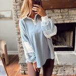 A sporty-meets-chic vibe you’ll want on repeat 🩵 This oversized pullover features a soft sky-blue body with contrasting striped sleeves and a crisp white collar. The relaxed fit and drop shoulders make it perfect for tossing on with leggings, denim, or even layered over bike shorts for an effortless look.