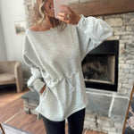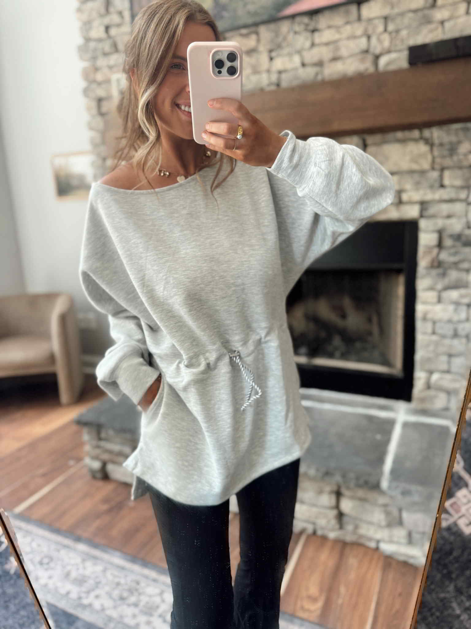 Oversized and meant to be - can size down if in between! Obsessed with this neckline!