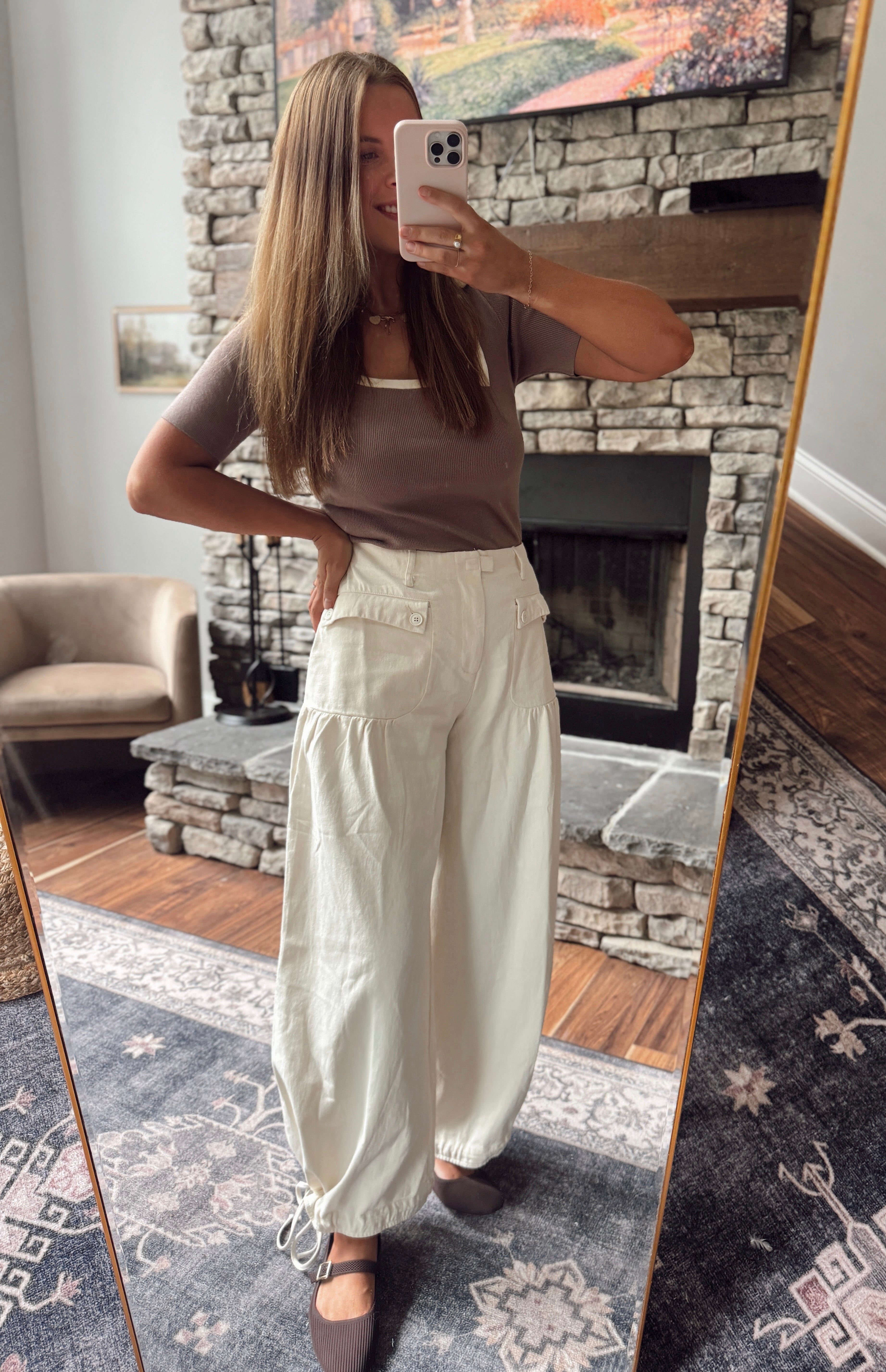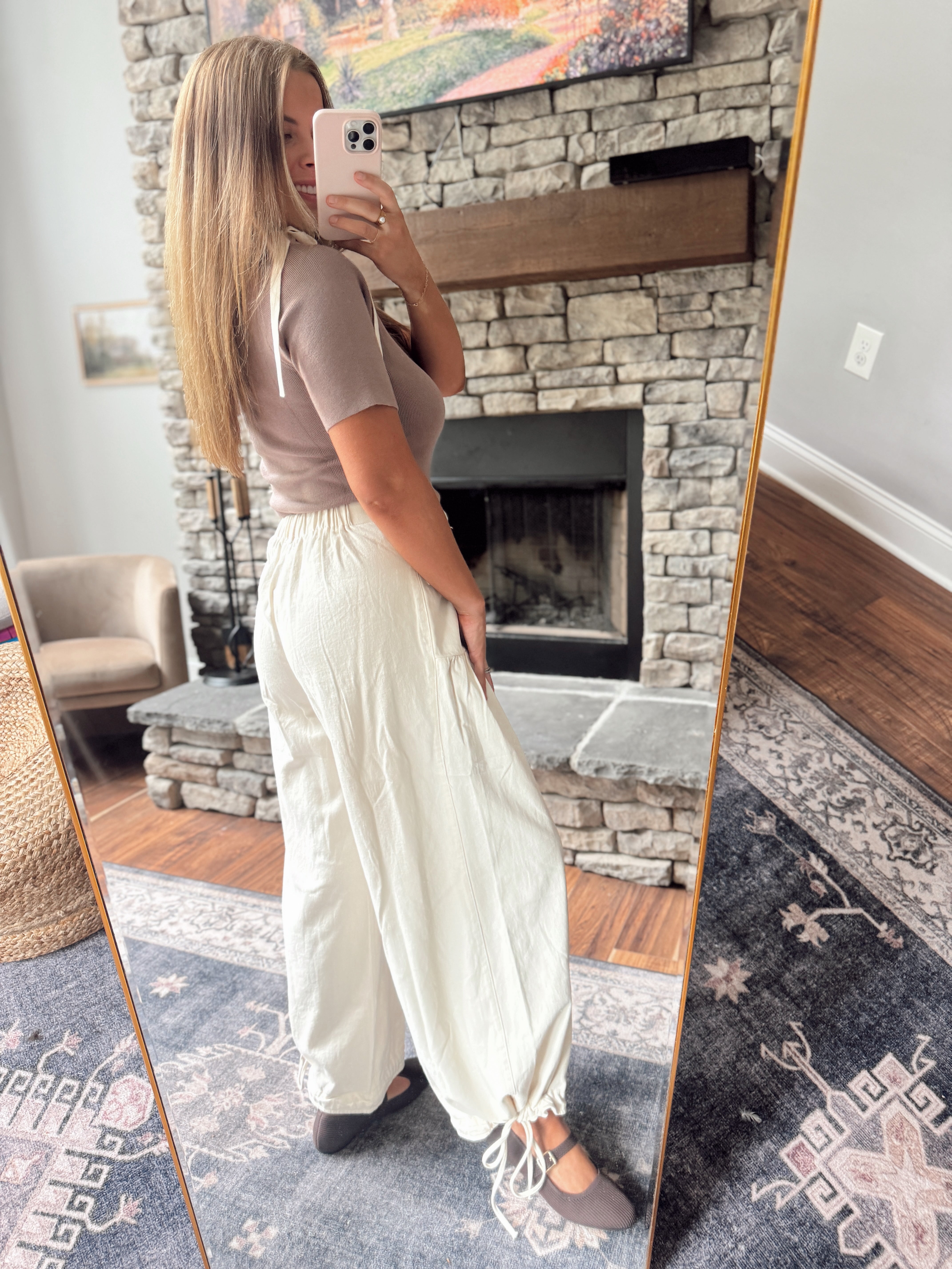 Adjustable bottom so cinch it or open it! Oversized - can size down! I love the fit of these! Elastic back waist too which is nice!