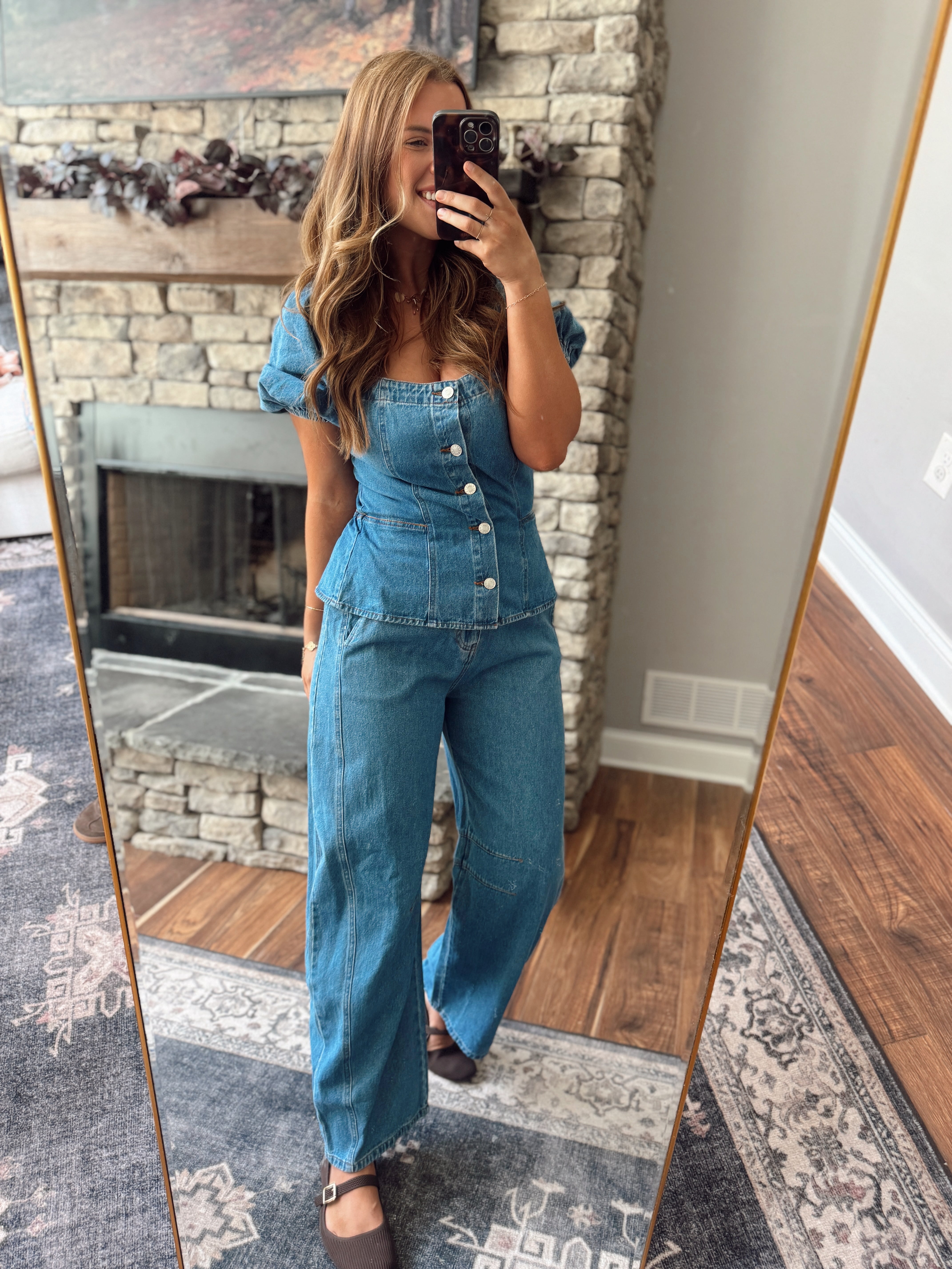 Denim Puff Sleeve Semi Barrel Jumpsuit