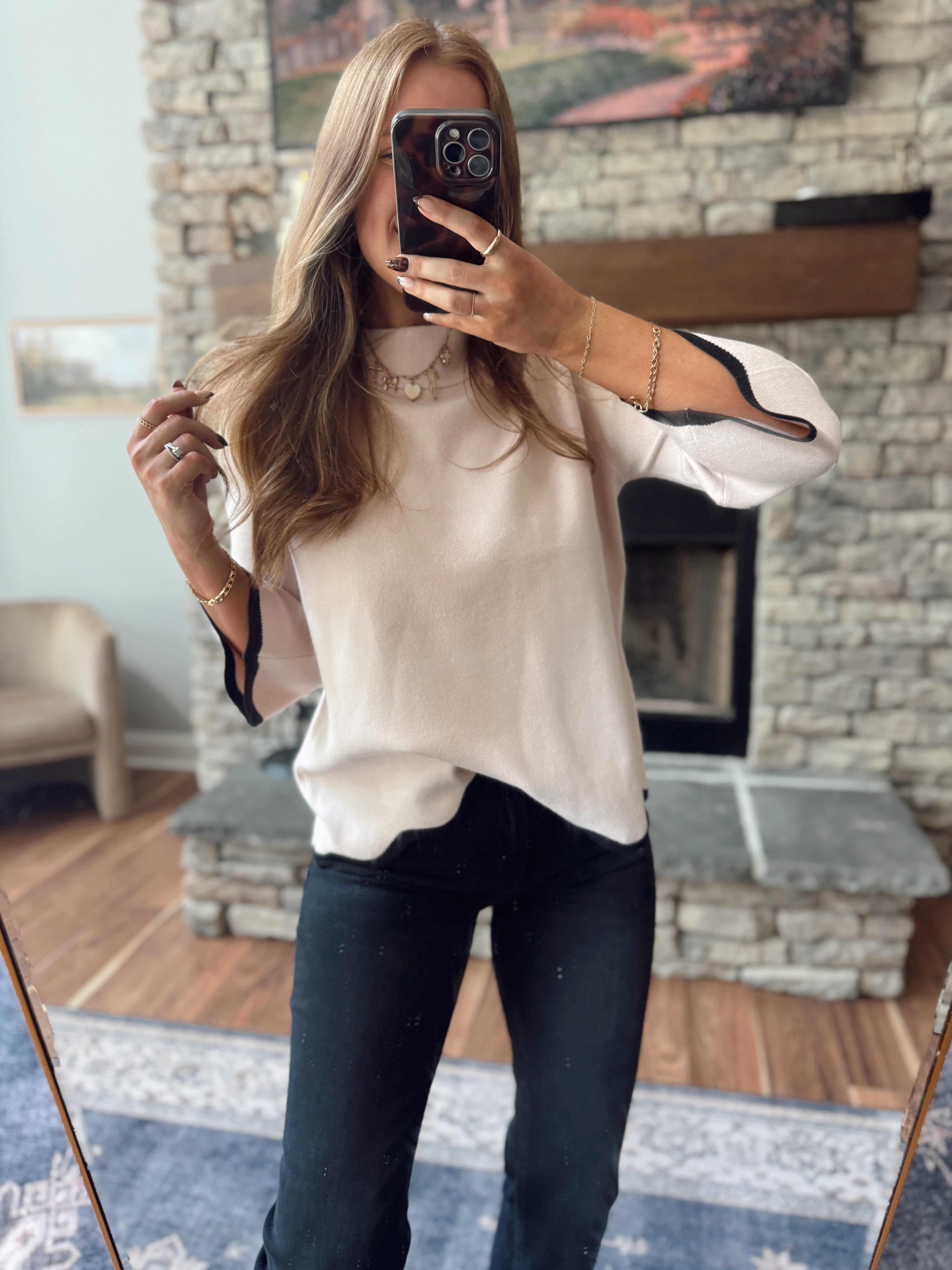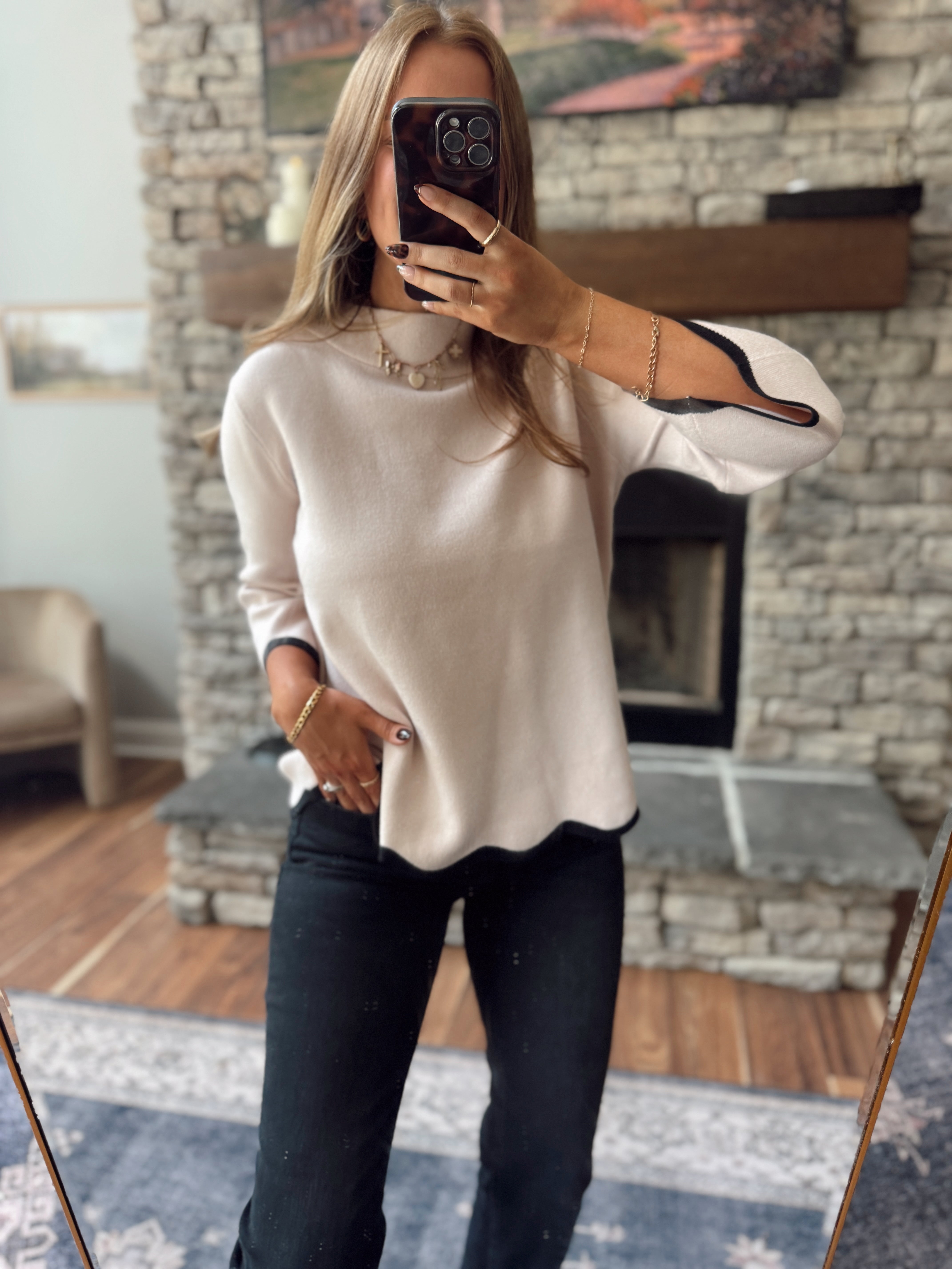 Blush/Black Scallop Edge Detail Mock Neck Sweater