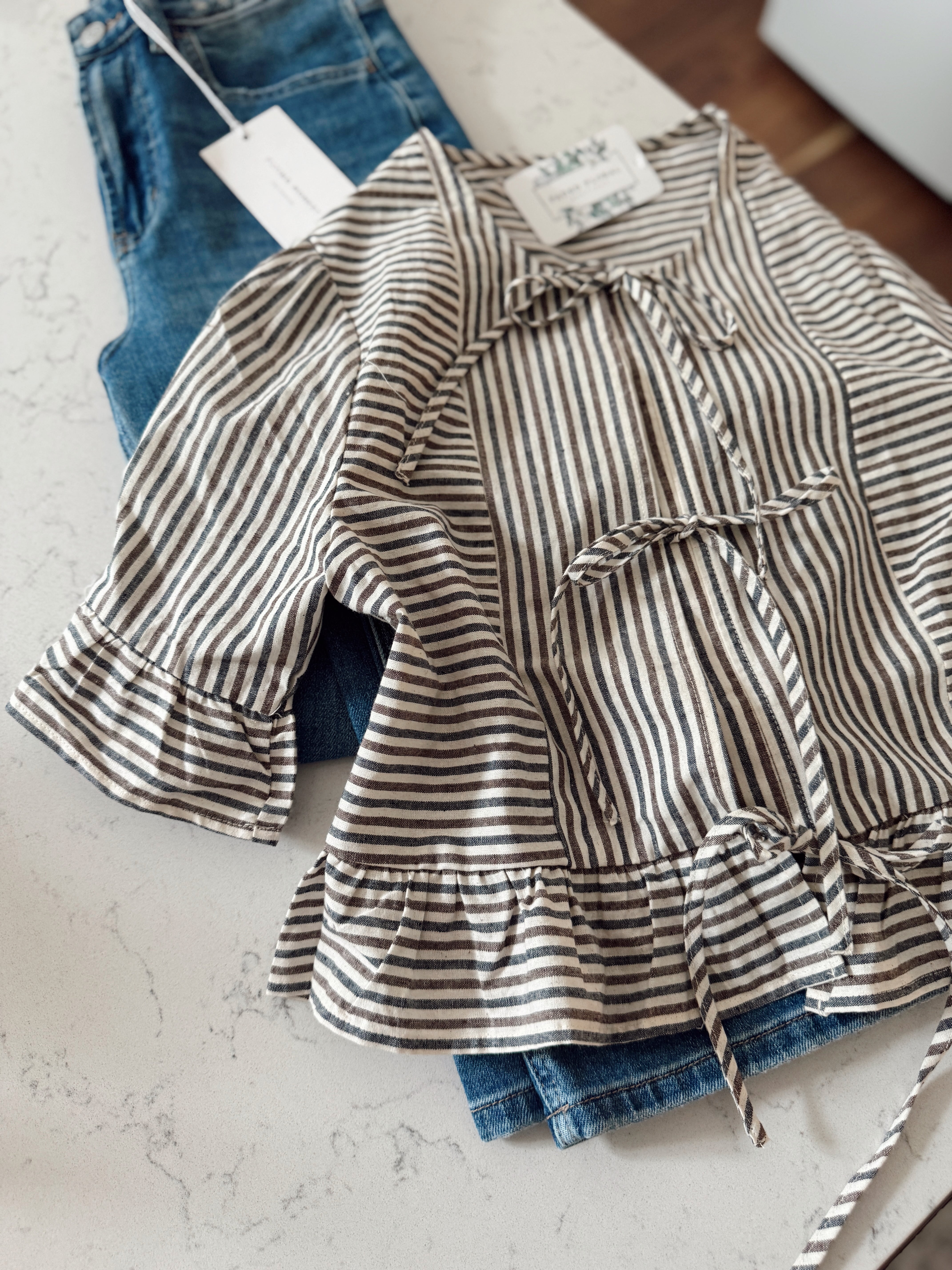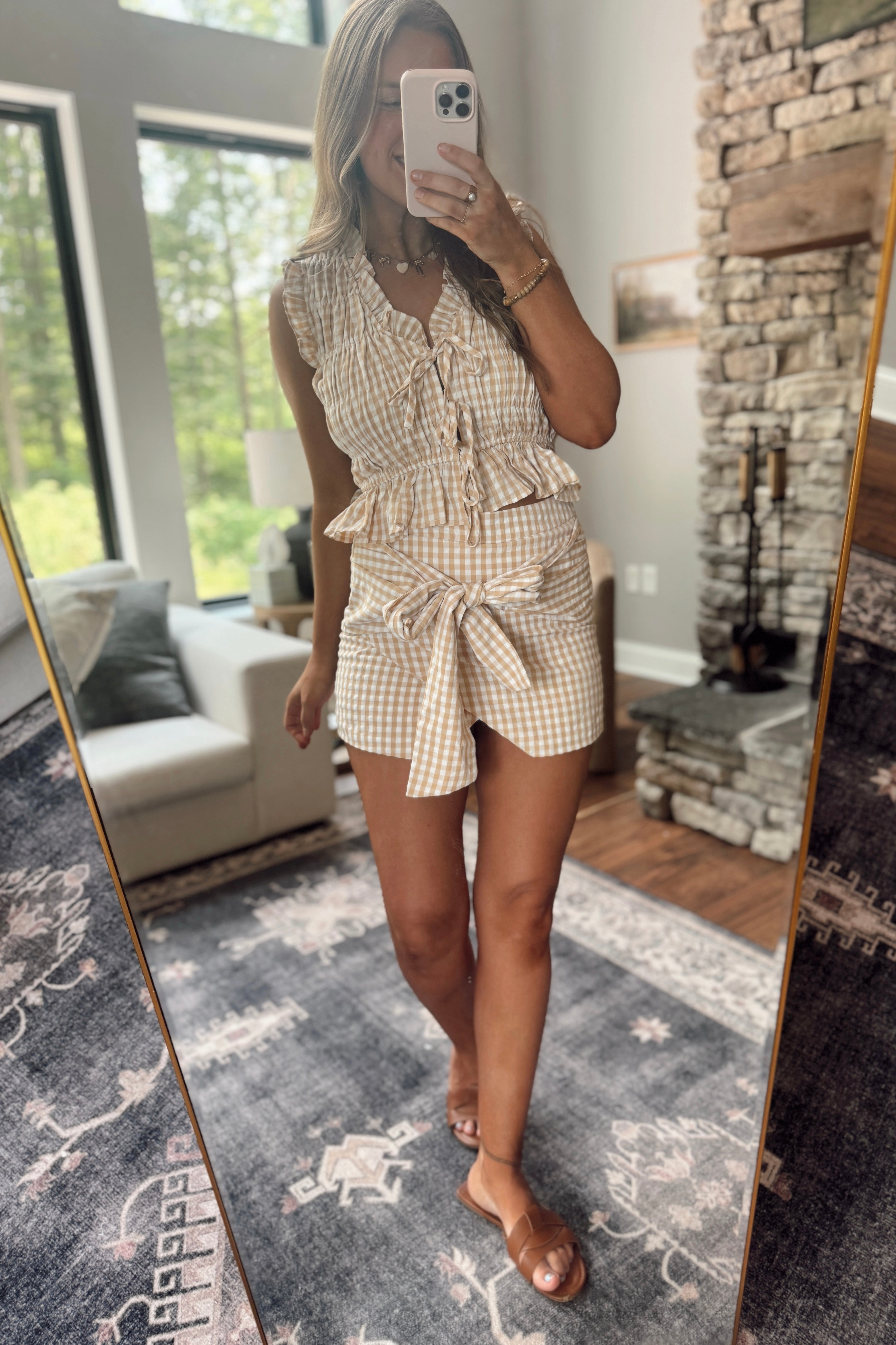 Toby Taupe Gingham Tie Front Sleeveless Top