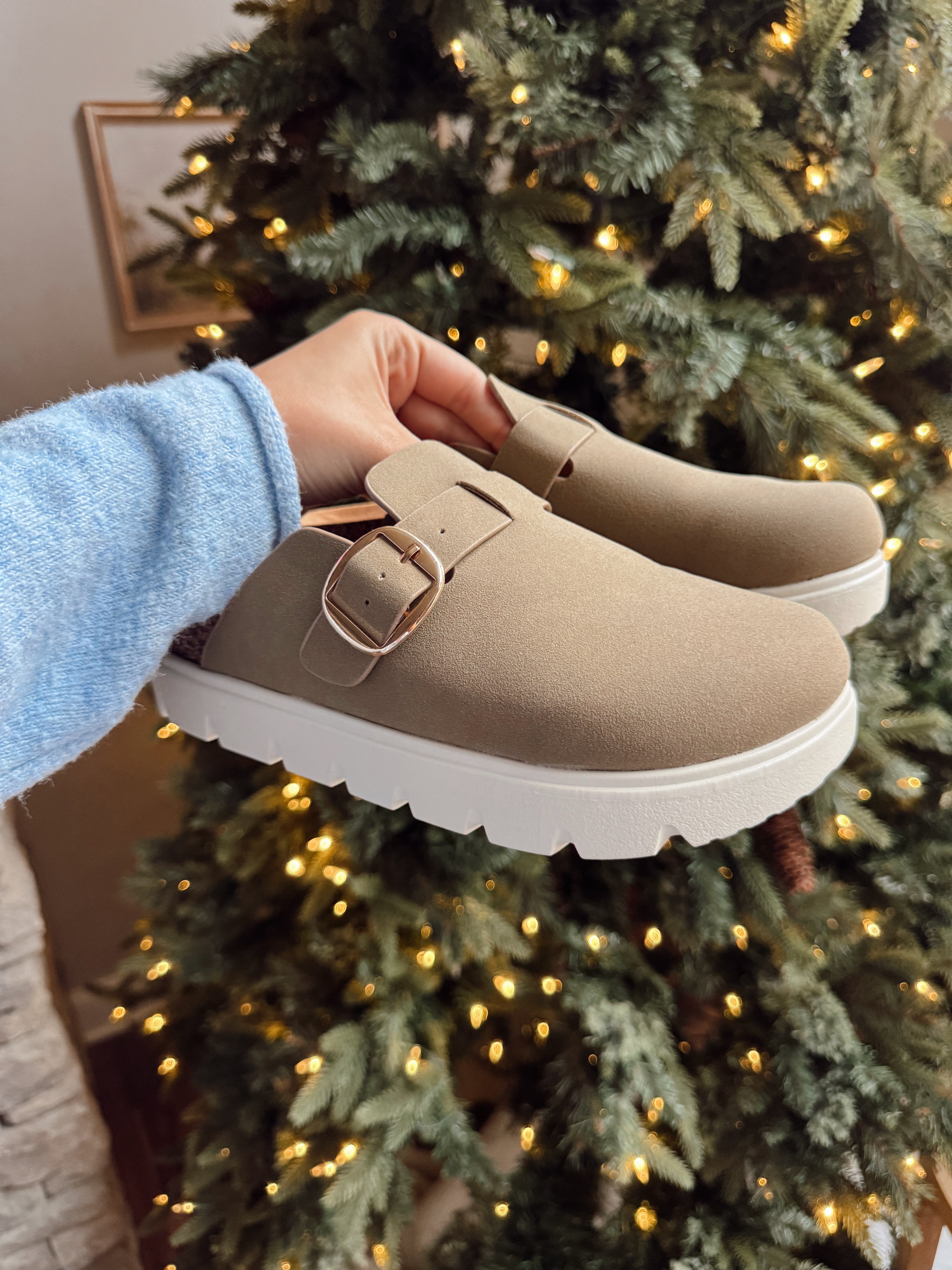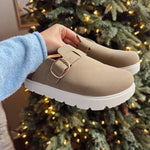 Your new off-duty favorite has arrived ✨ These clog-style slides bring cozy comfort with a modern twist — featuring a soft faux suede upper, gold buckle detail, and chunky white sole. Perfect for pairing with loungewear or jeans for a laid-back, effortless vibe.