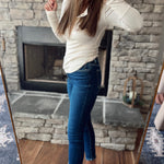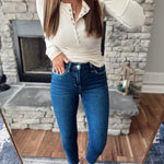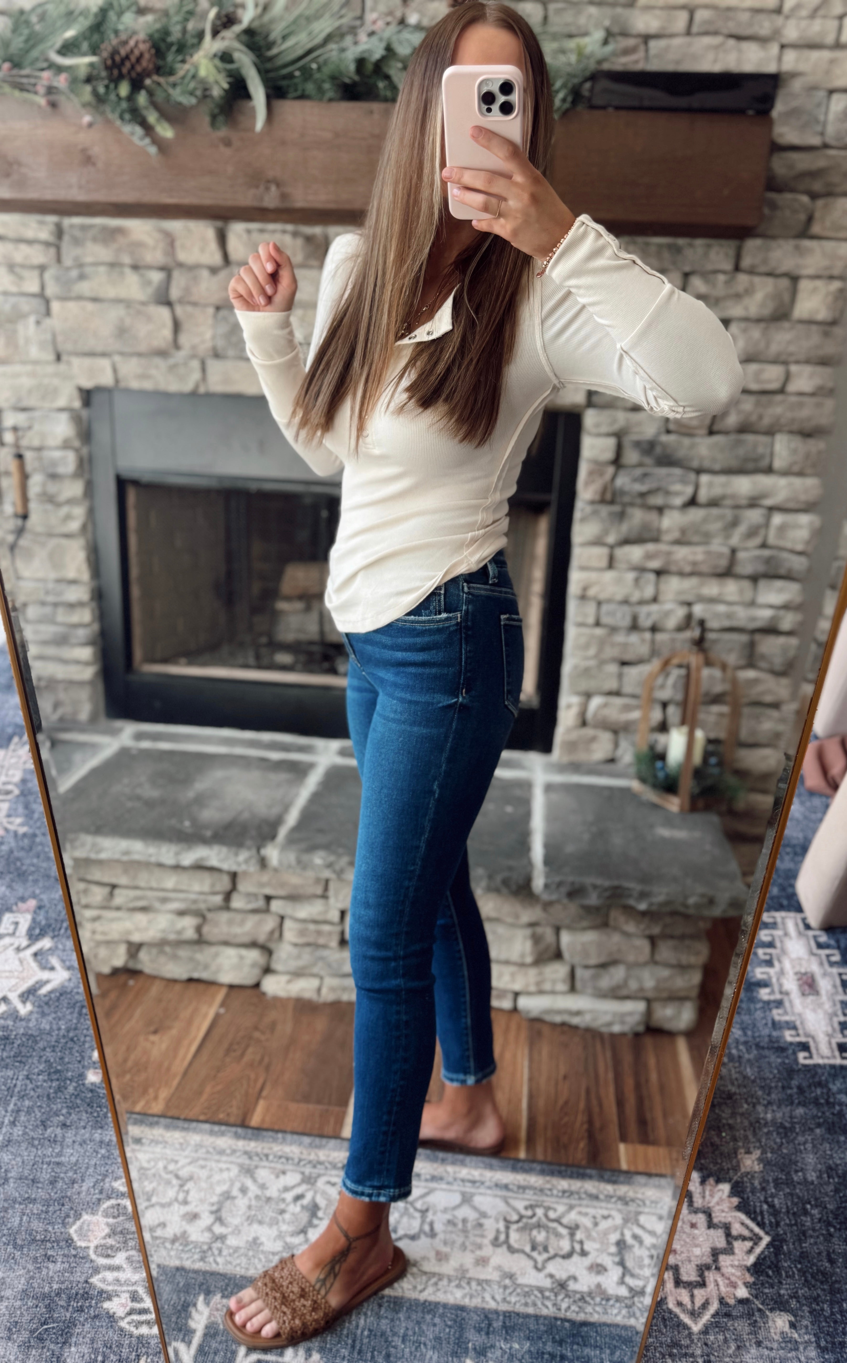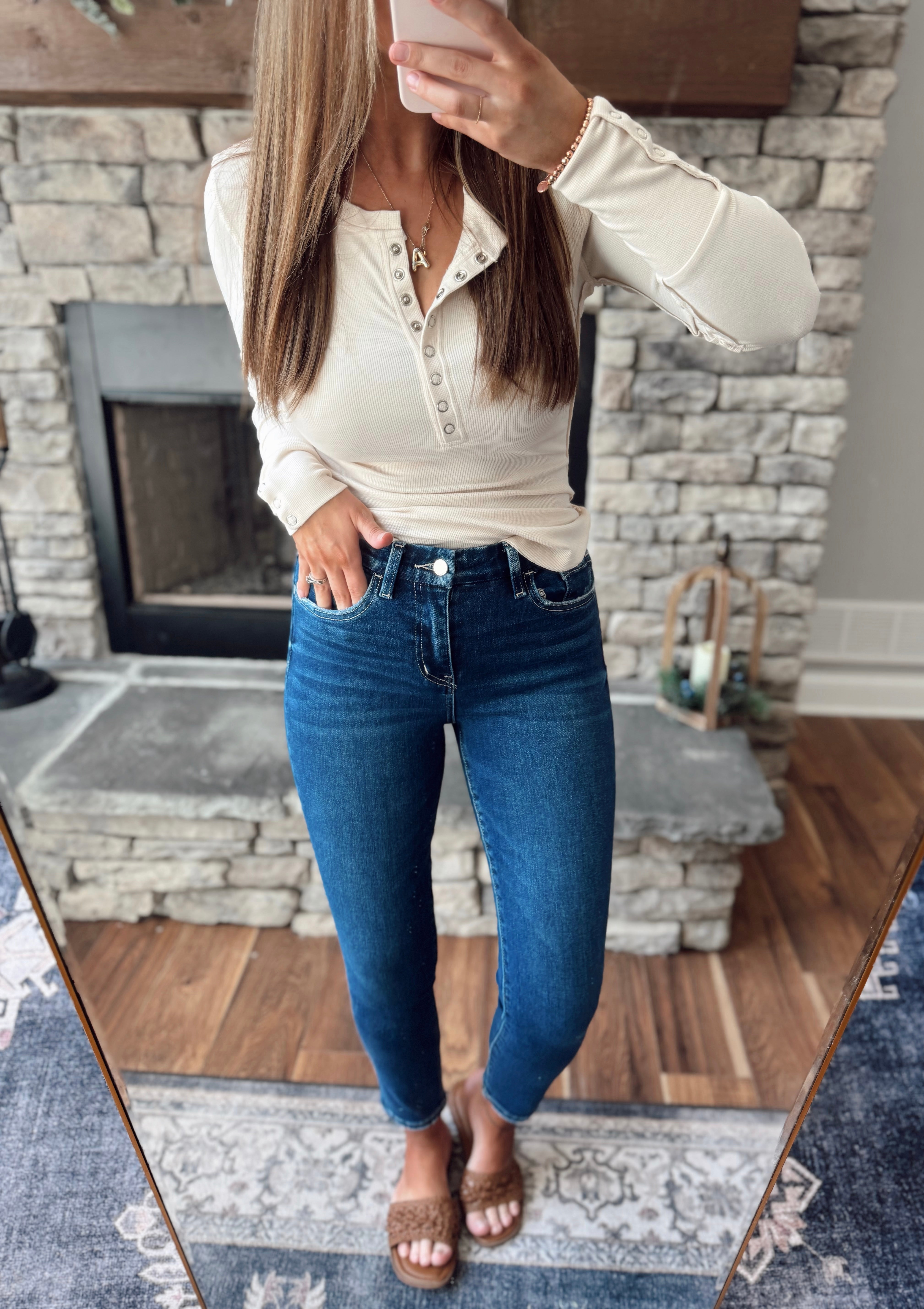 Comfort stretch denim, high rise waist, cropped length, skinny jeans