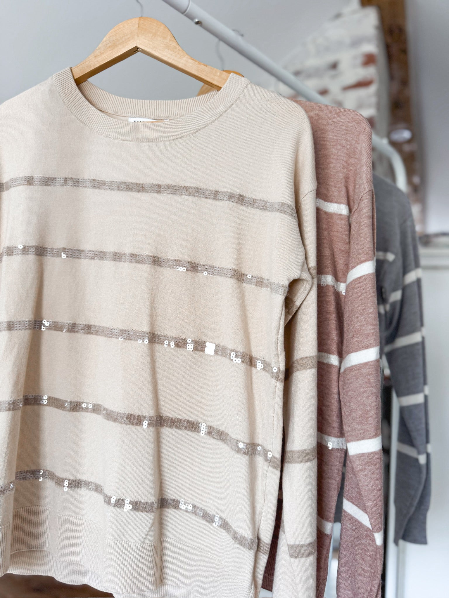 Frosted Oatmeal Beaded Stripe Crew Neck Long Sleeve IN STORE