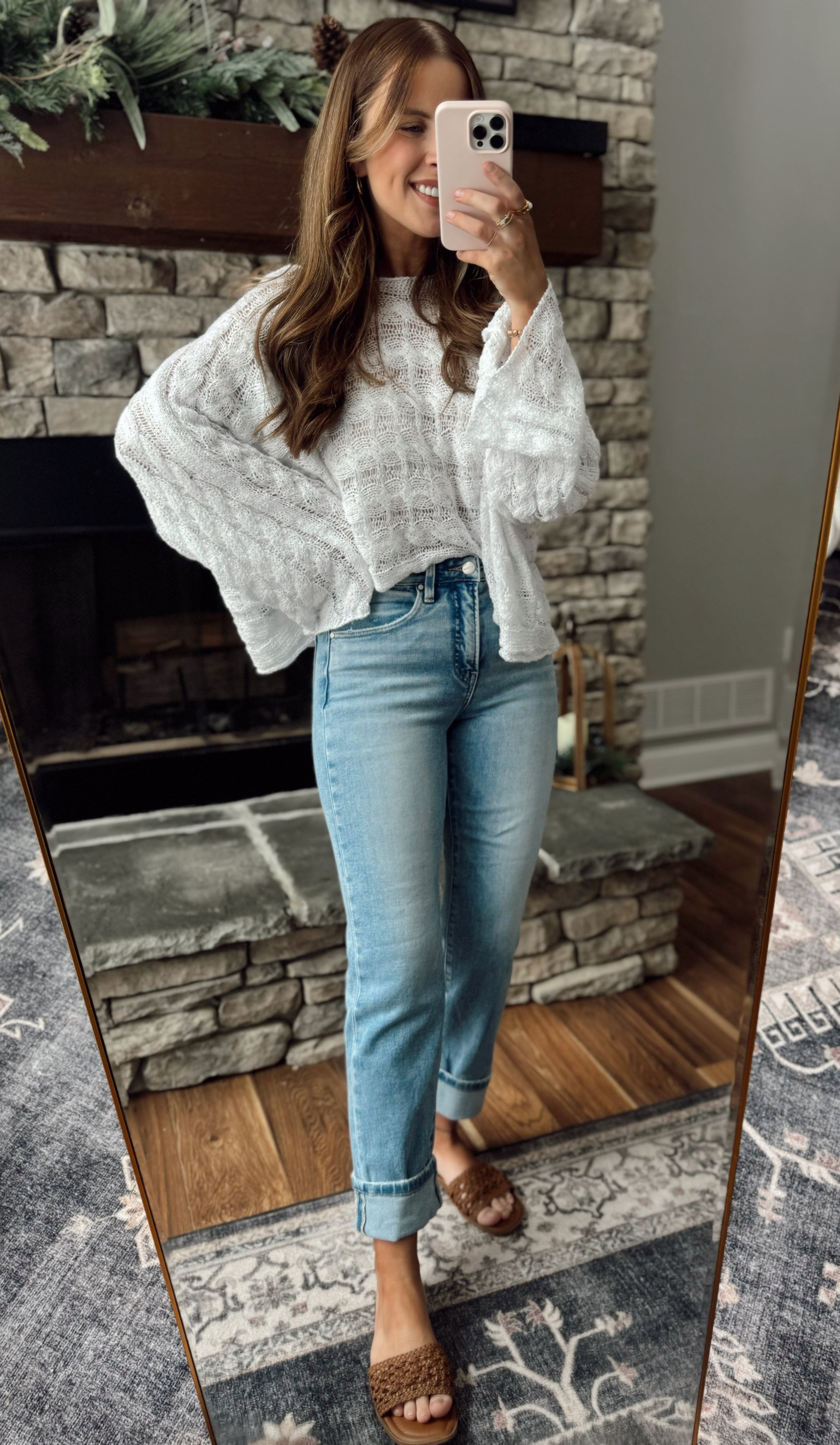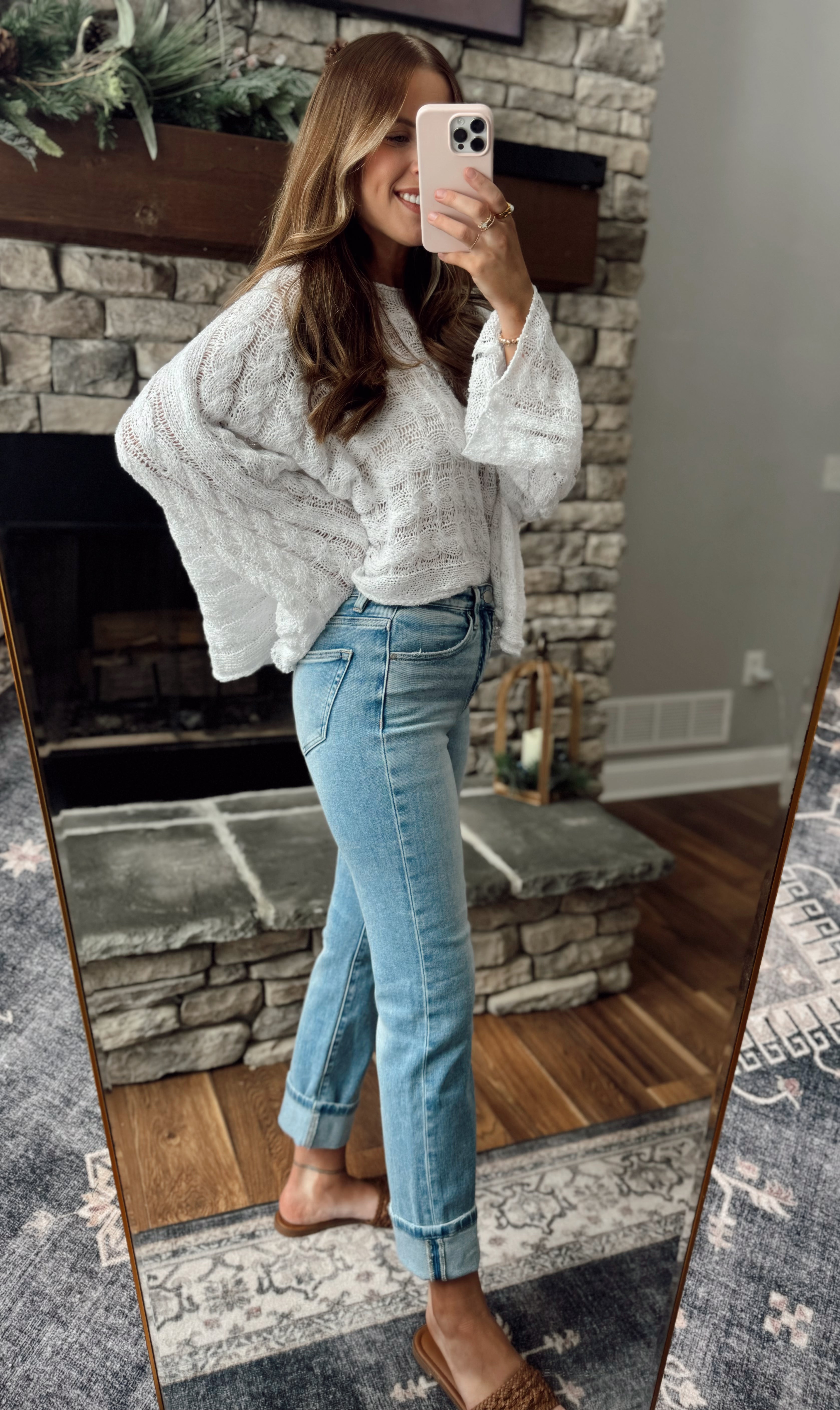 This classic, easy to style denim is the perfect addition to your wardrobe! Featuring a high rise with flattering tummy control panel, medium stone wash, straight leg, and styled with a cuff that can be unrolled for a longer inseam.
