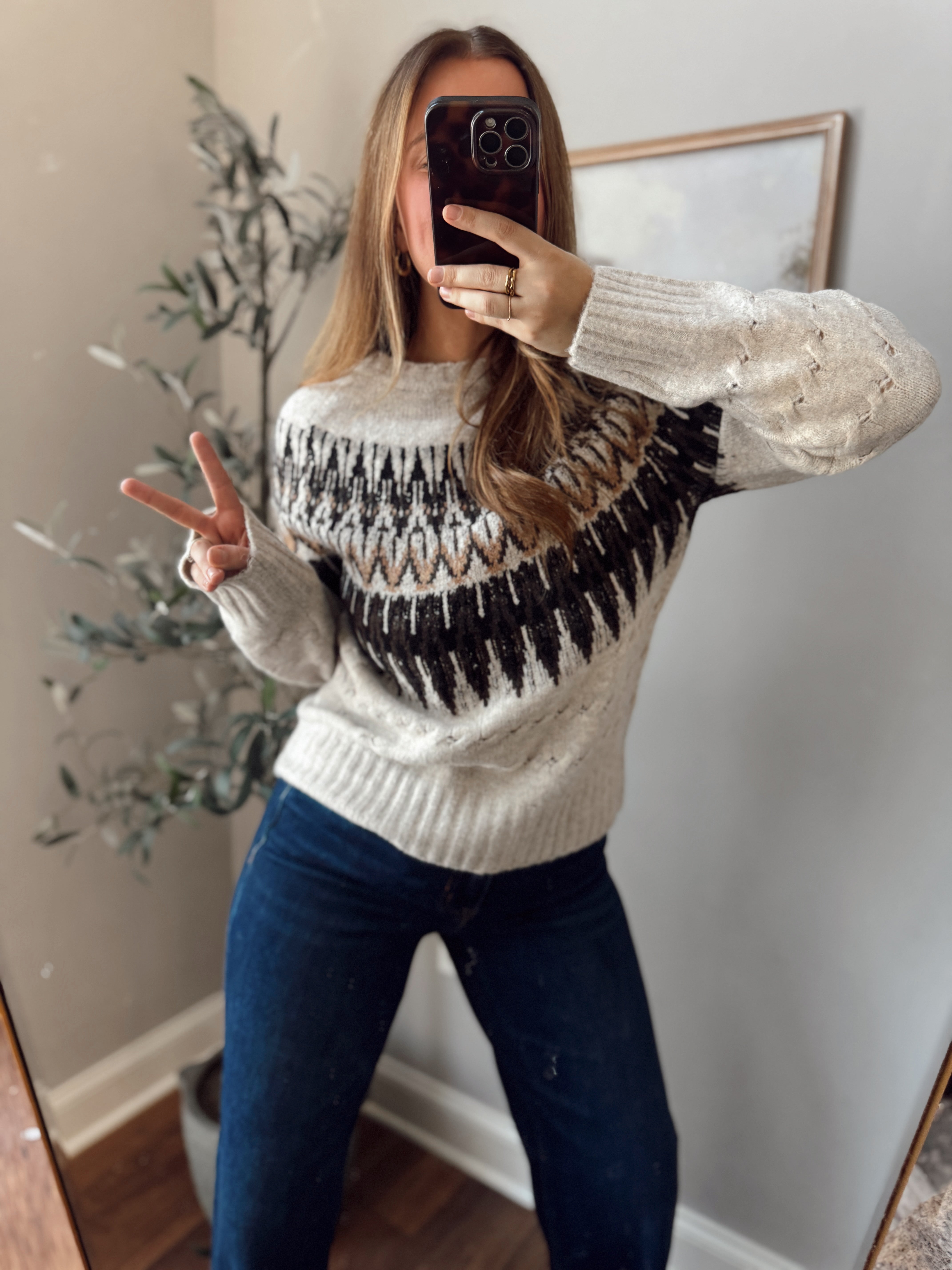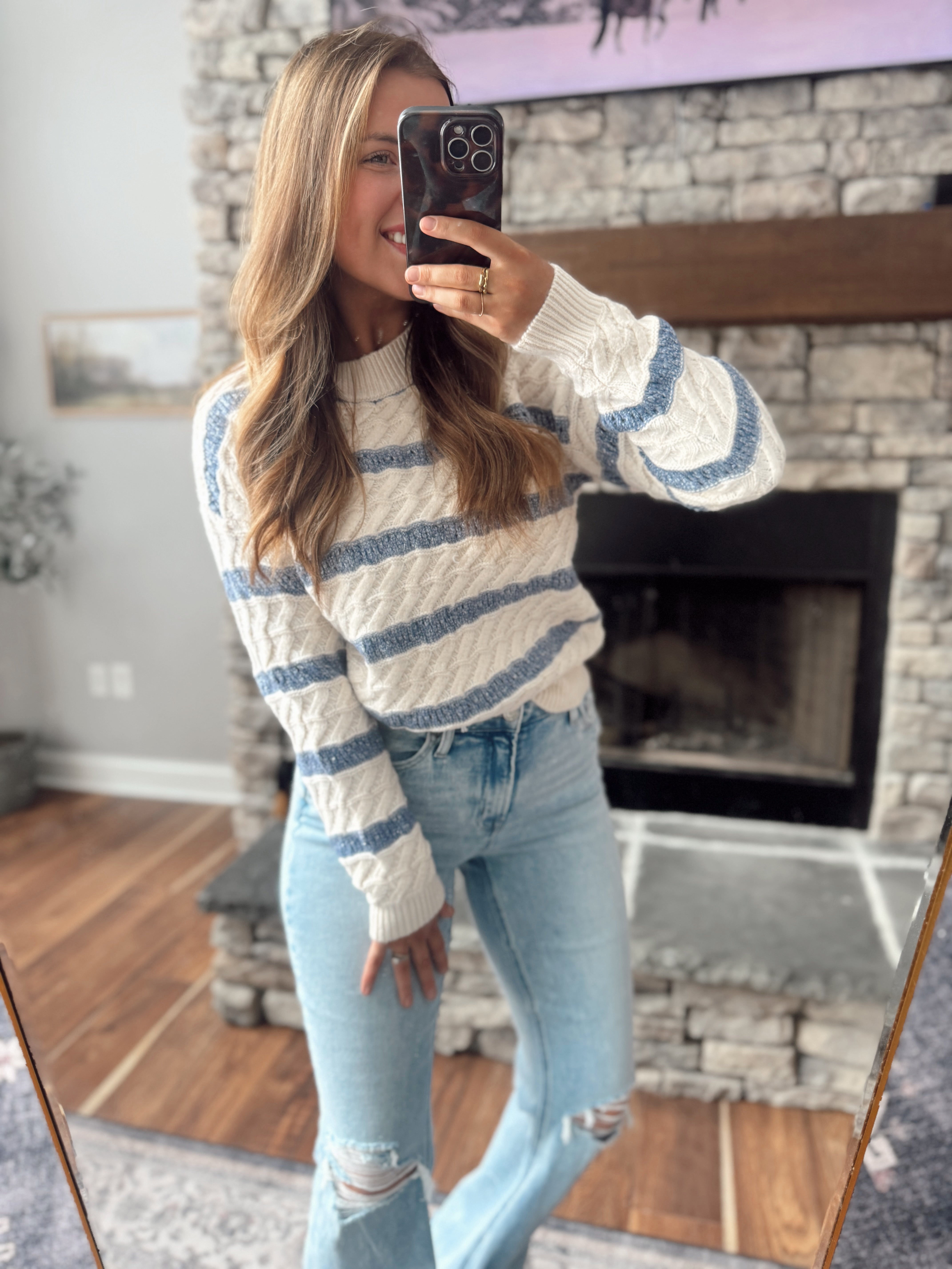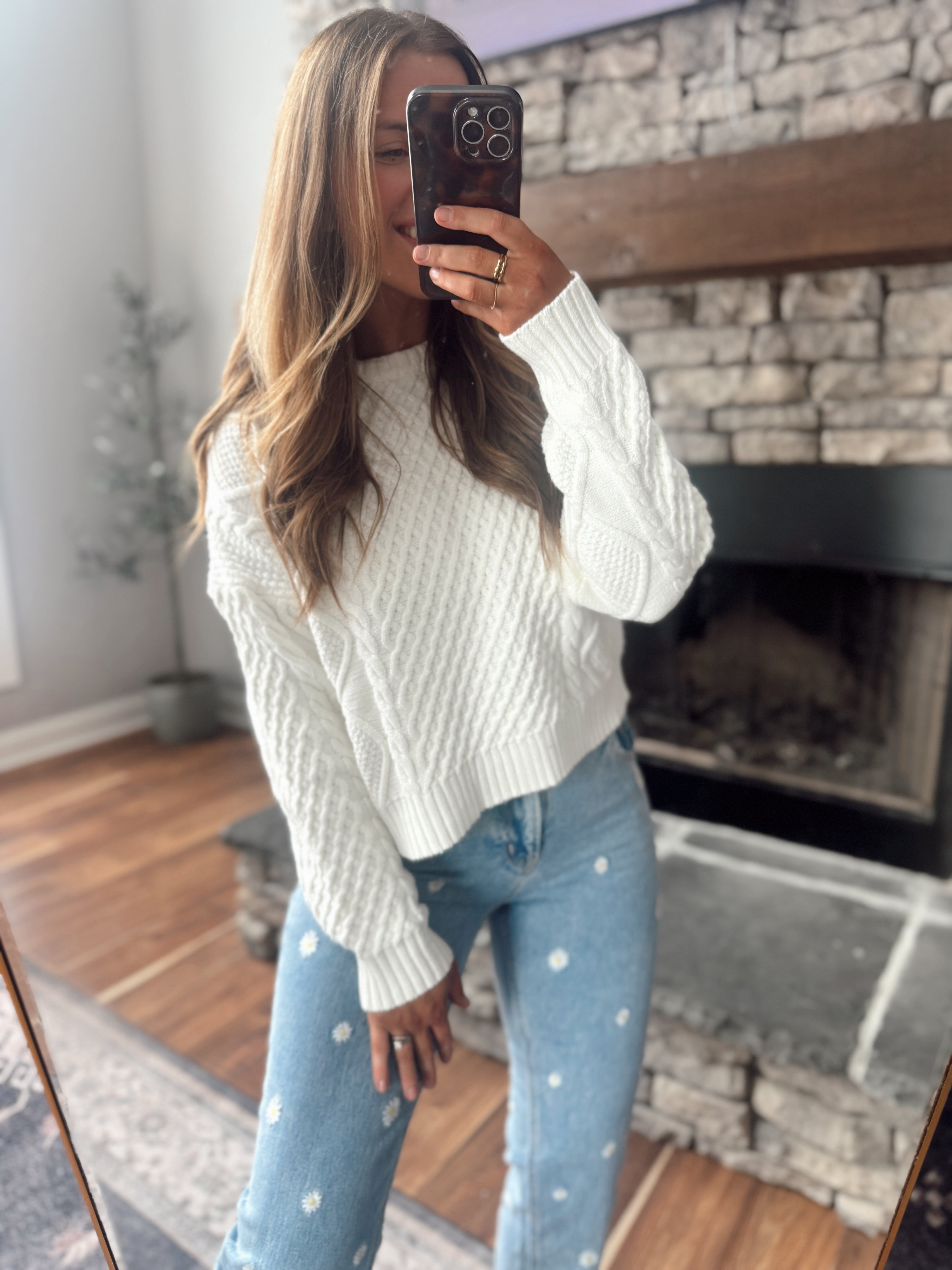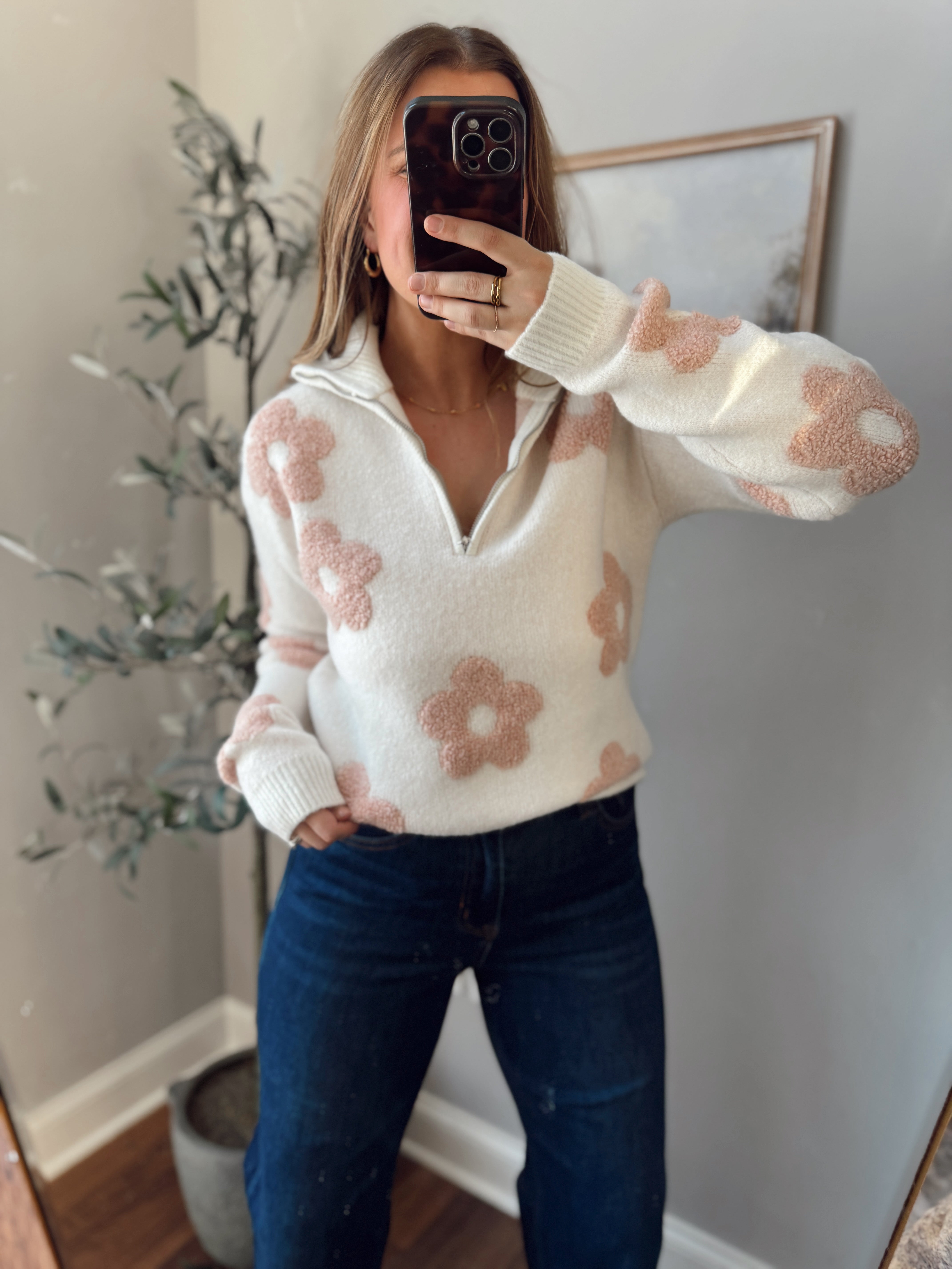 Cream Lilac Exposed Seam Flower Pattern Knit 3/4 Sleeve