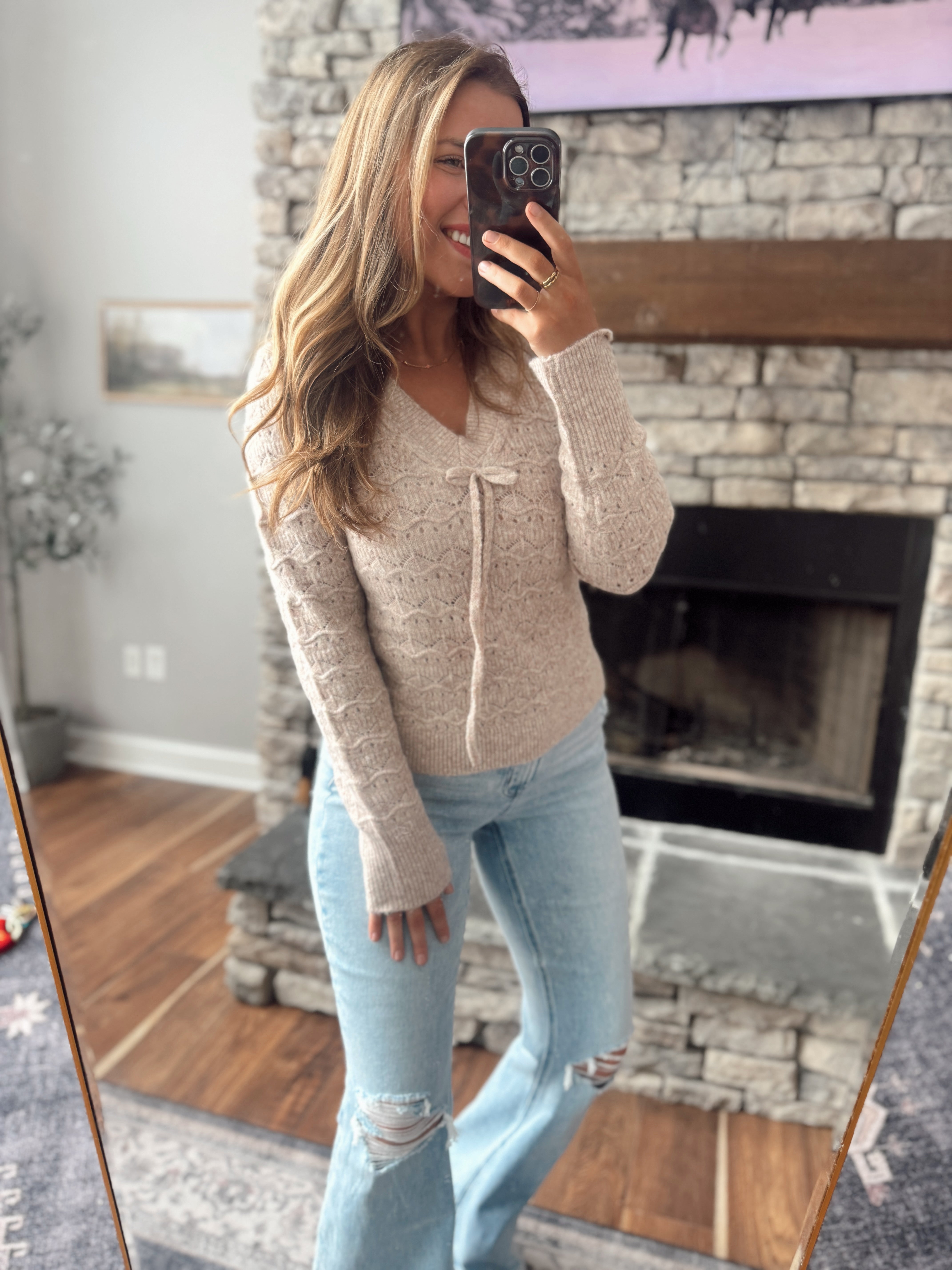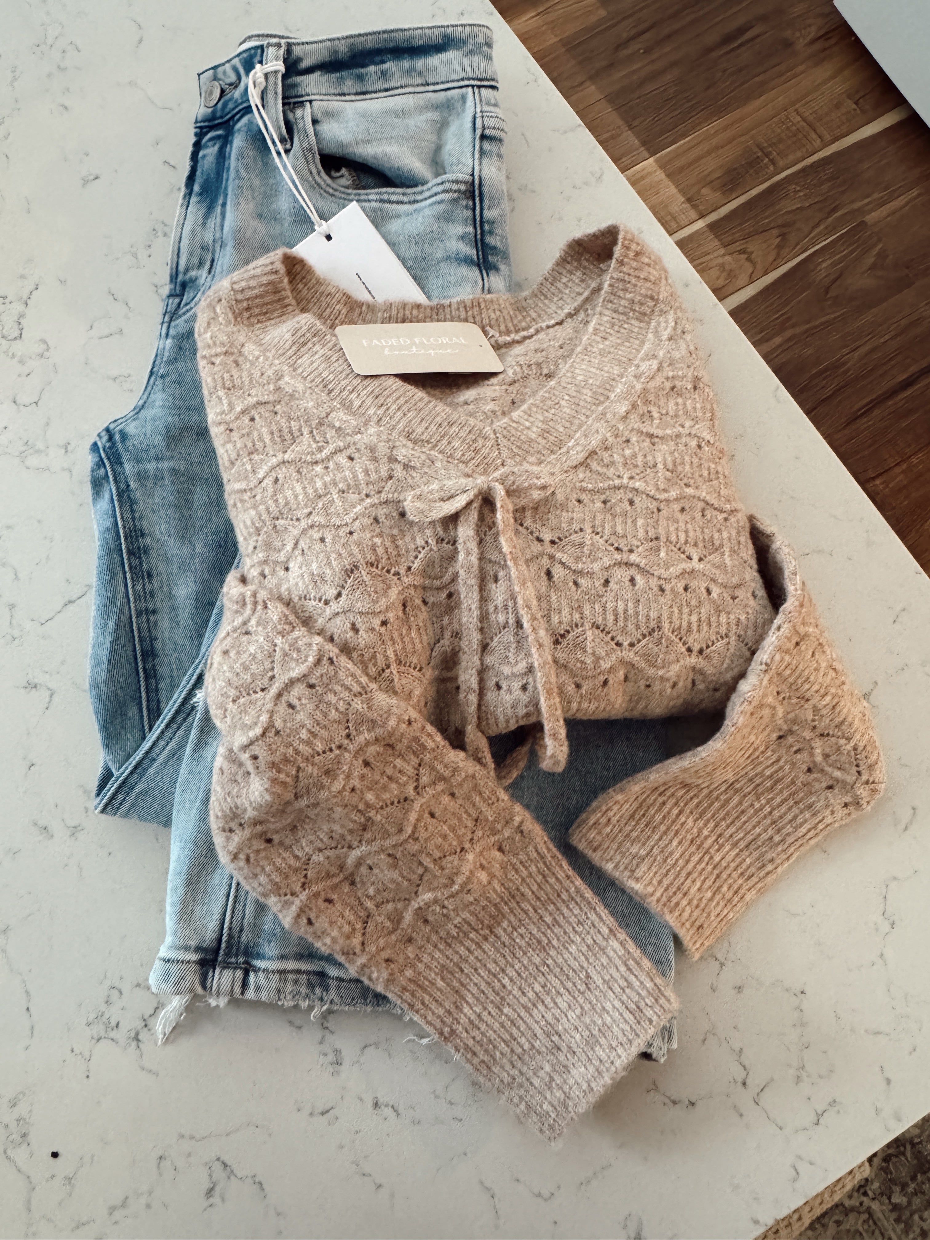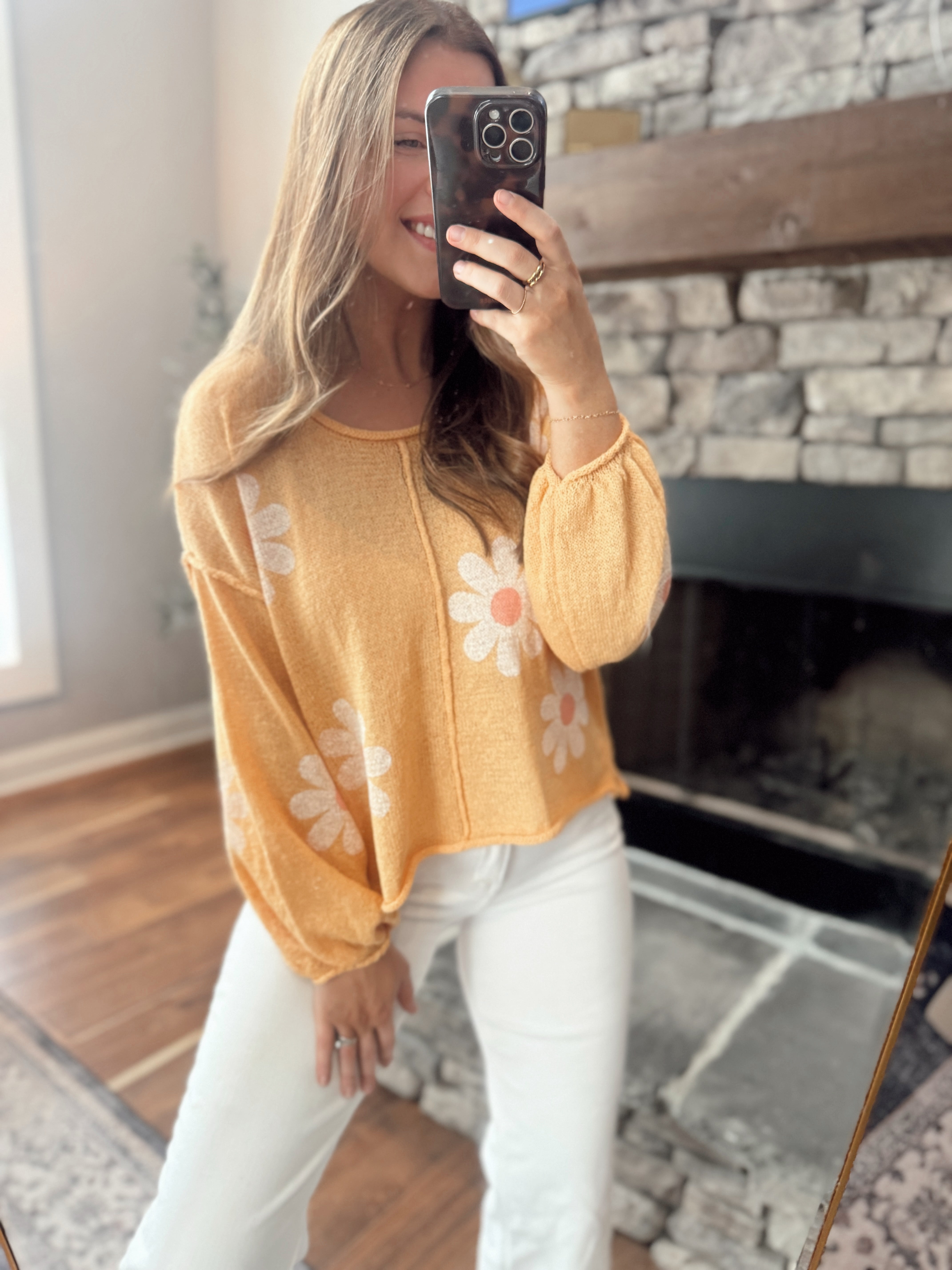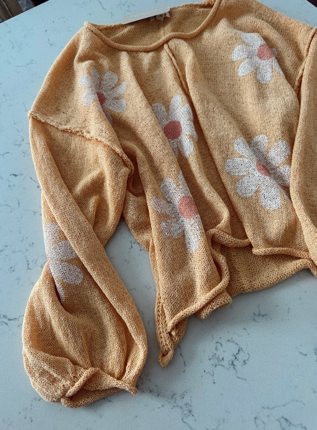 Apricot Exposed Seam Flower Pattern Knit 3/4 Sleeve