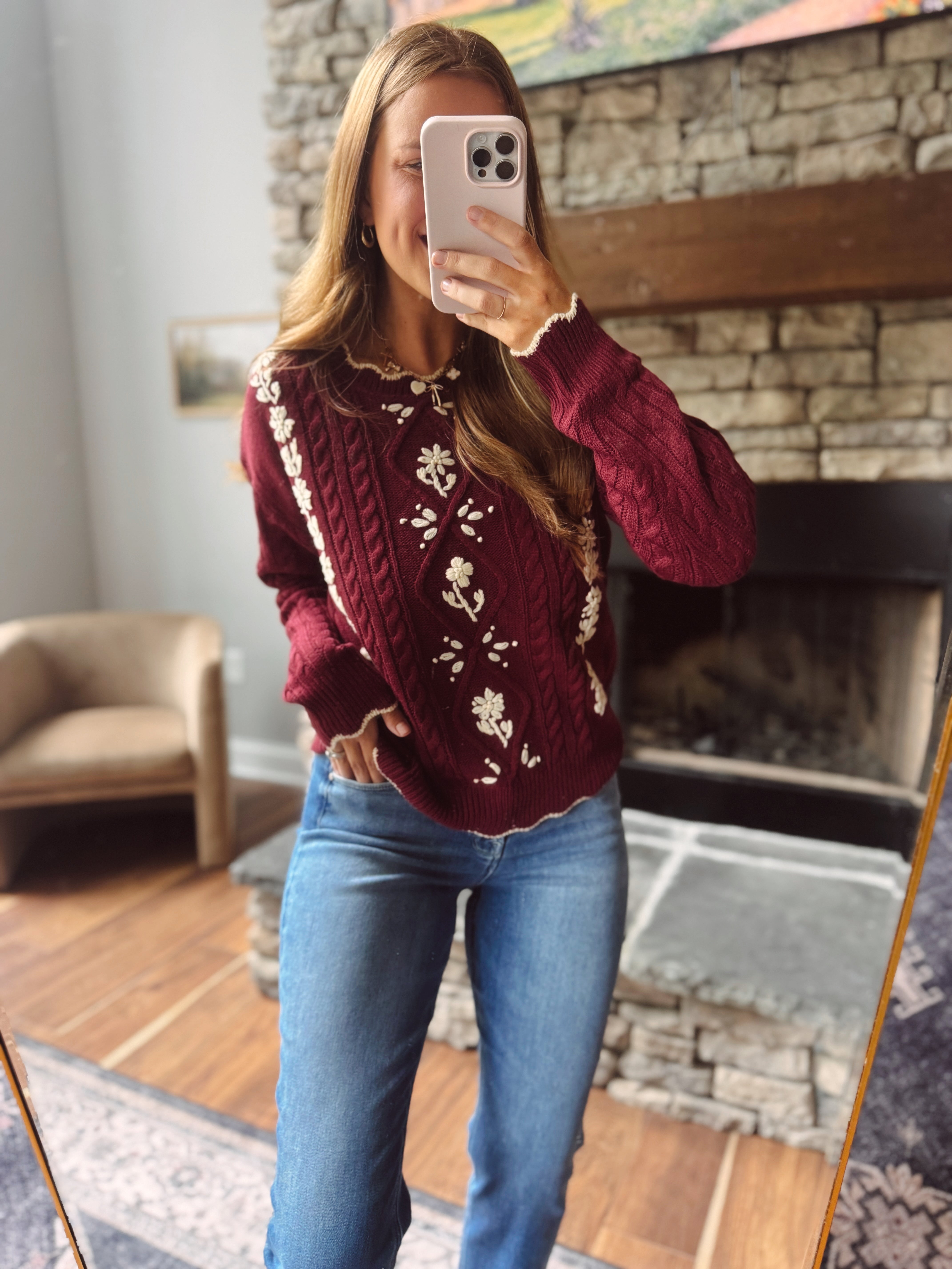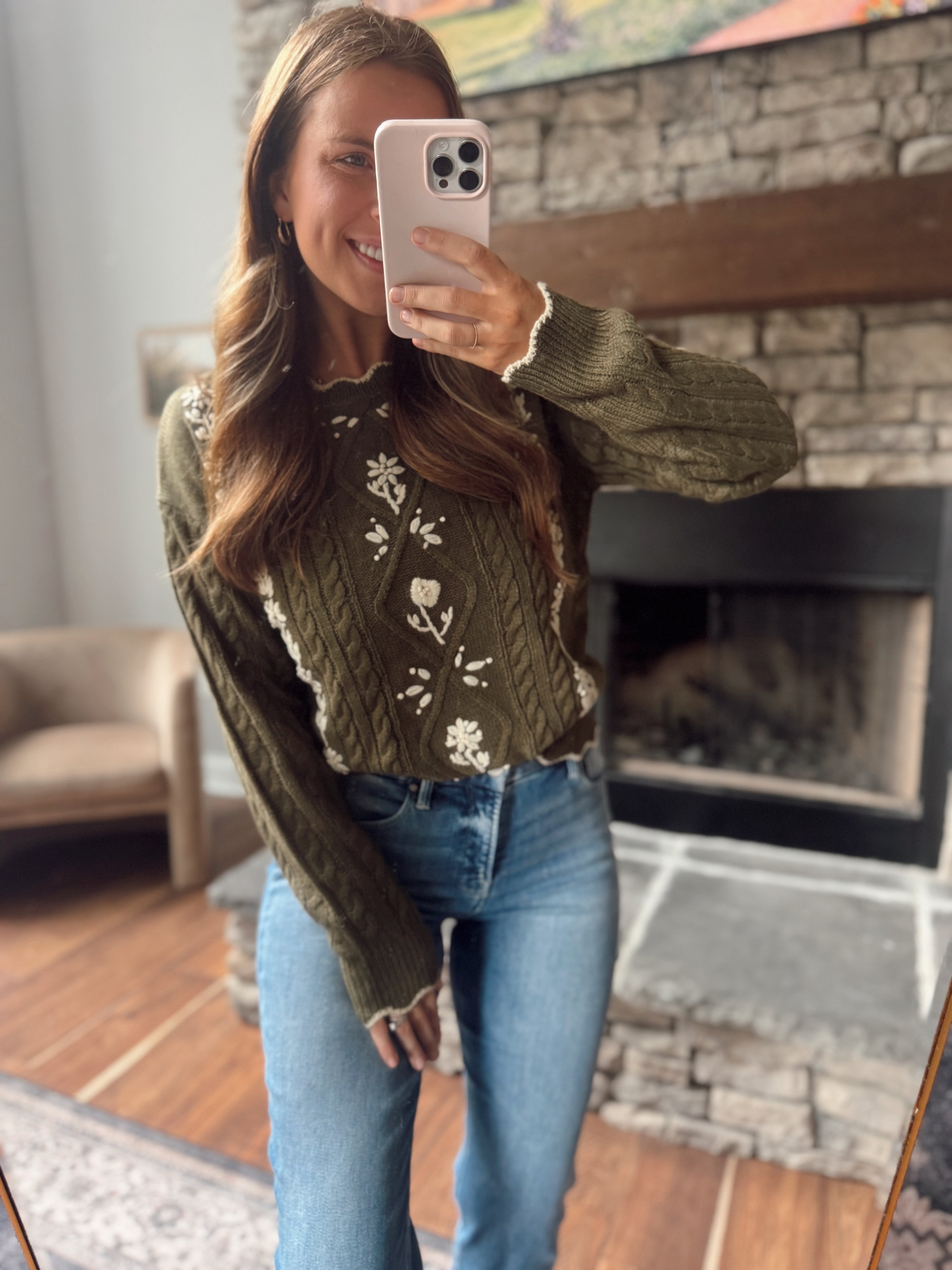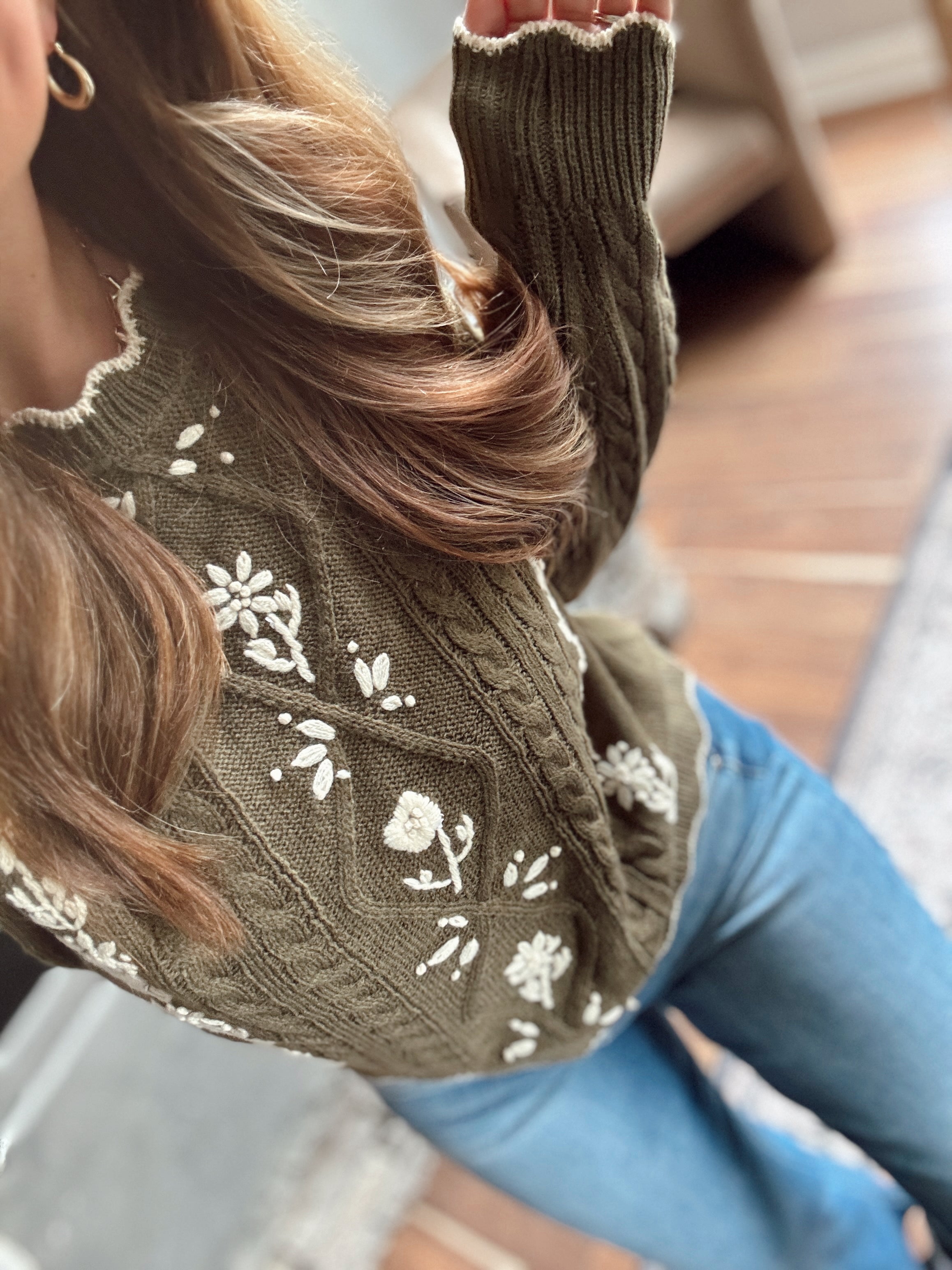 Dark Olive Floral Embroidered Cable Knit Sweater