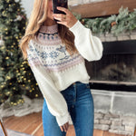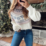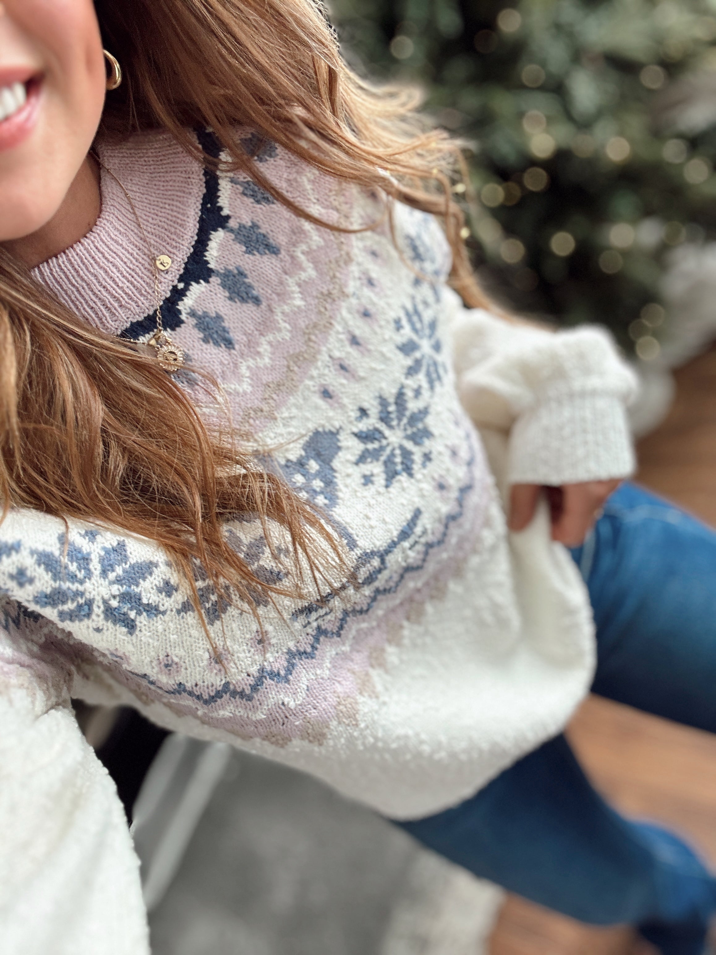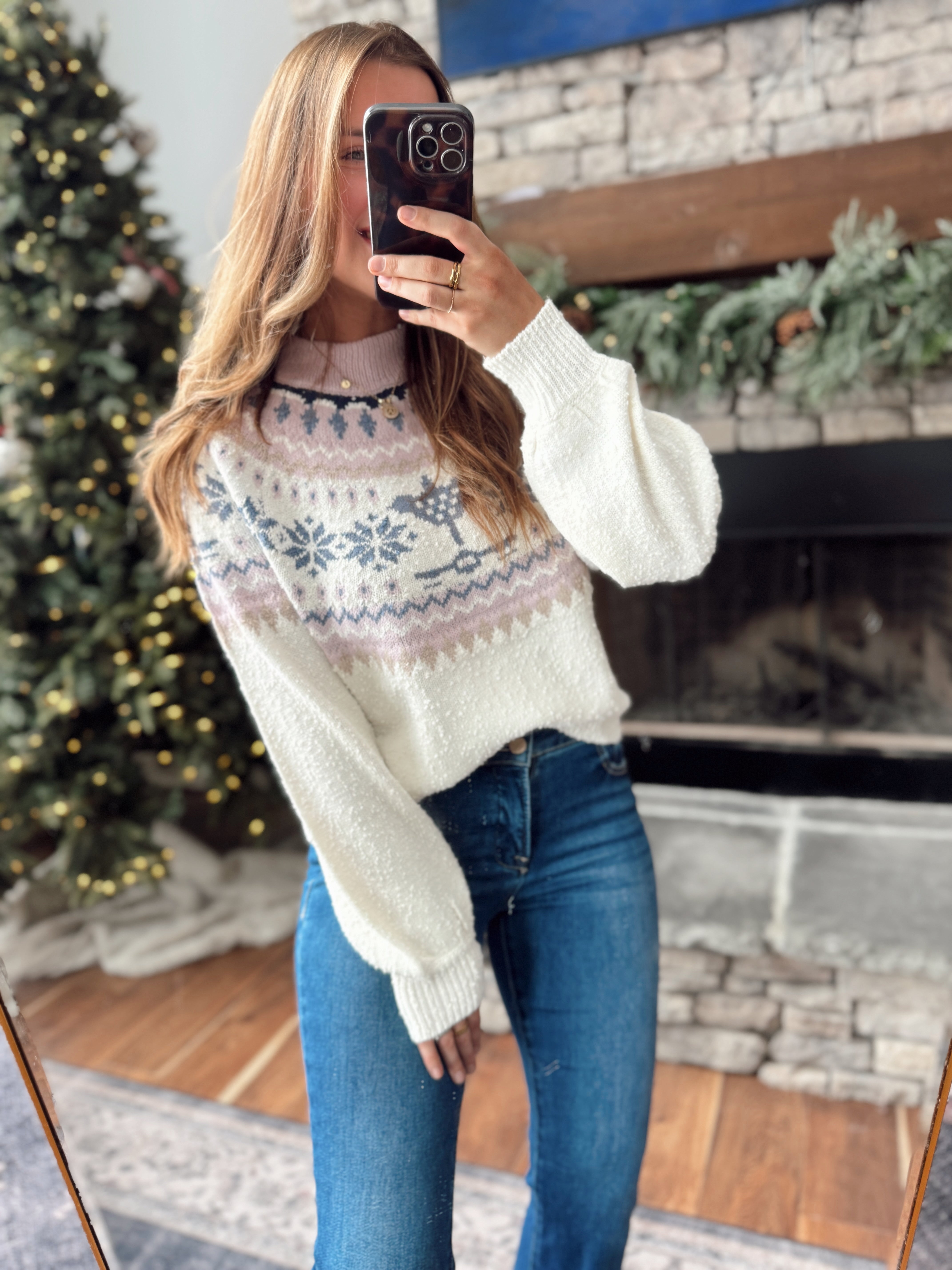 Relaxed fit + so soft! This fair isle knit brings the perfect touch of winter charm with its soft blush, ivory, and slate tones. aversge length pairs perfectly with high-rise denim for an effortless cozy look.