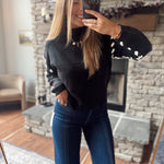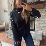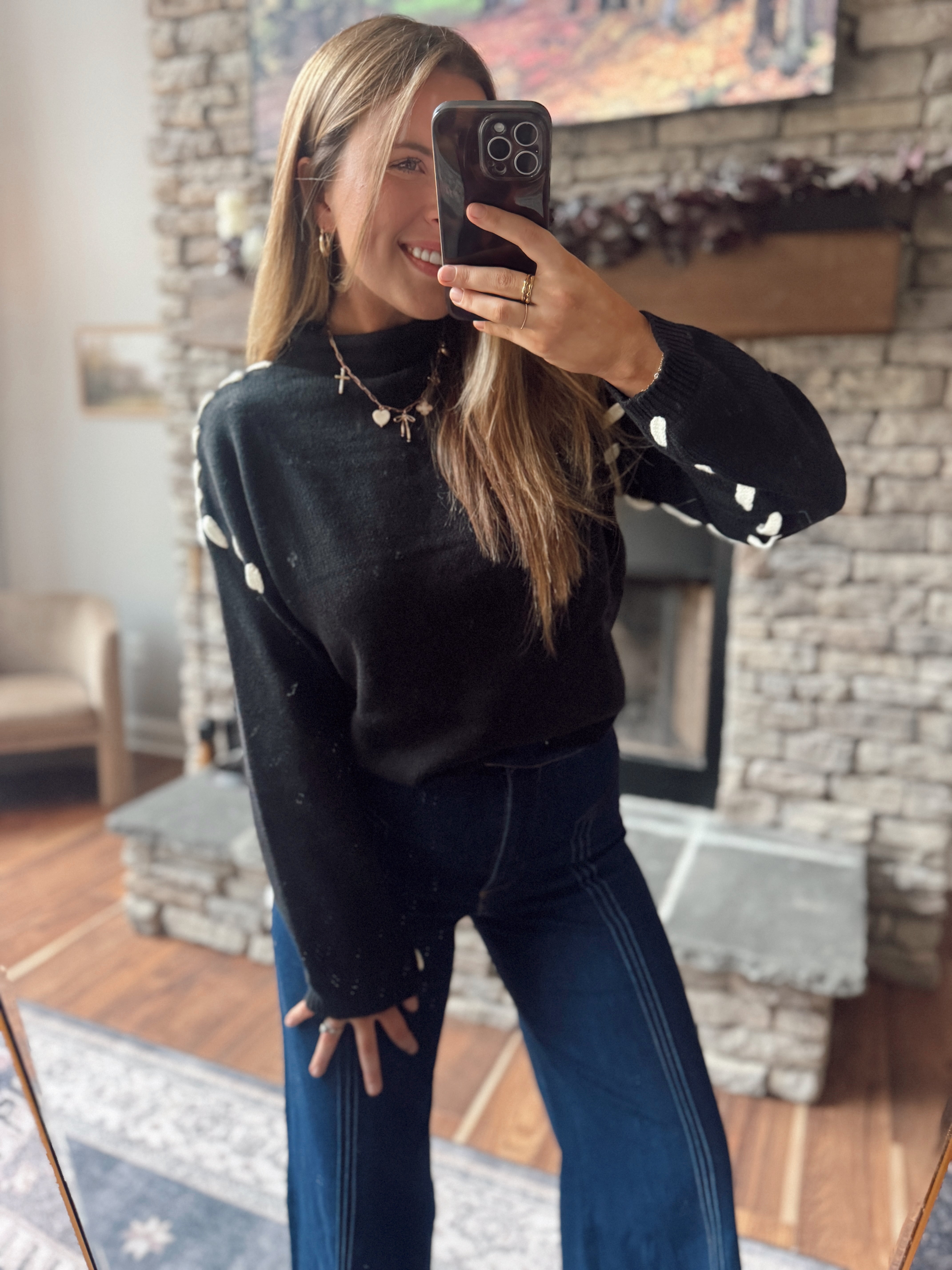 A classic black pullover with the cutest sleeve detail. The soft knit makes it cozy, while the heart-shaped cutouts on the sleeves give it that playful twist we love. Perfect for casual days or dressing up with denim and boots.