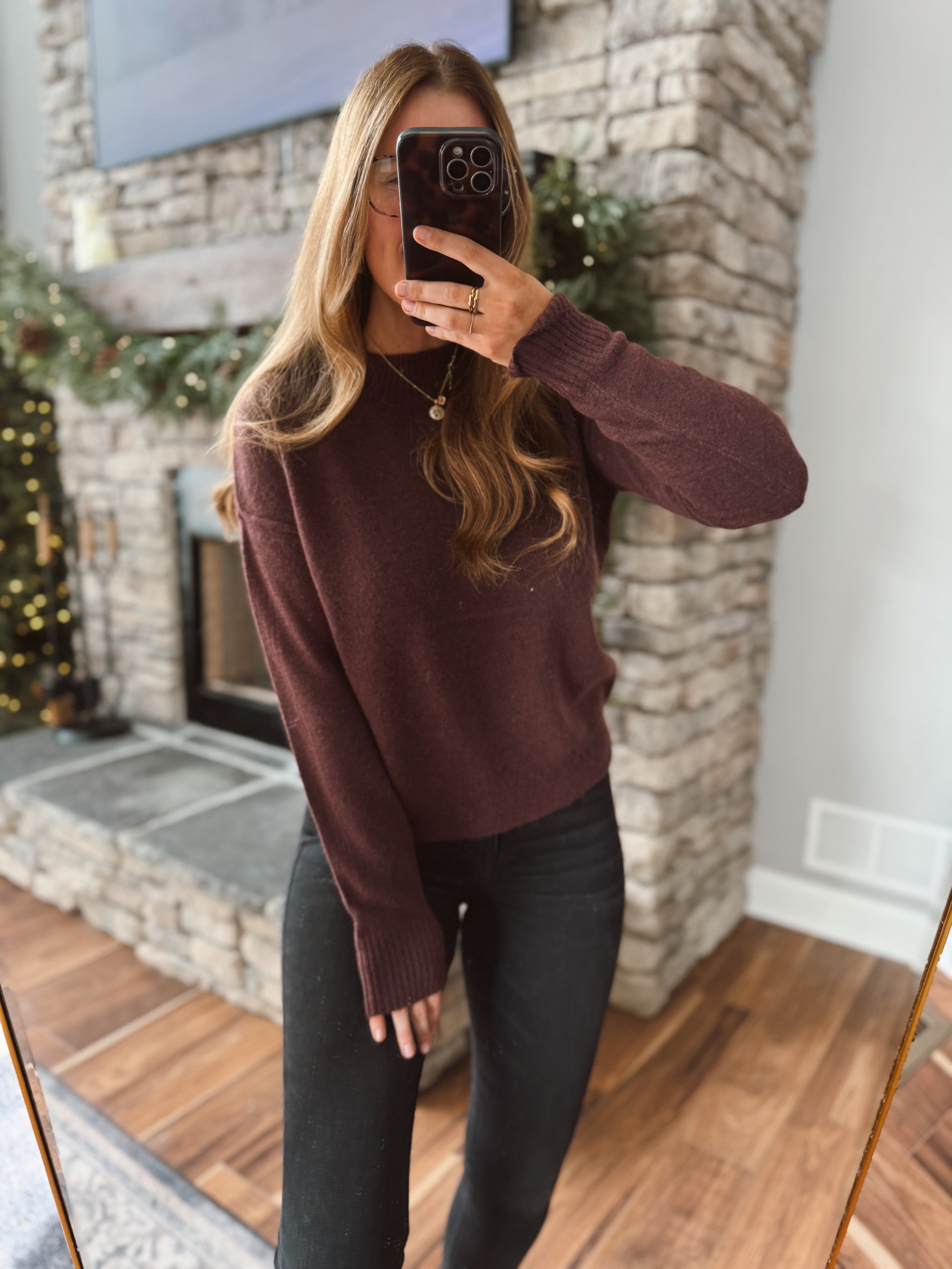 Your new go-to winter basic — soft, lightweight, and perfect for layering. This wine-colored knit sweater has that effortlessly classy look with a relaxed, easy fit that works with denim, leggings, or layered under jackets. A timeless staple you’ll reach for again and again.