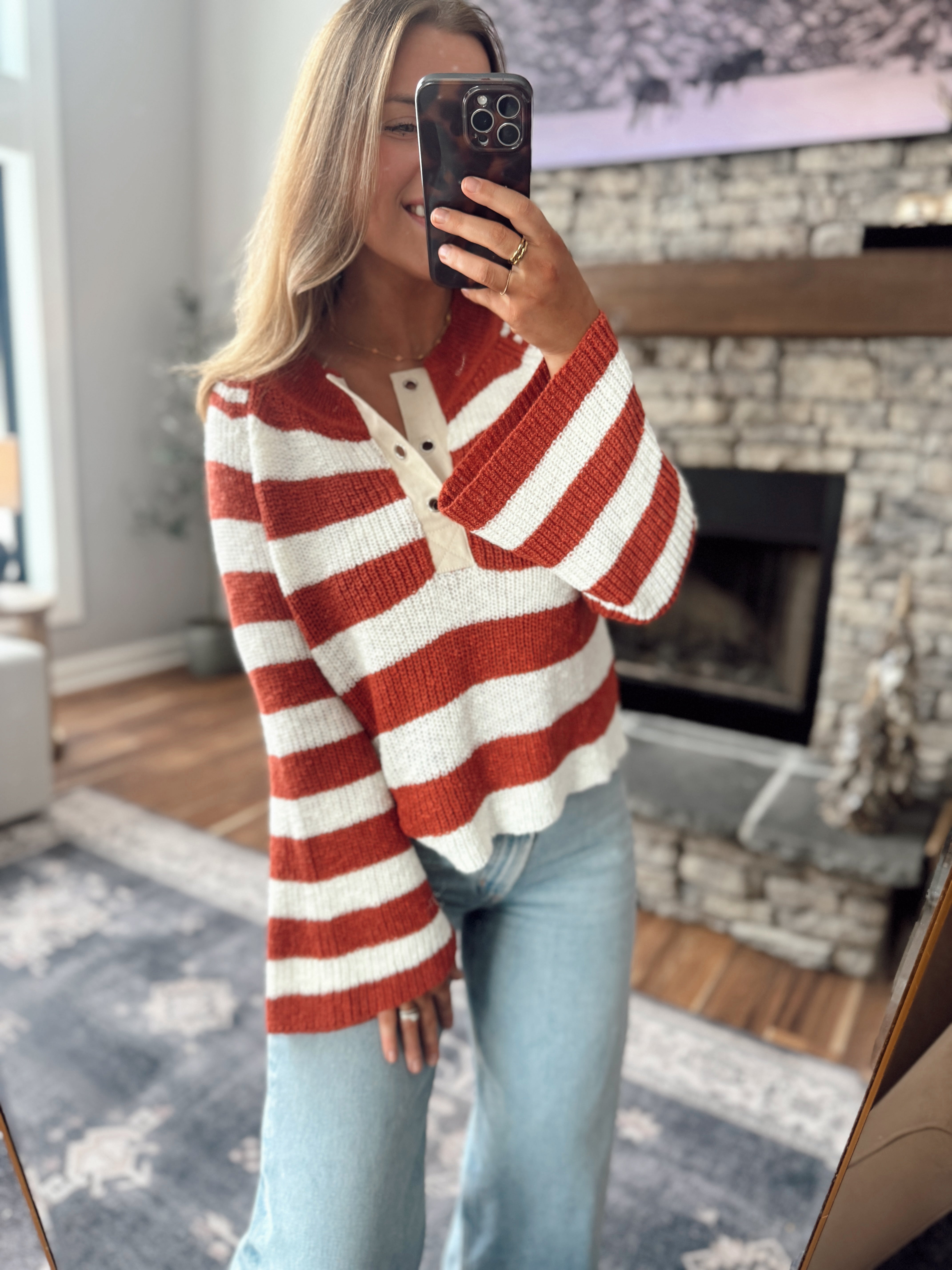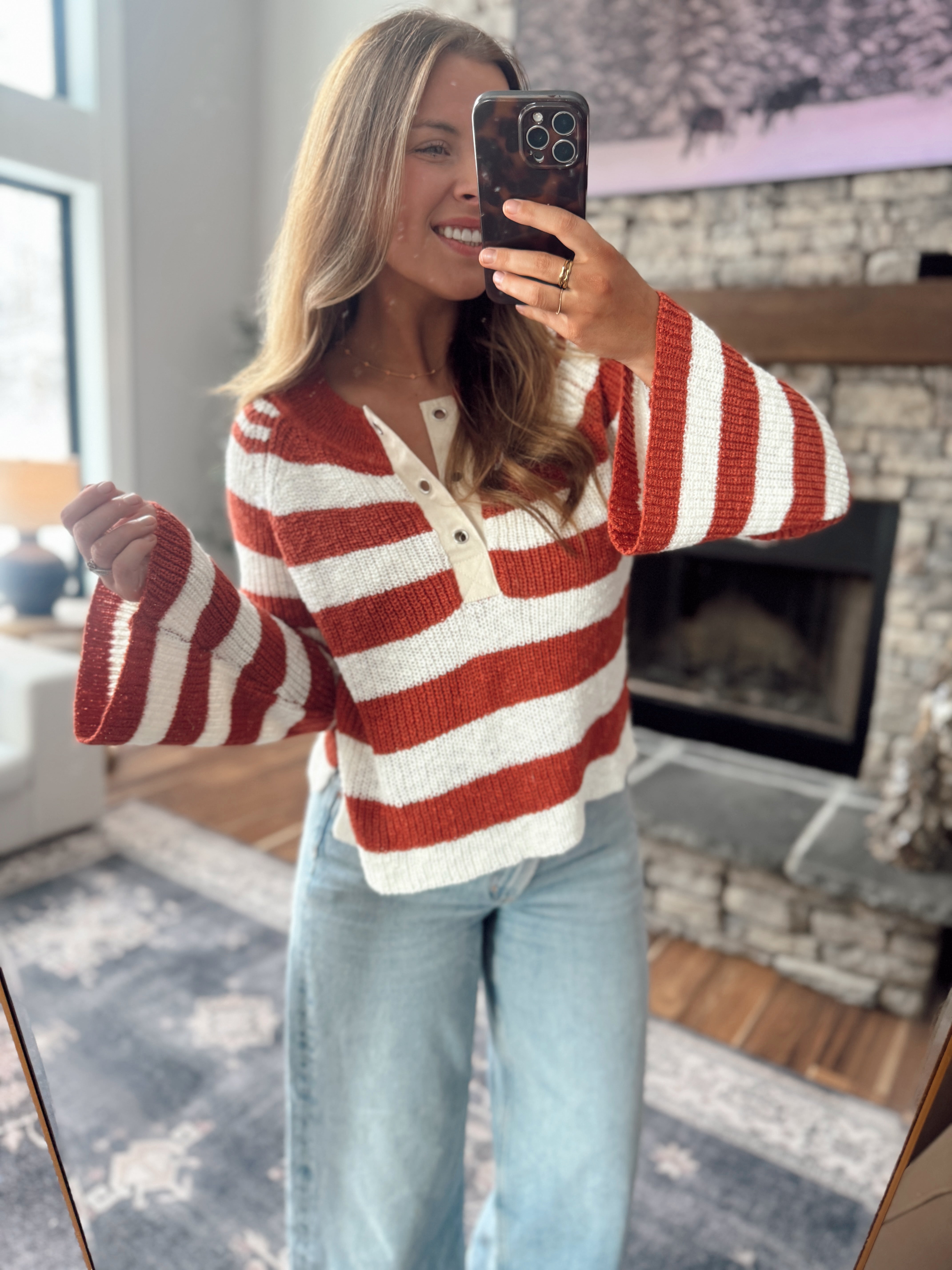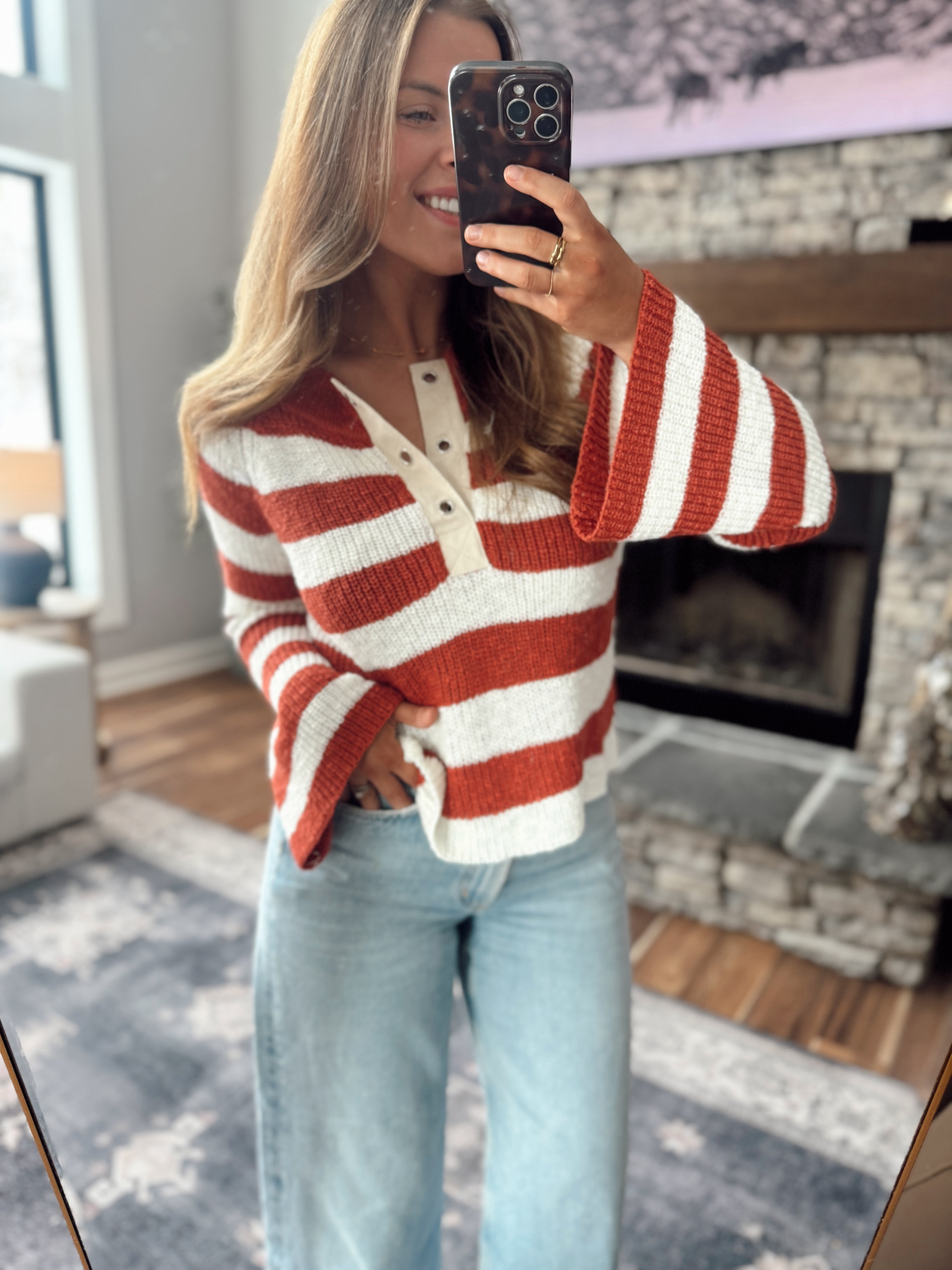 Easy, effortless, and made for everyday wear. This relaxed-fit striped henley sweater features a soft knit feel with a flattering slightly cropped length that pairs perfectly with high-rise denim. The classic rust and cream stripe adds just the right pop of fall color, while the functional button neckline and subtle flare sleeves elevate the look without trying too hard.