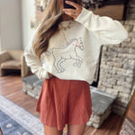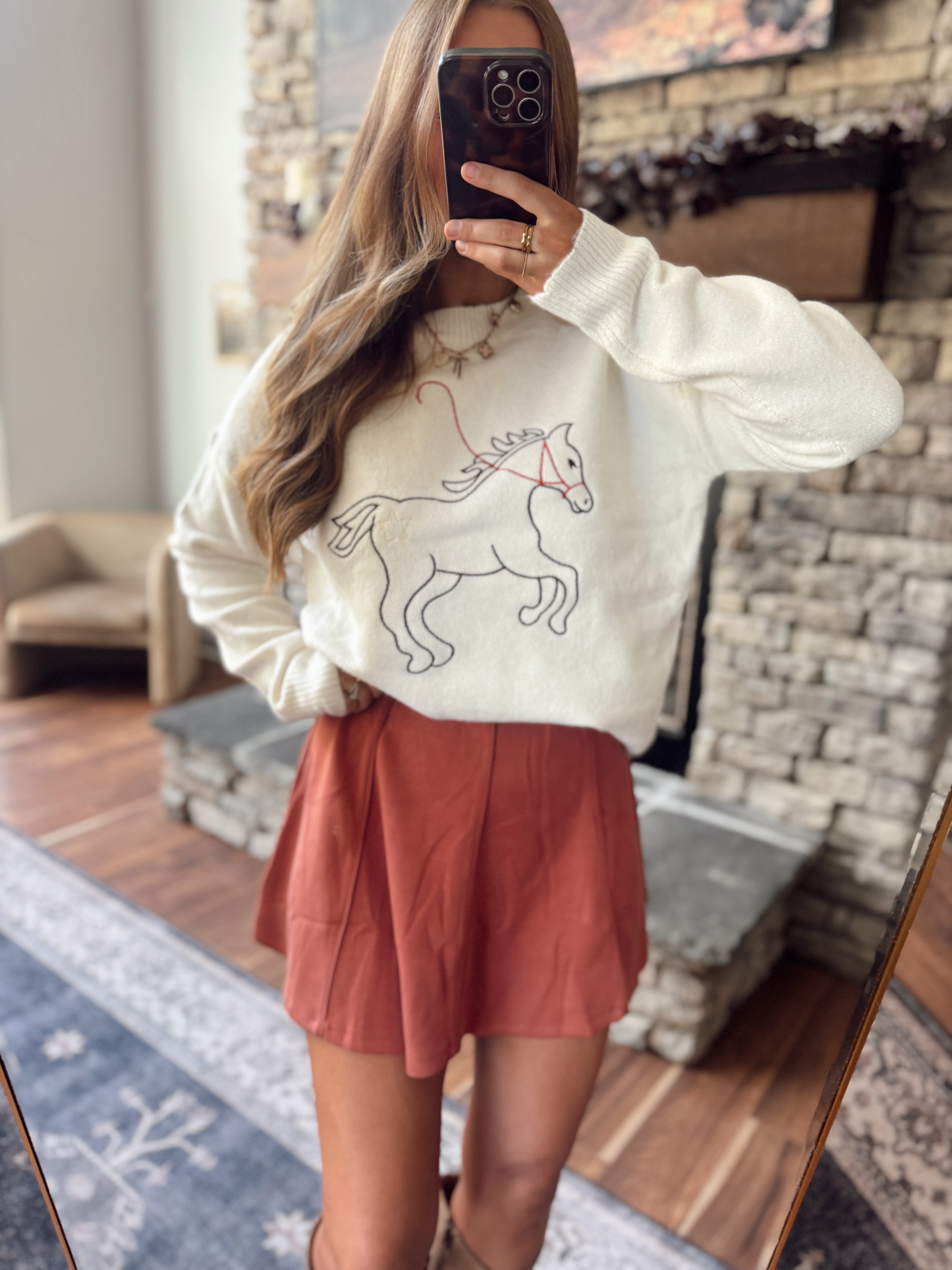 Giddy up in cozy style 🤠This playful knit sweater features a whimsical horse outline with a star accent, bringing just the right touch of western charm to your fall wardrobe. Made from a soft, cozy knit with a relaxed fit, it’s perfect for chilly days at the barn, pumpkin patches, or coffee runs.