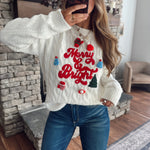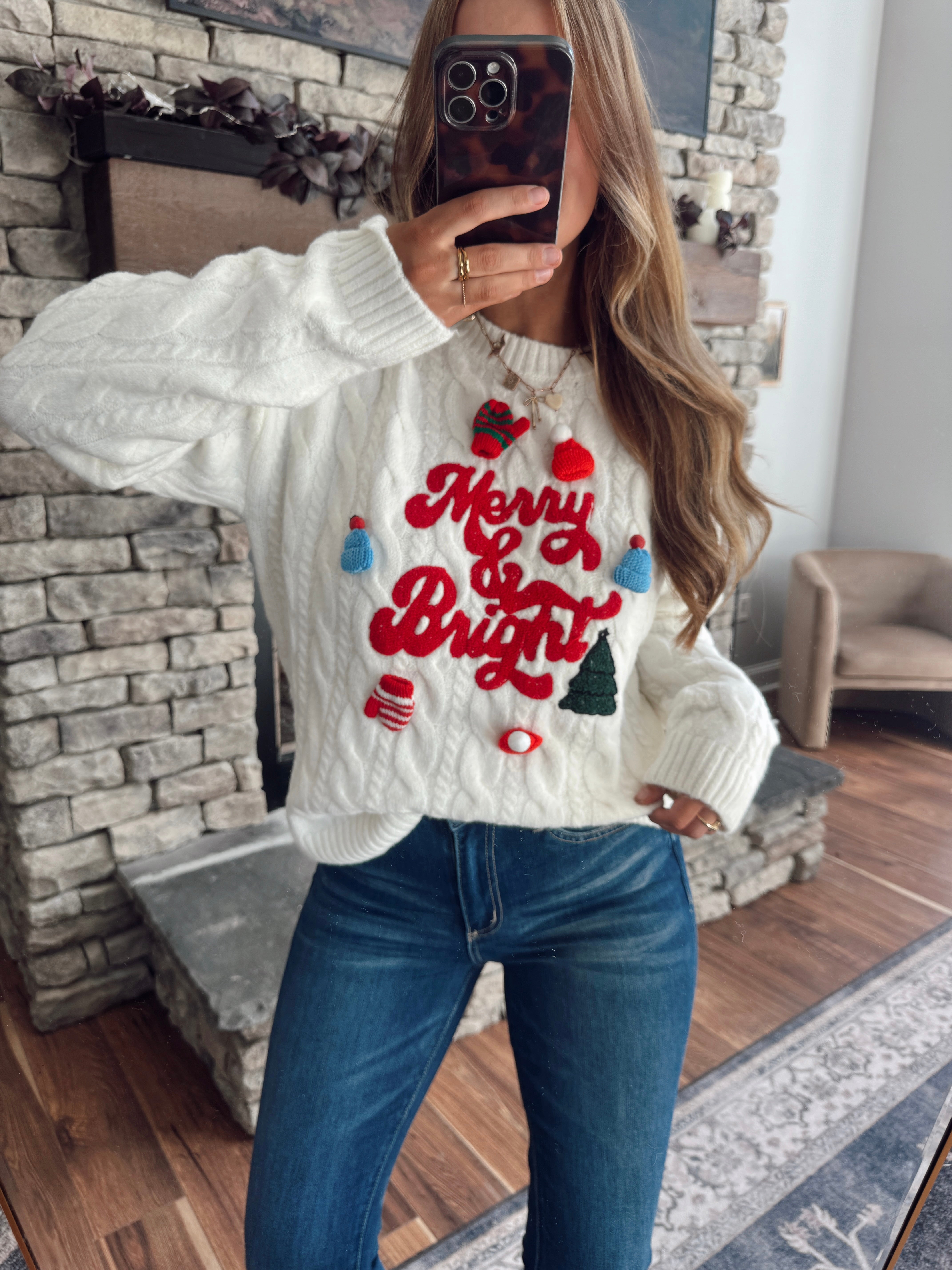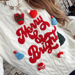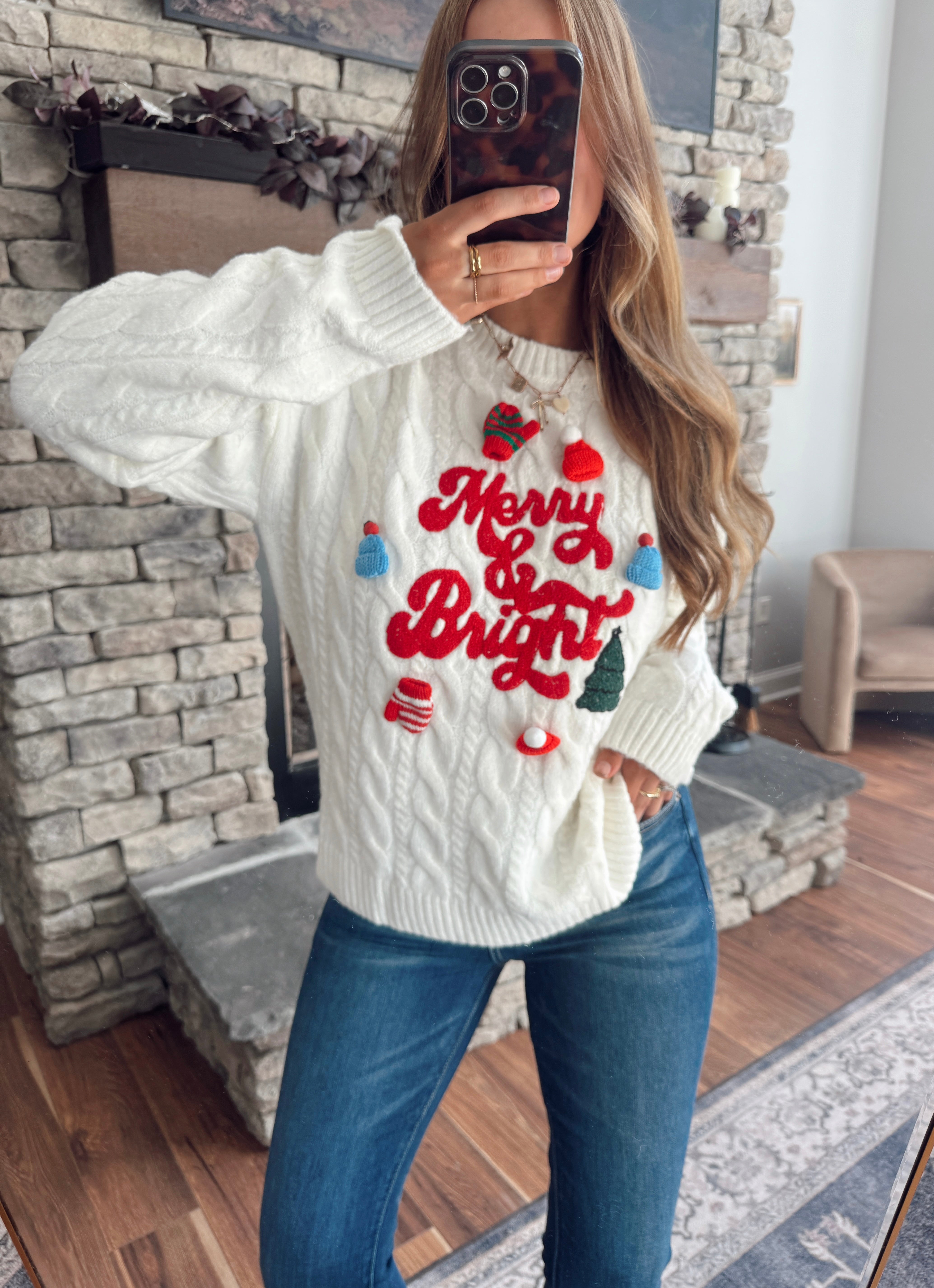 All the cozy Christmas vibes in one adorable sweater ❄️ This ivory cable knit features bold “Merry & Bright” lettering with the sweetest little 3D knit appliqués — from tiny mittens to a Christmas tree and mugs of cocoa. Soft, warm, and perfectly festive for every holiday moment.