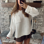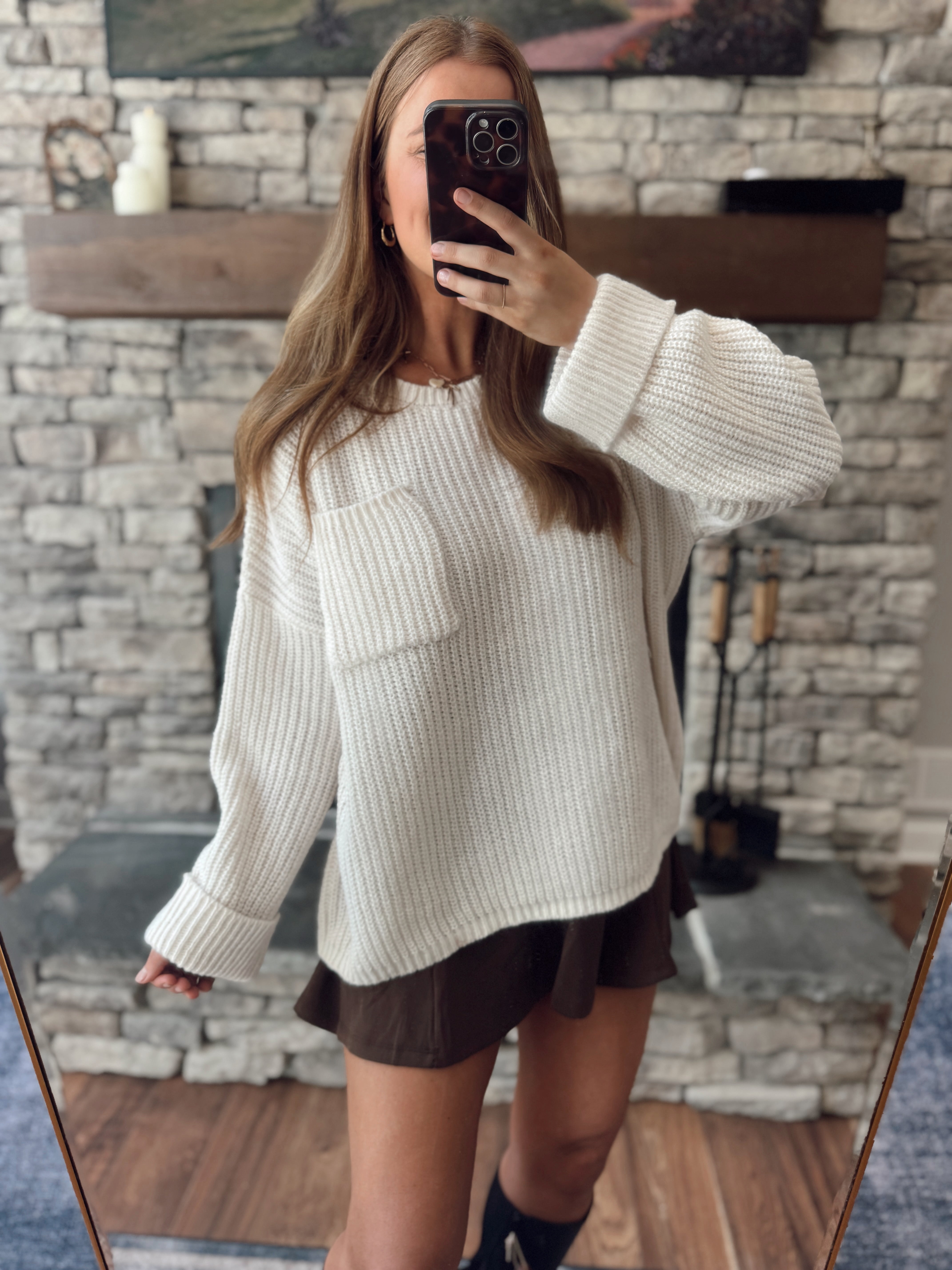 An easy everyday layer with just the right amount of slouch. This ribbed knit sweater features a relaxed fit, drop shoulders, and a front patch pocket for a laid-back vibe. The wide cuffed sleeves and soft texture make it a go-to piece for effortless comfort. Pairs perfectly with denim, skirts, or layered over dresses.