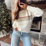 This ivory knit sweater features soft, muted stripes in vintage-inspired tones for that effortlessly lived-in feel. The relaxed fit and ribbed edges make it the perfect throw-on piece for coffee runs, errands, or a cozy day at home. Easy to style with denim, trousers, or joggers — it’s one of those sweaters you’ll wear on repeat.