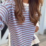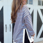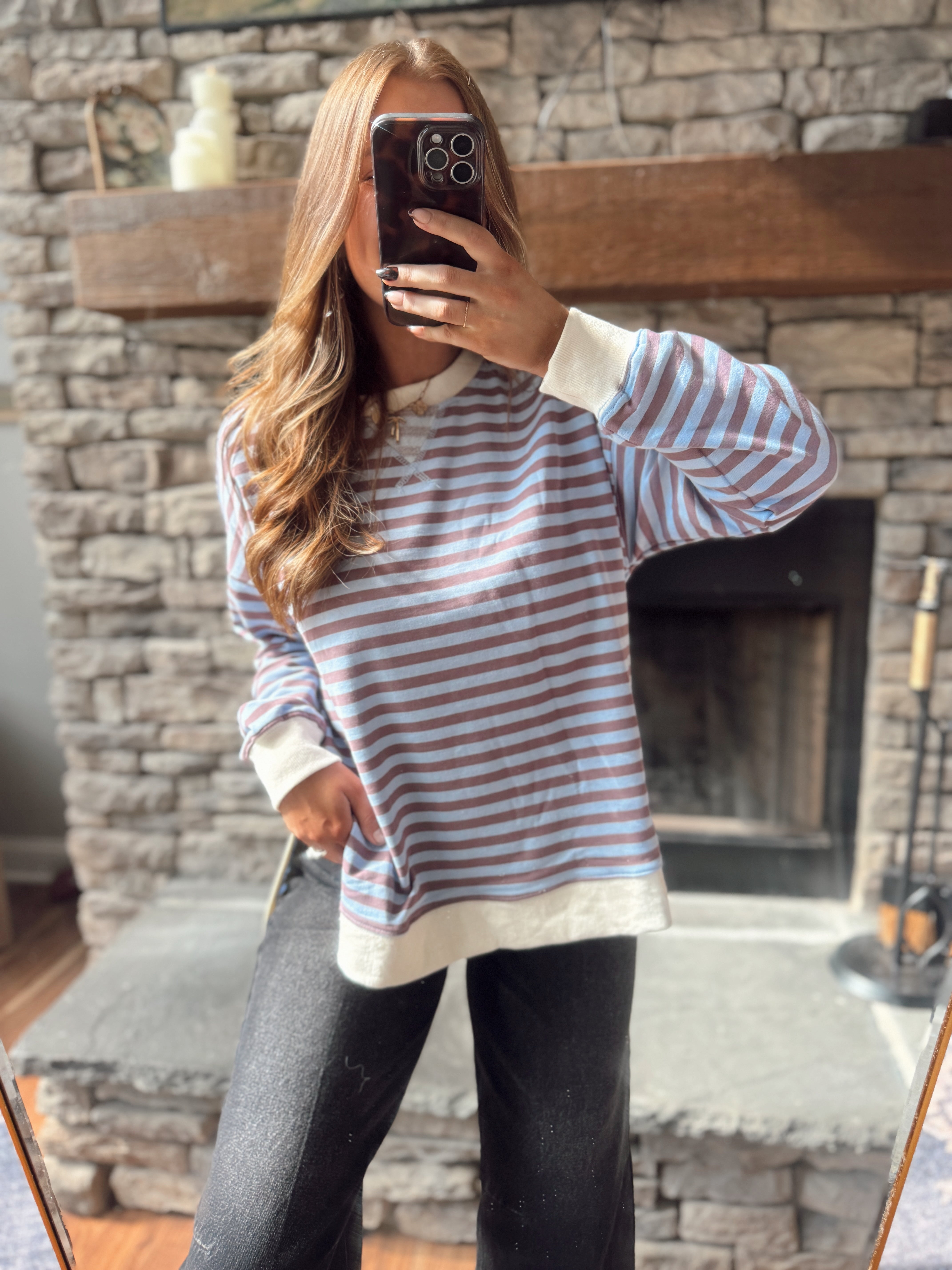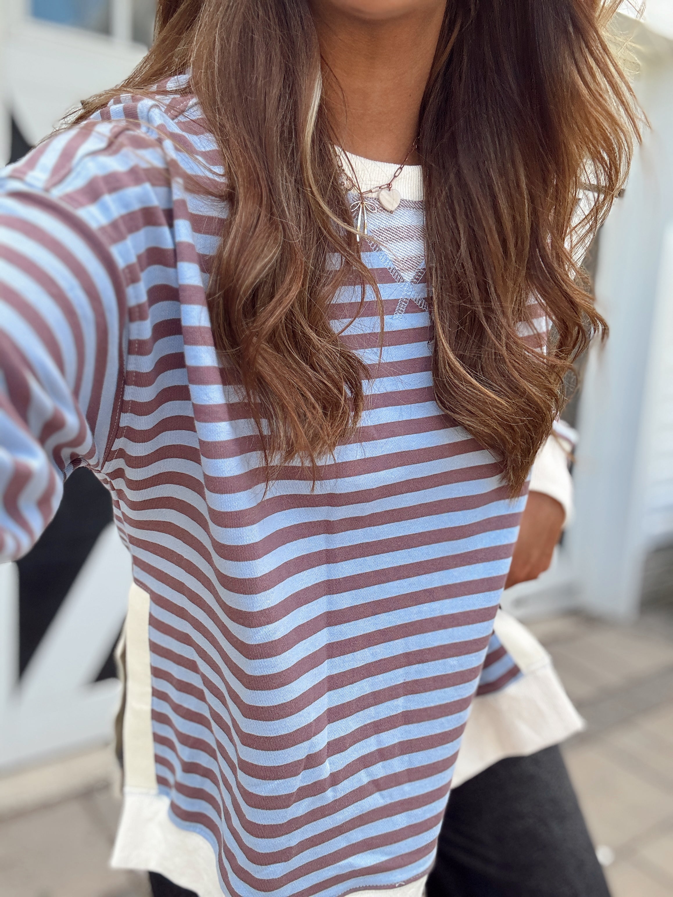 A long sleeve striped knit top with a round neck featuring a reversed stitched triangle neck detail and a relaxed fit. Fabric is a lightweight knit.
