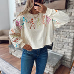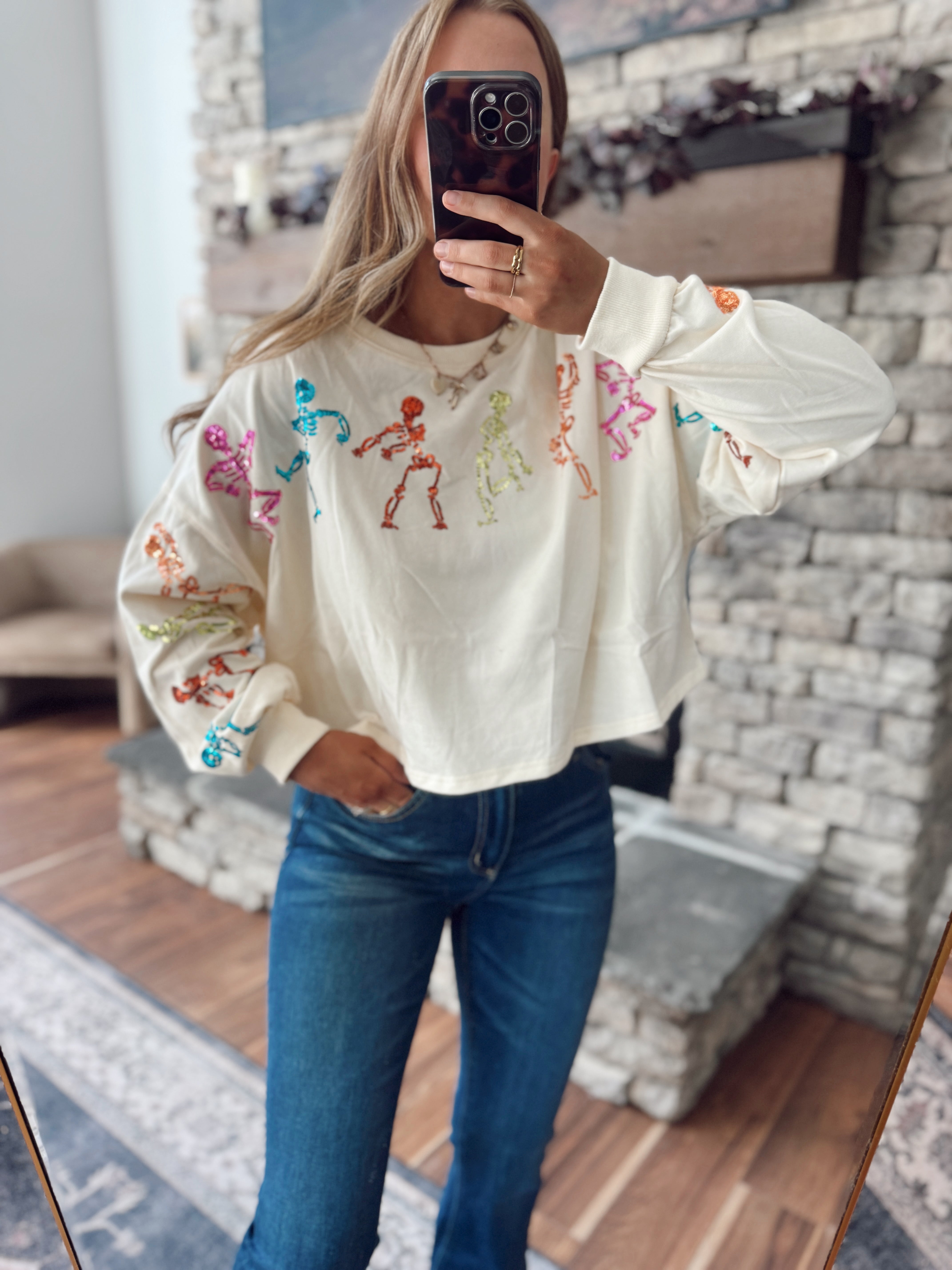 Turn up the cozy and the fun with this playful graphic sweatshirt. Featuring a lineup of vibrant dancing skeletons across the chest and sleeves, this soft cream pullover brings major personality to your fall lineup.