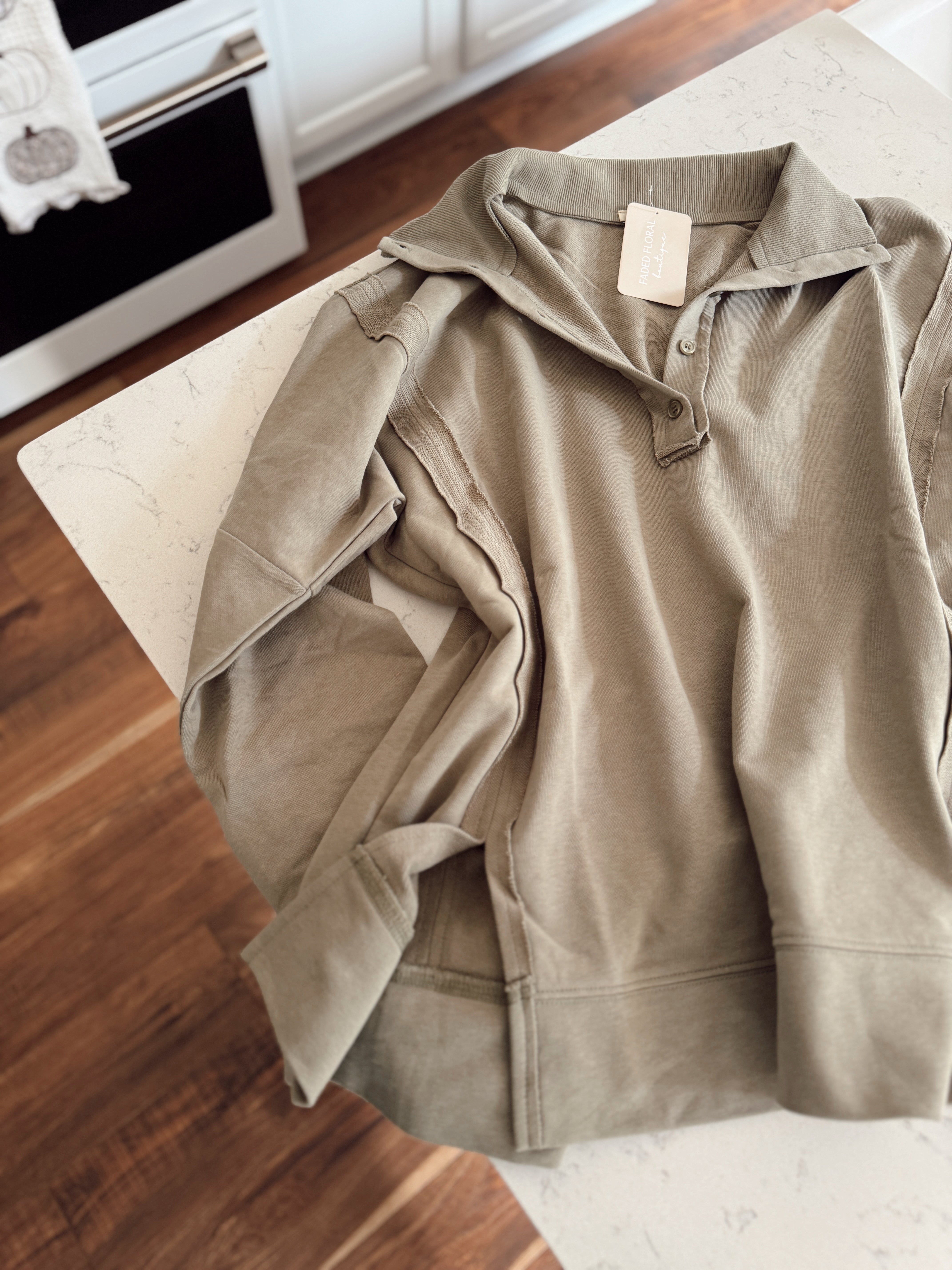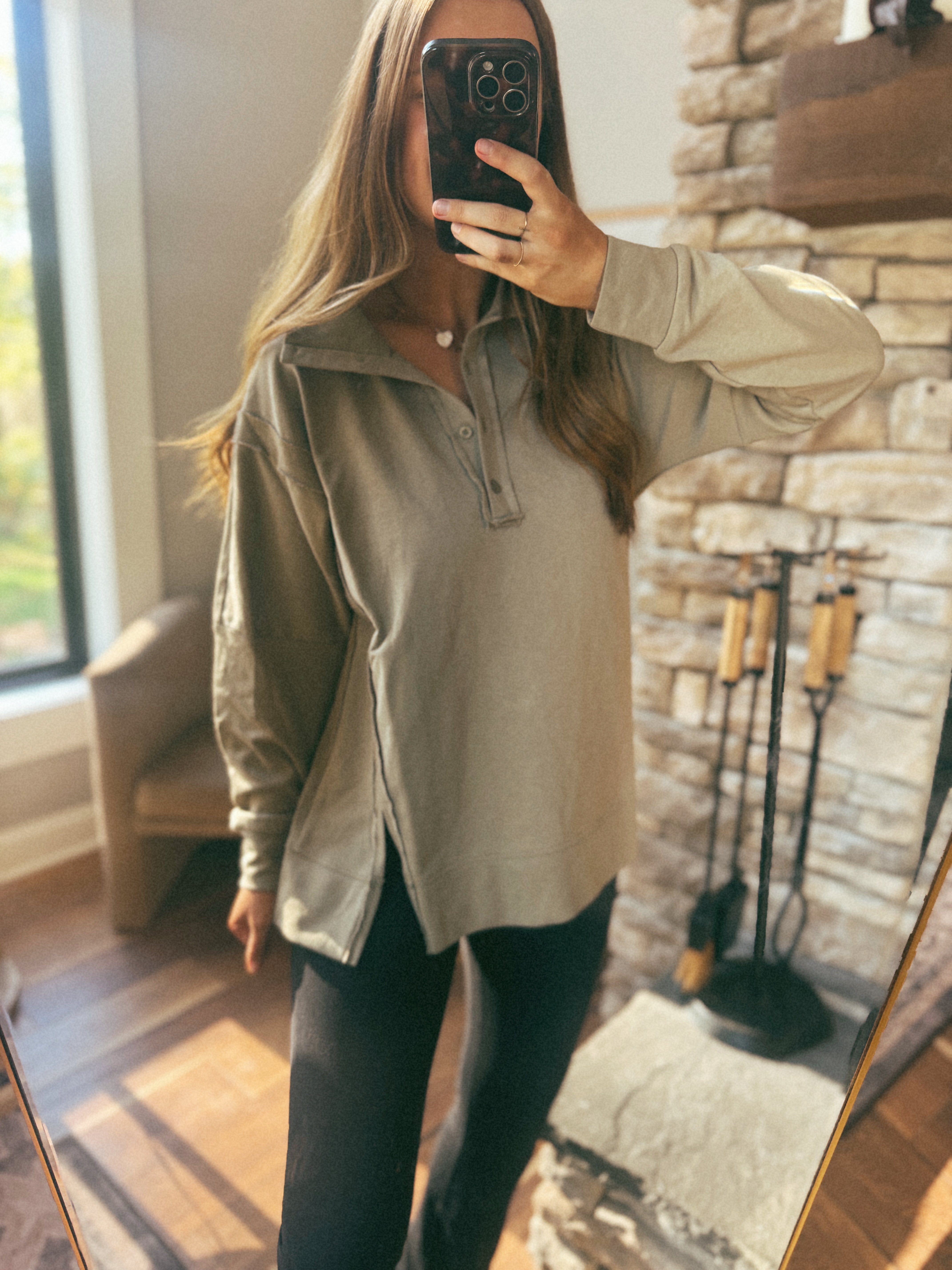 Your go-to for laid-back days — this Henley Collared Pullover brings an elevated twist to everyday comfort. The soft washed fabric, drop shoulders, and relaxed fit make it a cozy essential you’ll wear on repeat. Finished with a partial button placket and side slits for that casual-chic vibe.