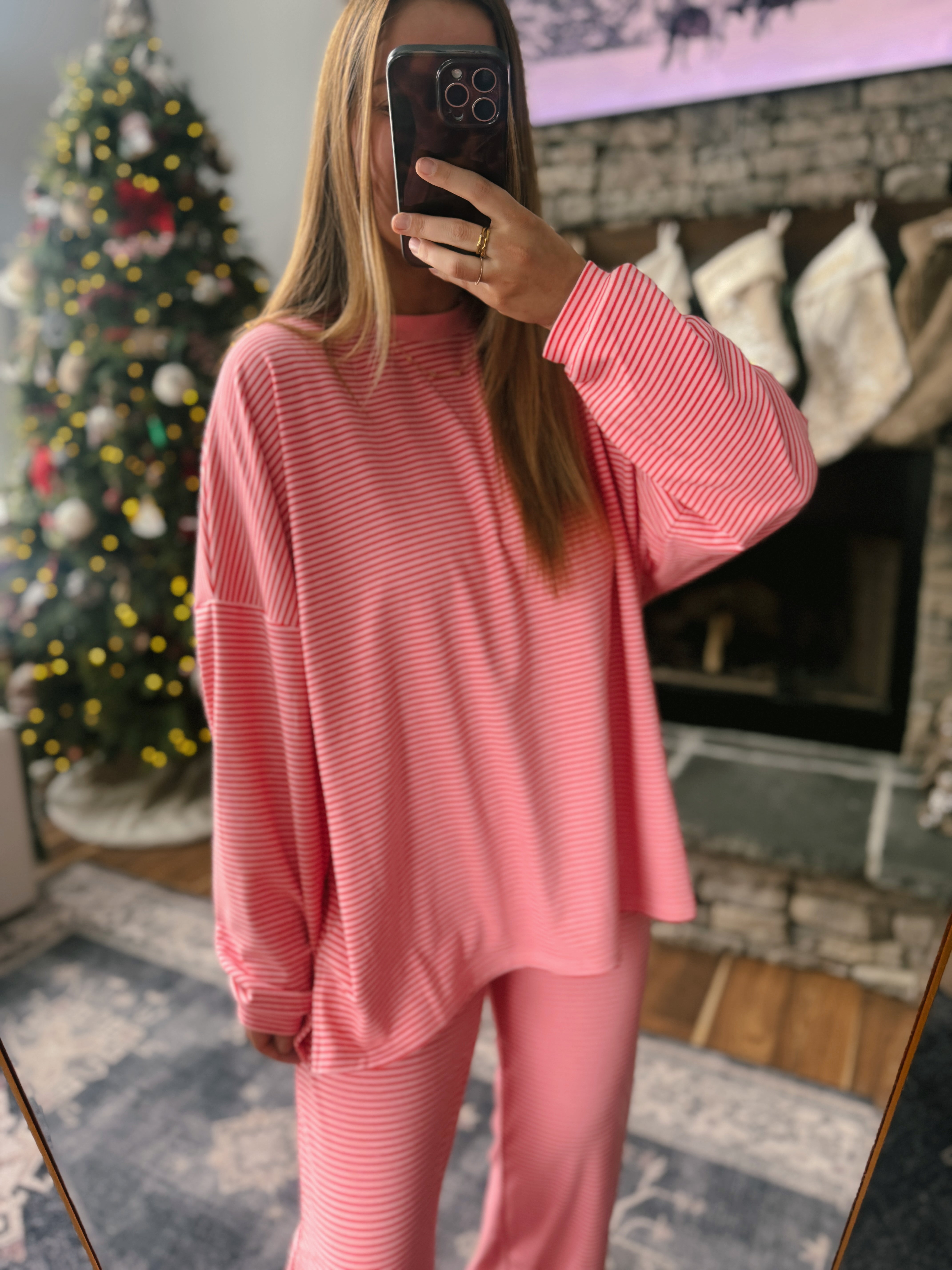Soft, comfy, and made to relax in. This blue striped lounge top features an oversized fit with relaxed drop-shoulder sleeves for that perfectly slouchy feel. Lightweight, stretchy, and easy to wear around the house or out and about.