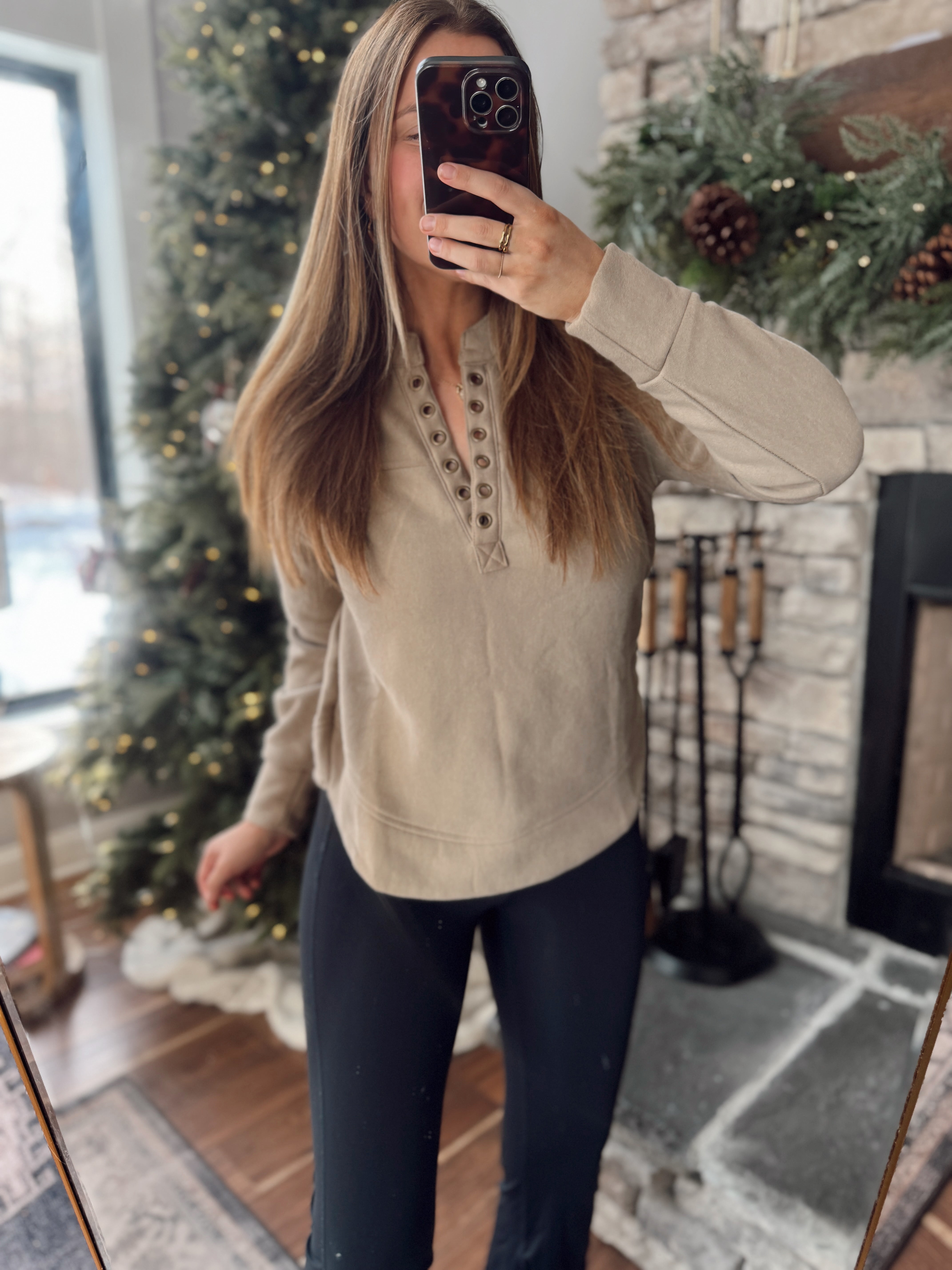 Cozy meets classic in this soft fleece-lined henley pullover. Designed with a flattering curved hem and functional button front with metal grommet details for that effortless “lived-in” look. The inside is brushed fleece—warm, plush, and perfect for layering on chilly days.