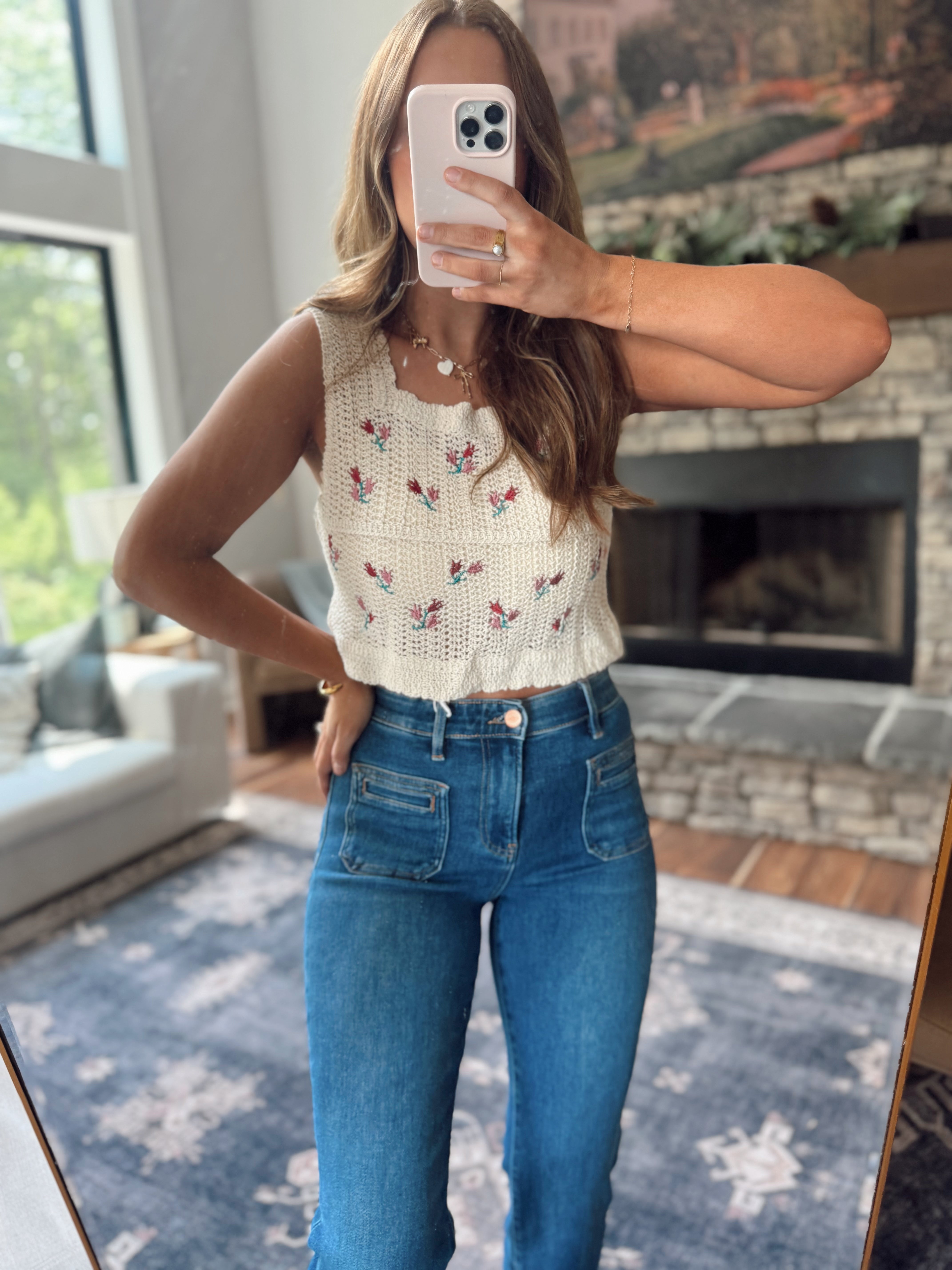 Aleigha Natural Embroidered Crochet Cropped Tank