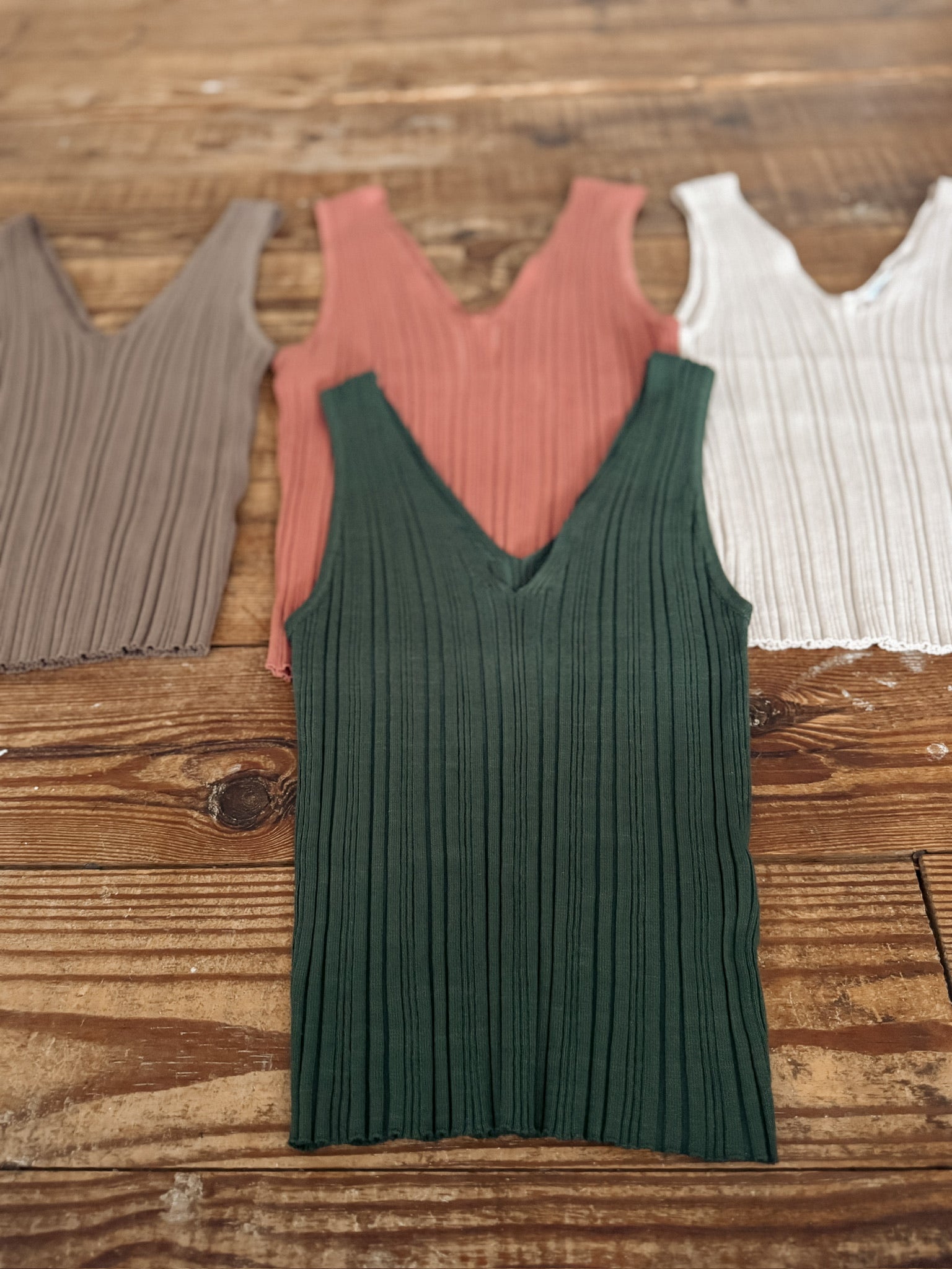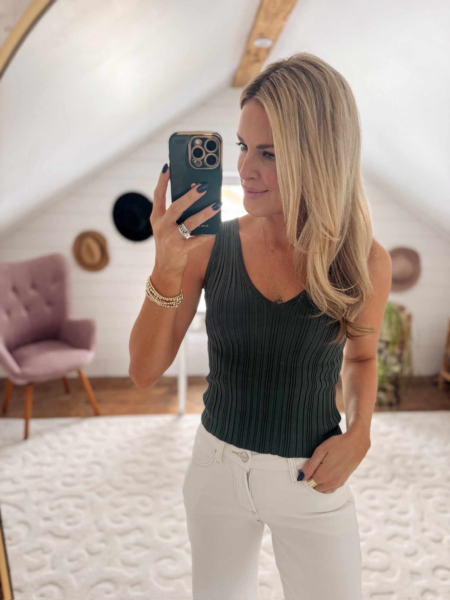 Slip into effortless style with this green textured tank. The flattering V-neckline and sleeveless cut make it perfect for layering or wearing solo when the weather warms up. The rich, versatile hue pairs beautifully with everything in your closet, while the subtle texture adds visual interest and dimension. Whether you're dressing it up with a blazer or keeping it casual with your favorite jeans, this versatile piece is about to become your go-to favorite.