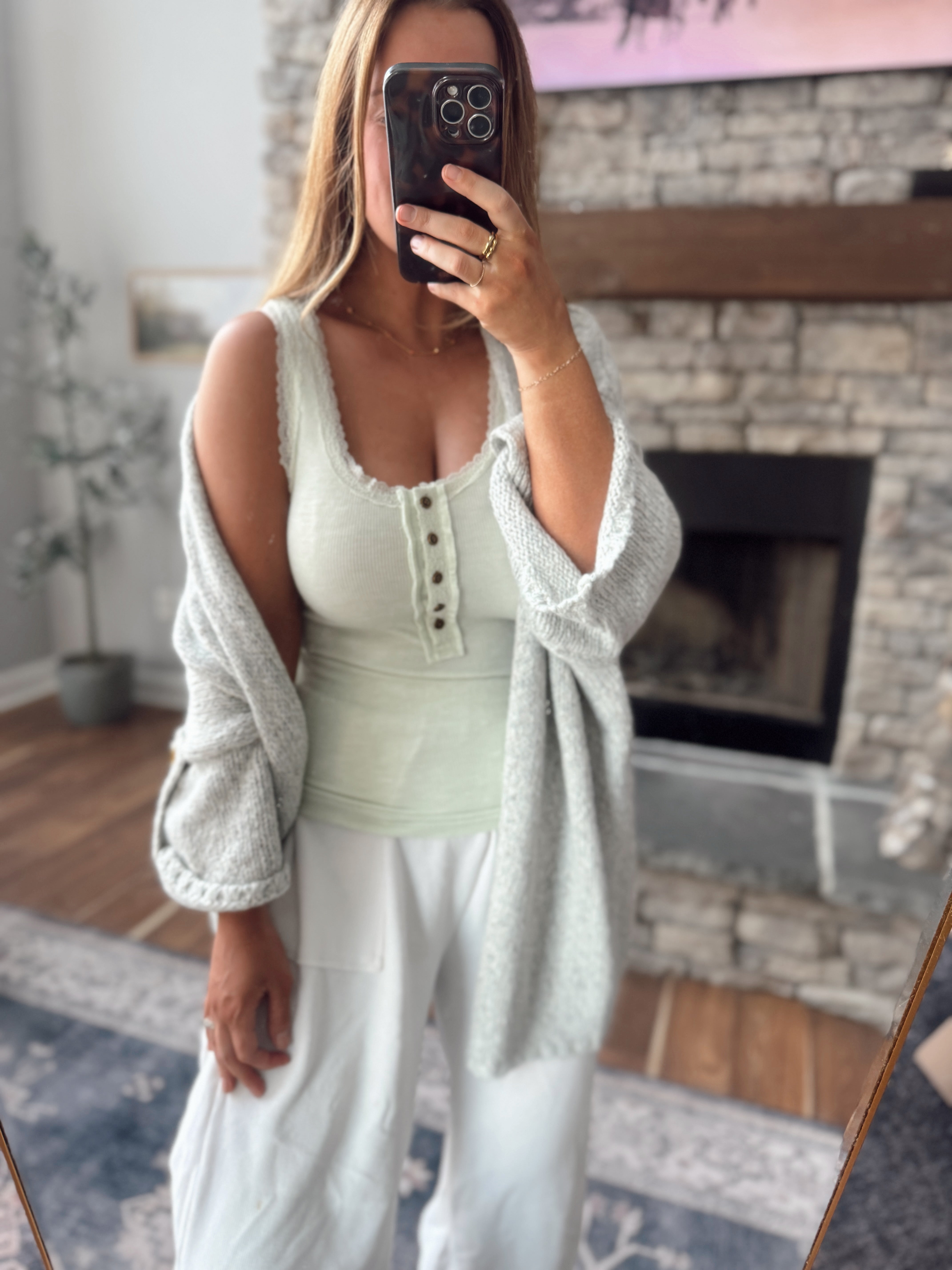 Your favorite everyday layer, elevated. This POL lace trim henley tank is soft, stretchy, and insanely flattering with just the right amount of feminine detail. The ribbed fabric hugs without feeling tight, while the delicate lace trim adds that pretty touch we can’t get enough of.