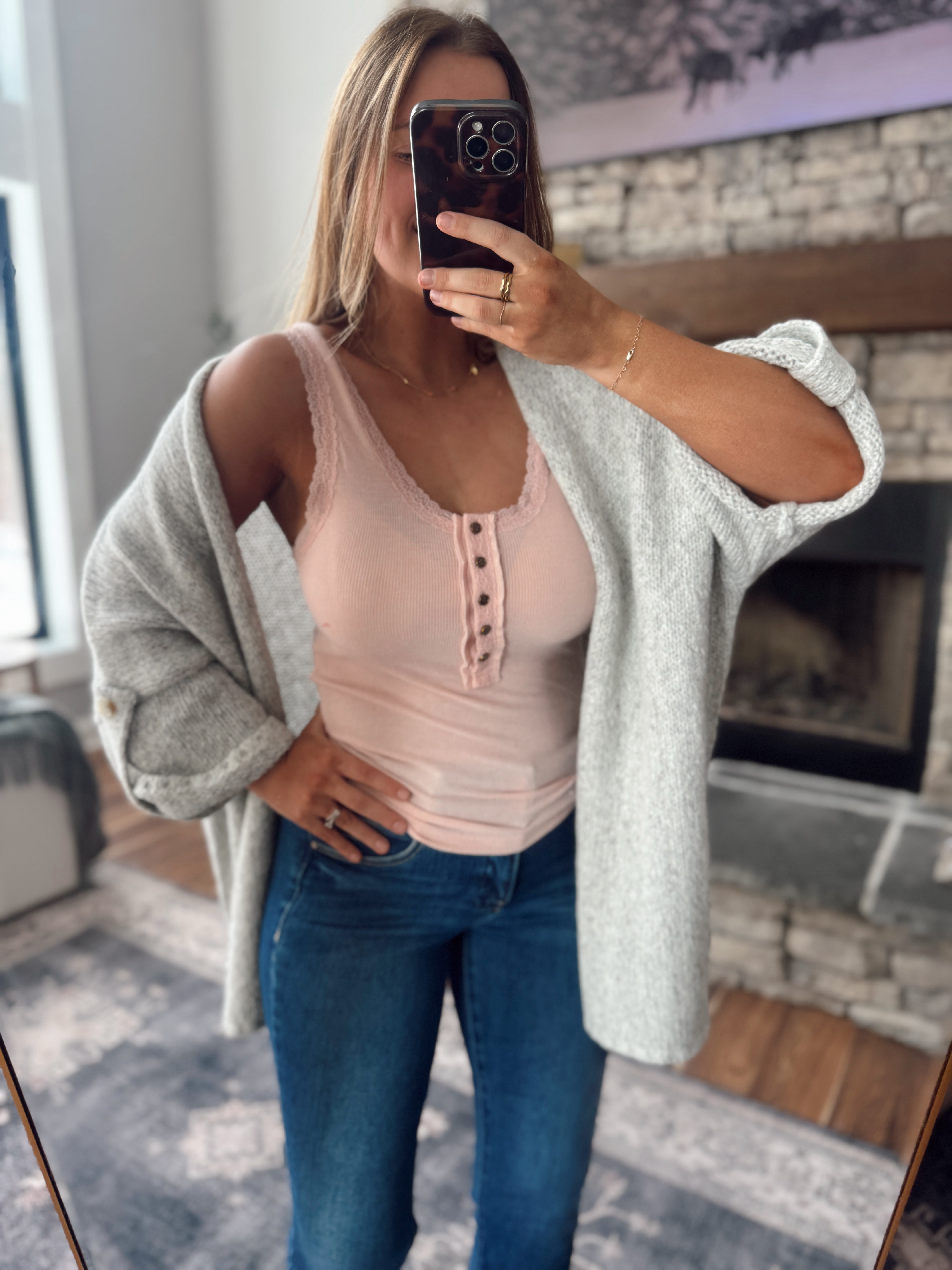 Shadow Gray Lace Border Knit Tank