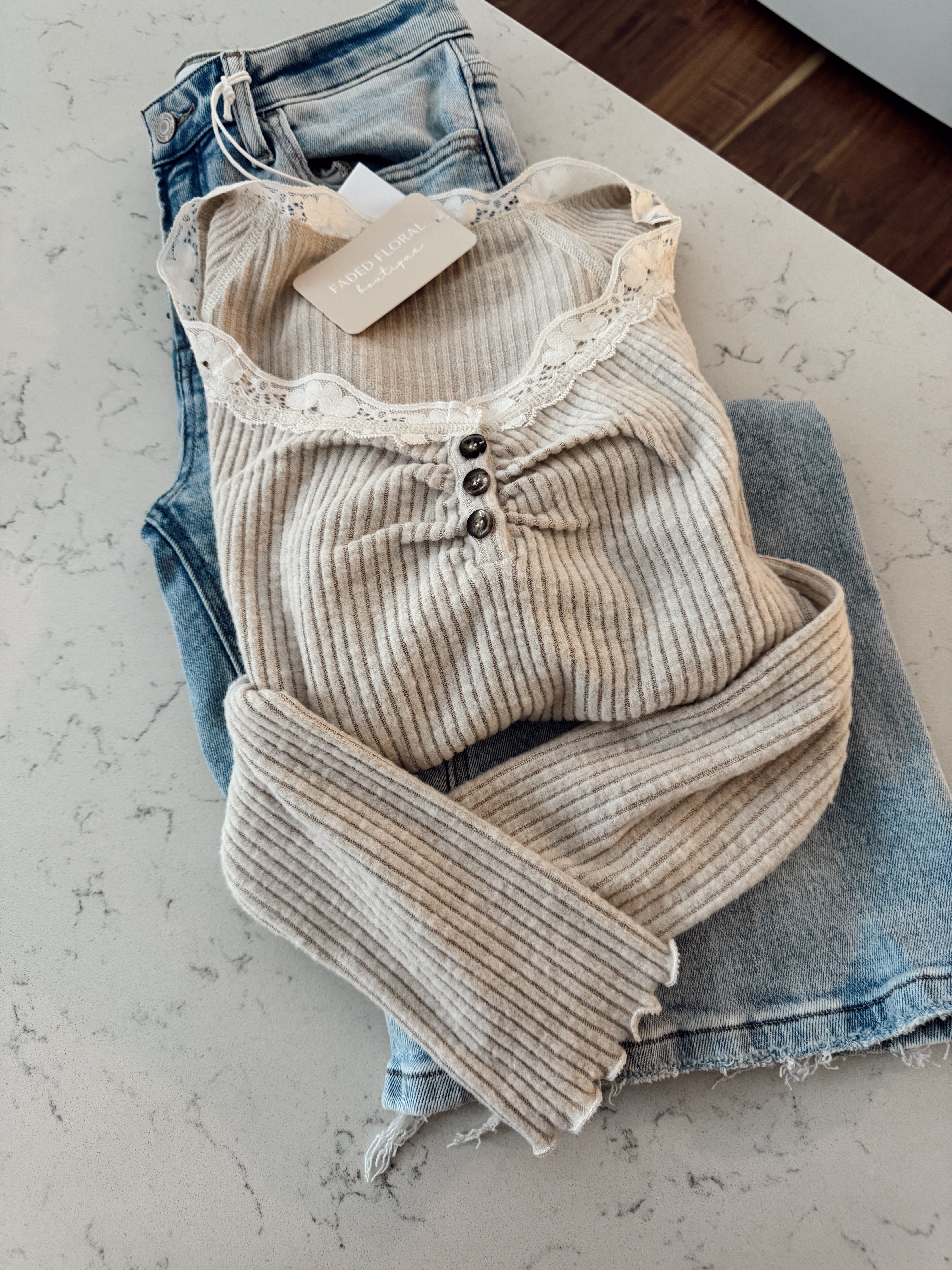 Soft Taupe Rib Lace Trimmed Henley Top