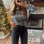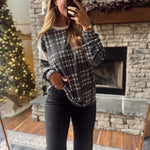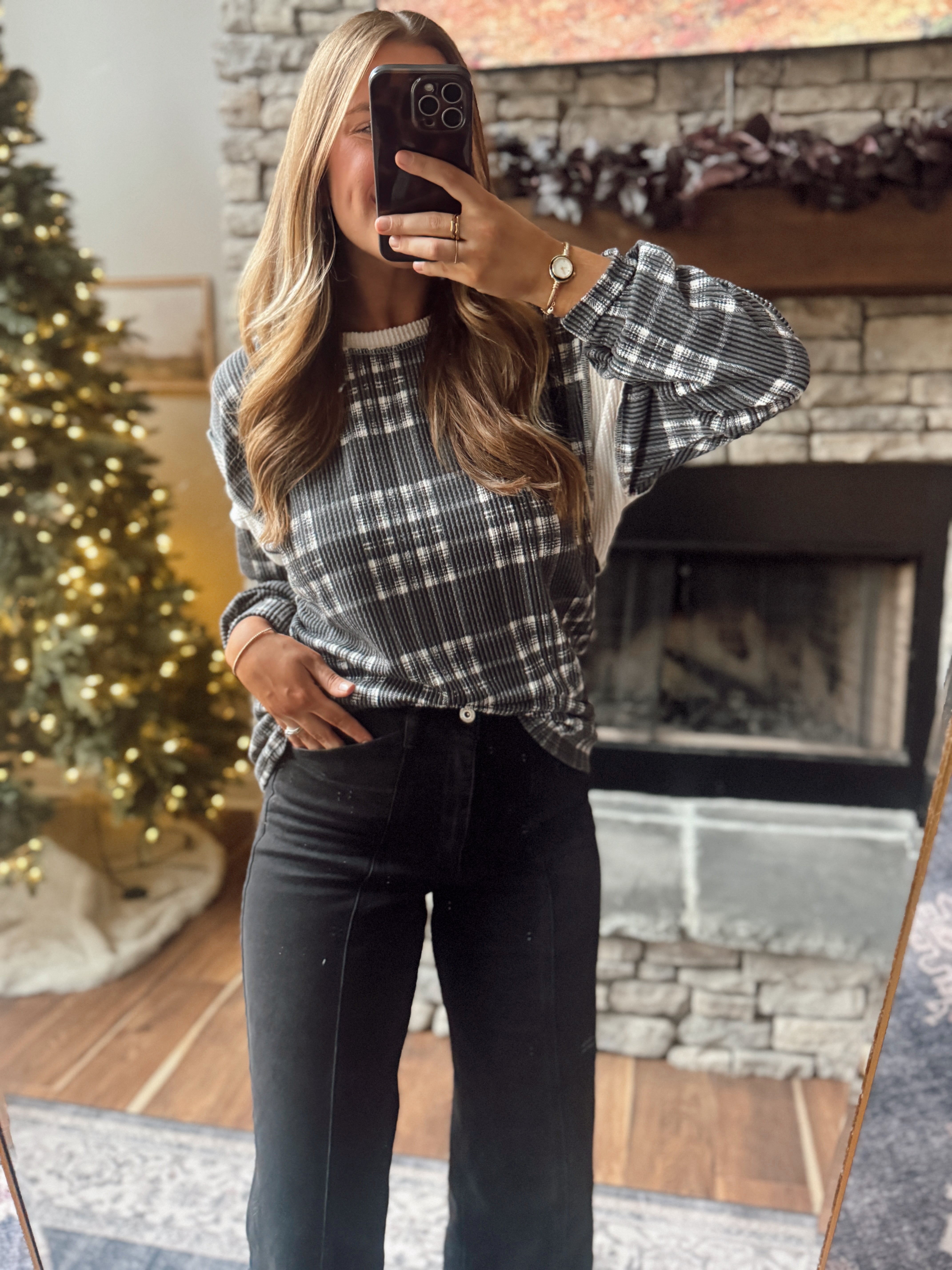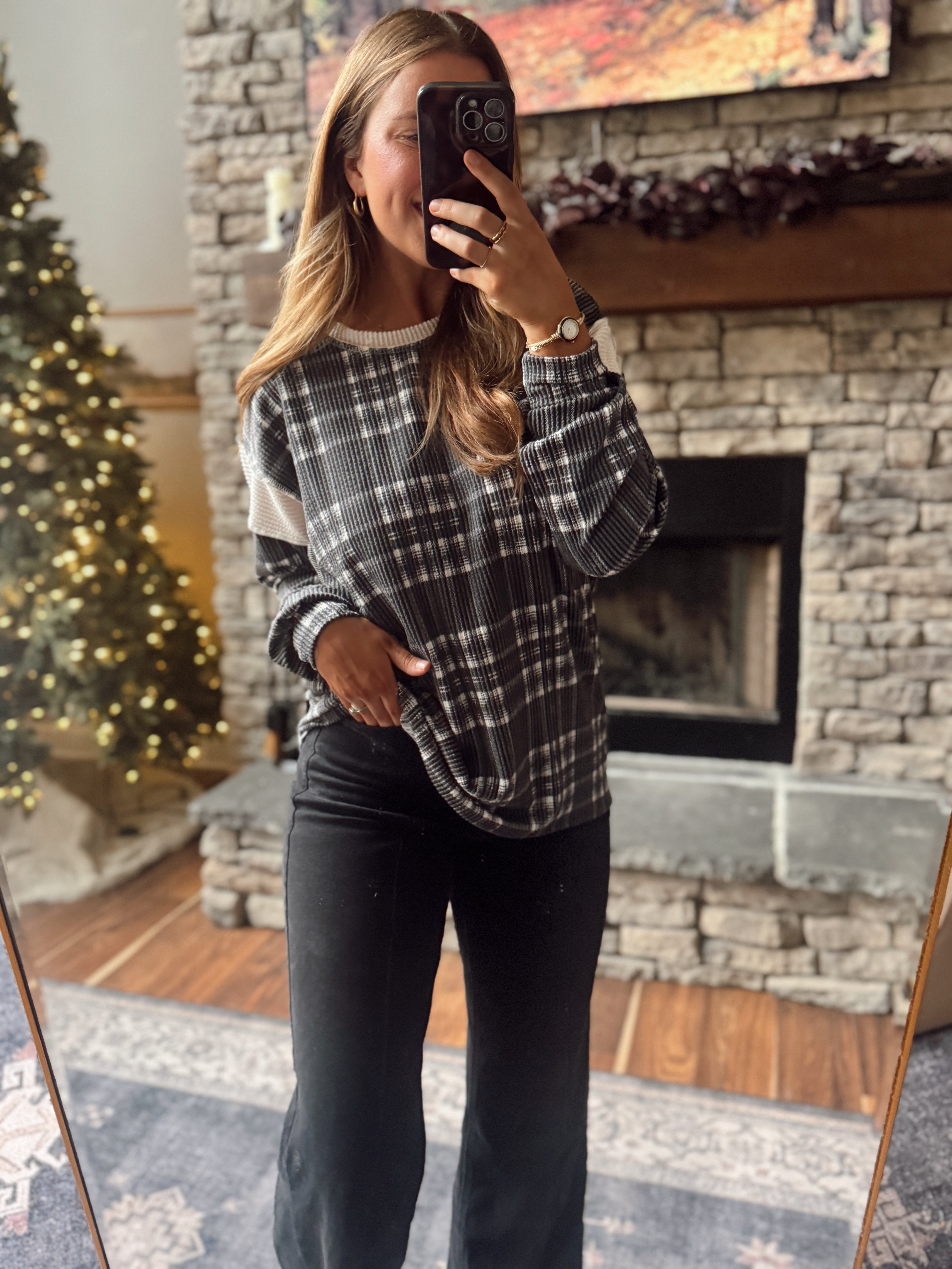 This soft waffle-knit top brings all the cozy feels with a relaxed fit and subtle mixed textures. The black and white plaid design keeps it timeless, while the contrast stitching and cuff detail give it a fresh, laid-back edge.