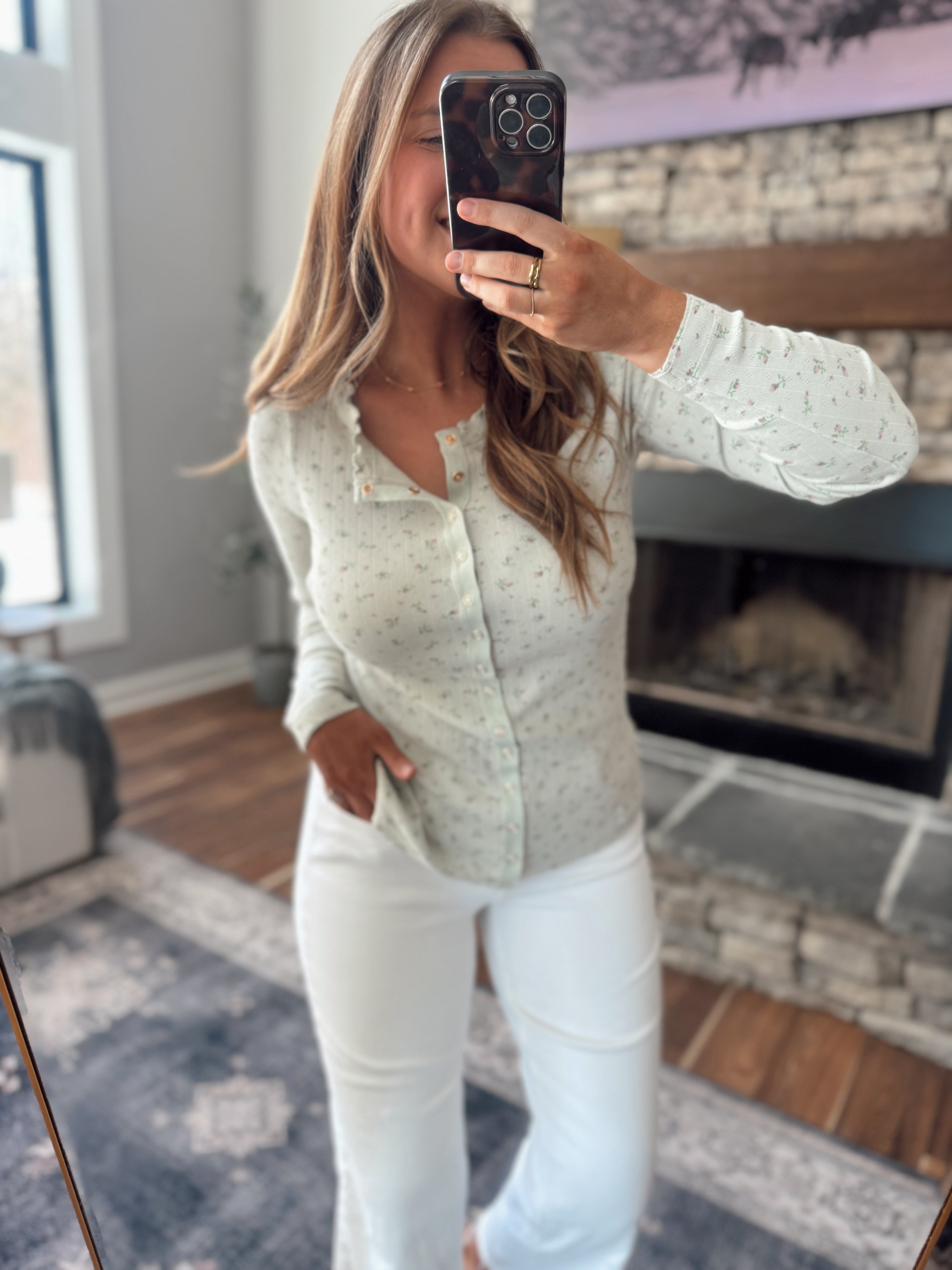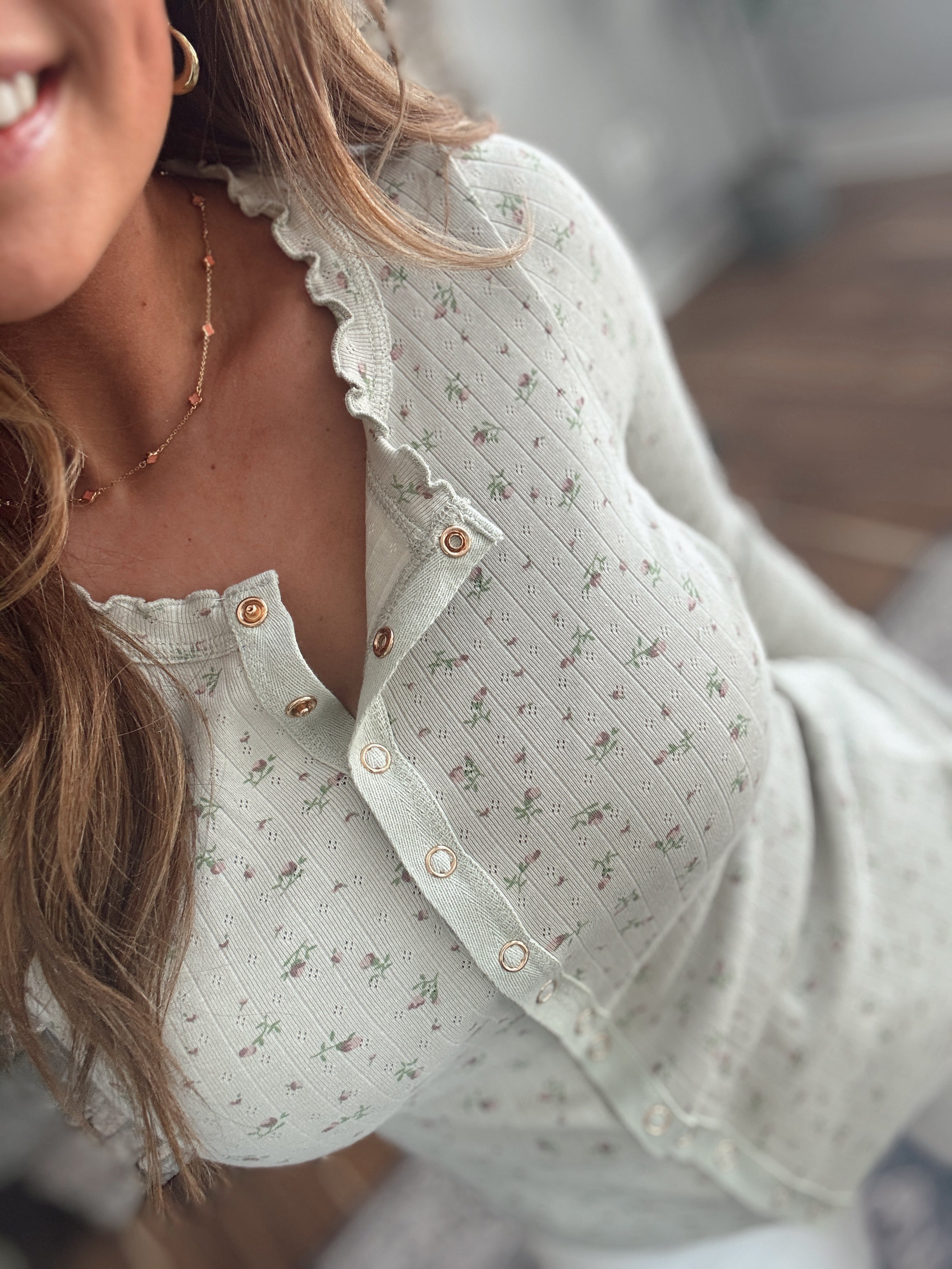 Soft, feminine, and effortlessly flattering. This ribbed button-front top features a delicate ditsy floral print with the sweetest scalloped neckline for a romantic, elevated touch. The stretchy ribbed fabric hugs just right while staying comfortable enough for all-day wear.