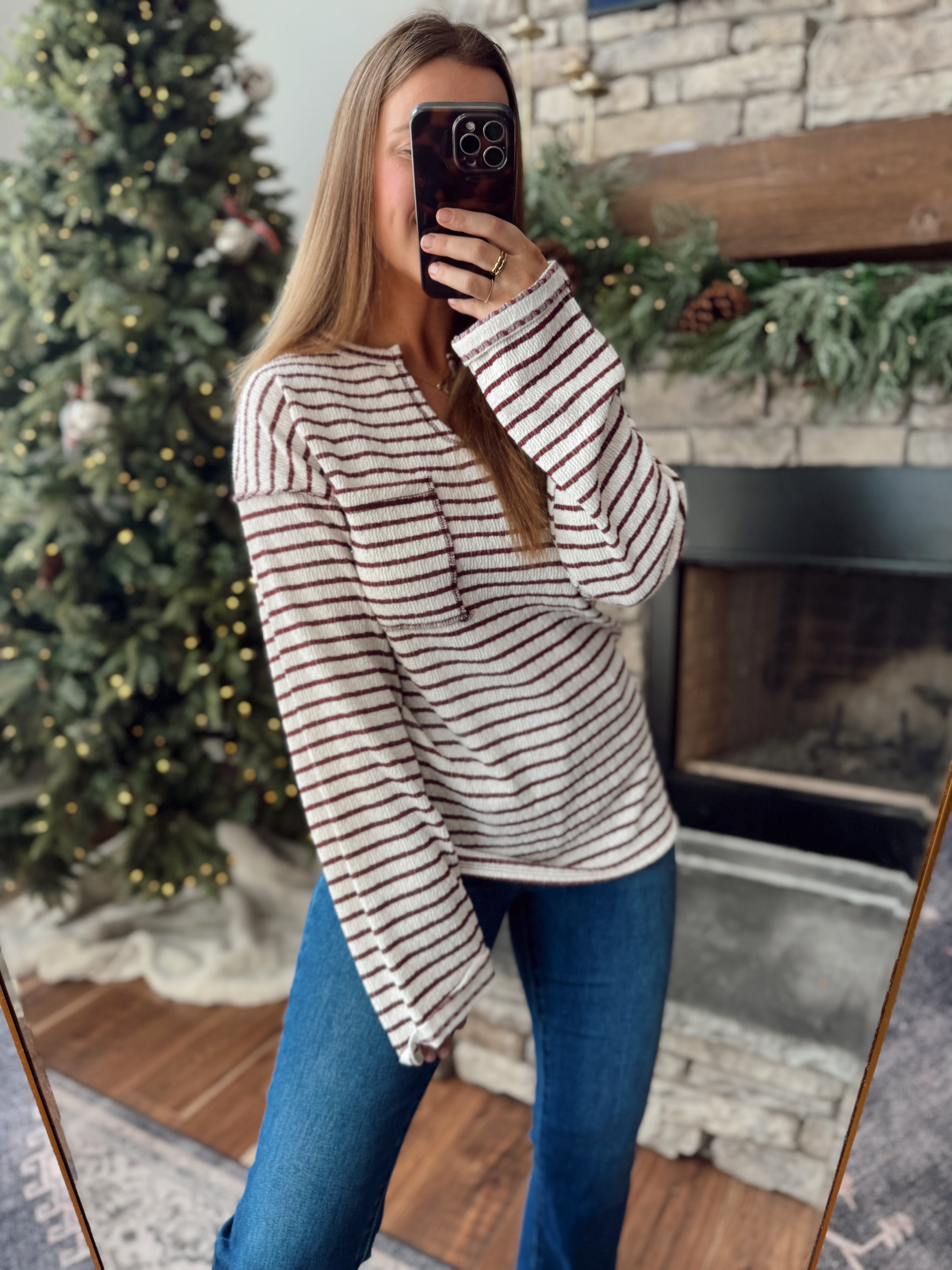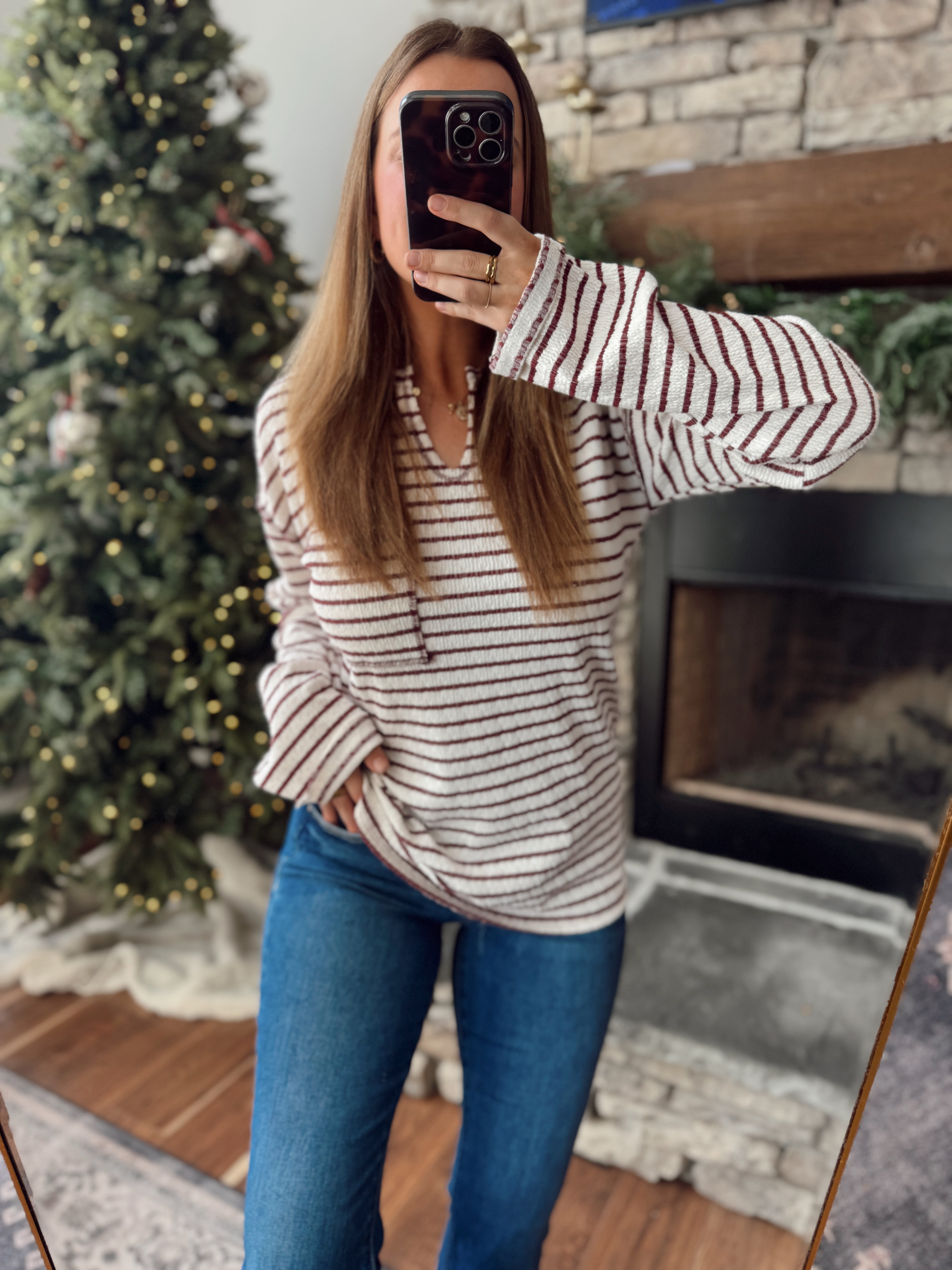 Meet your new go-to comfy-cute essential! This soft striped henley features a relaxed fit, drop shoulders, and the perfect mix of cozy and casual. The lightweight knit fabric feels amazing on, and the subtle raw edges give it that effortless look we love.
