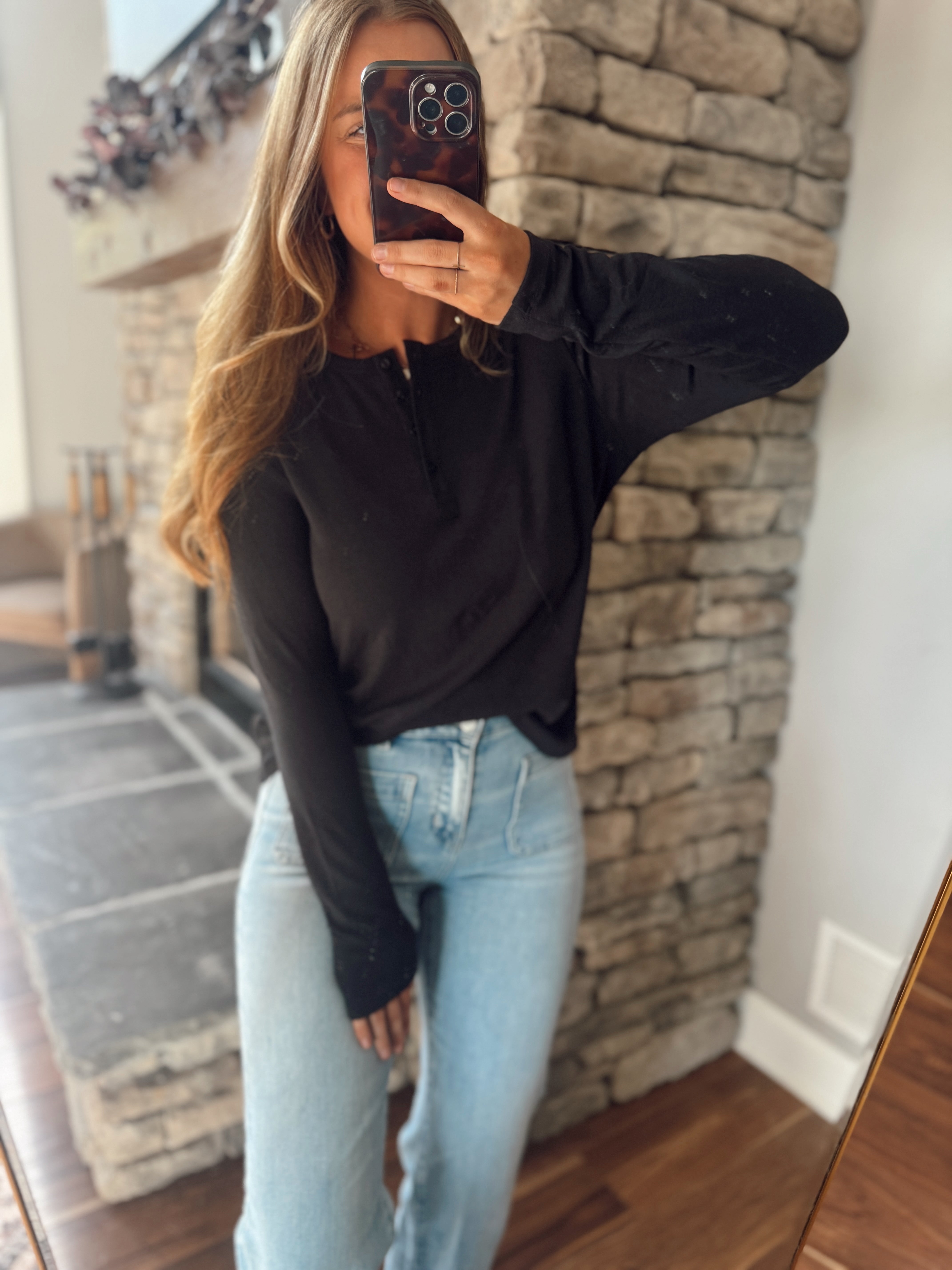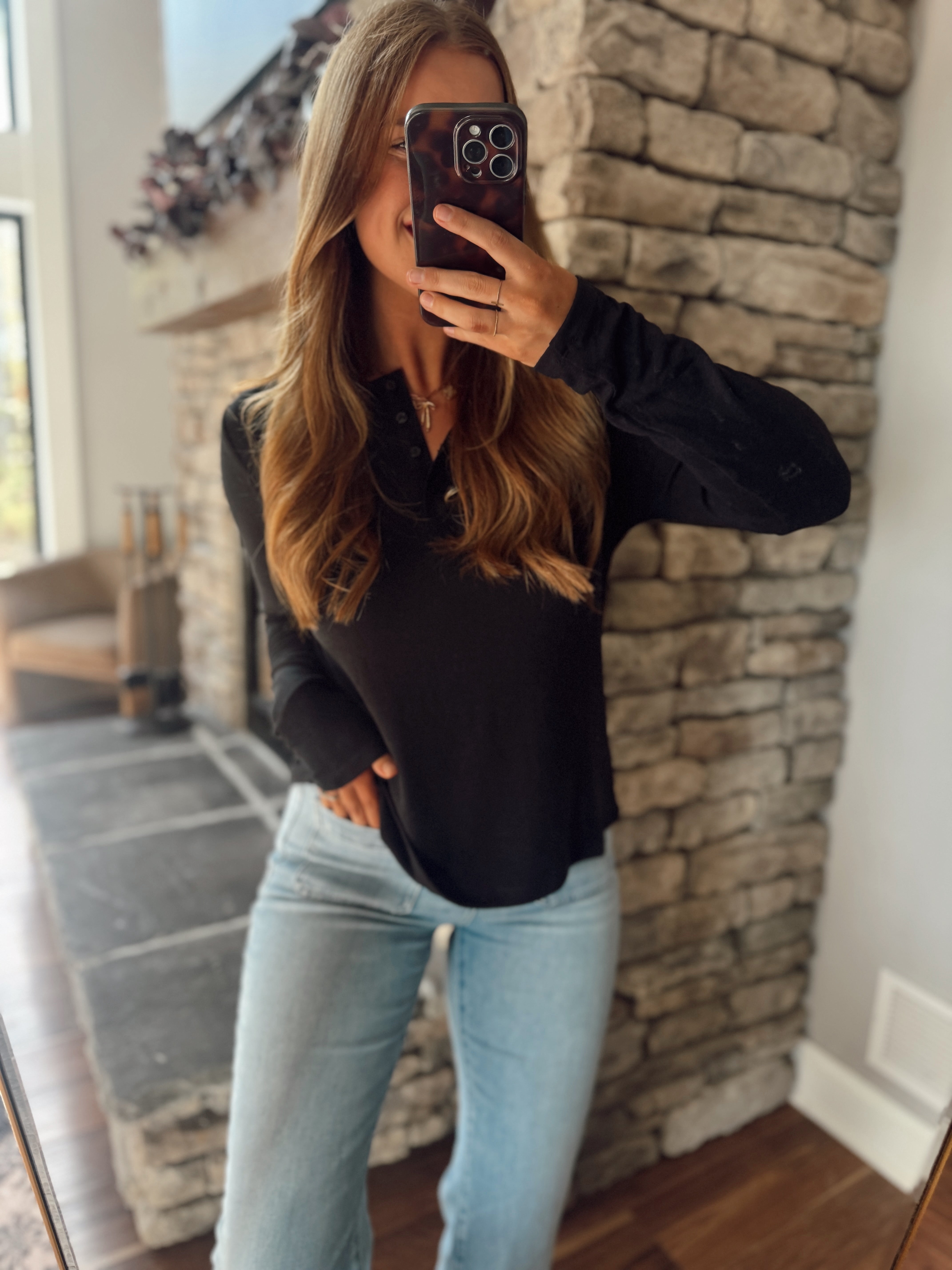 Meet your new go-to for layering season. This soft ribbed Henley has that perfect lived-in feel with just the right amount of stretch. The button neckline adds an effortless touch of detail while keeping things classic and cozy. Dress it up with denim or layer it under shackets and vests — either way, it’s an instant favorite.