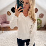Elevate your everyday wardrobe with this charming off-white v-neck top, where thoughtful seam banding adds just the right amount of visual interest. The relaxed fit makes it perfect for pairing with your favorite jeans or layering under a cozy cardigan. Whether you're running errands or meeting friends for coffee, this versatile piece strikes that sweet spot between effortless and put-together. A closet essential that works as hard as you do.