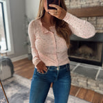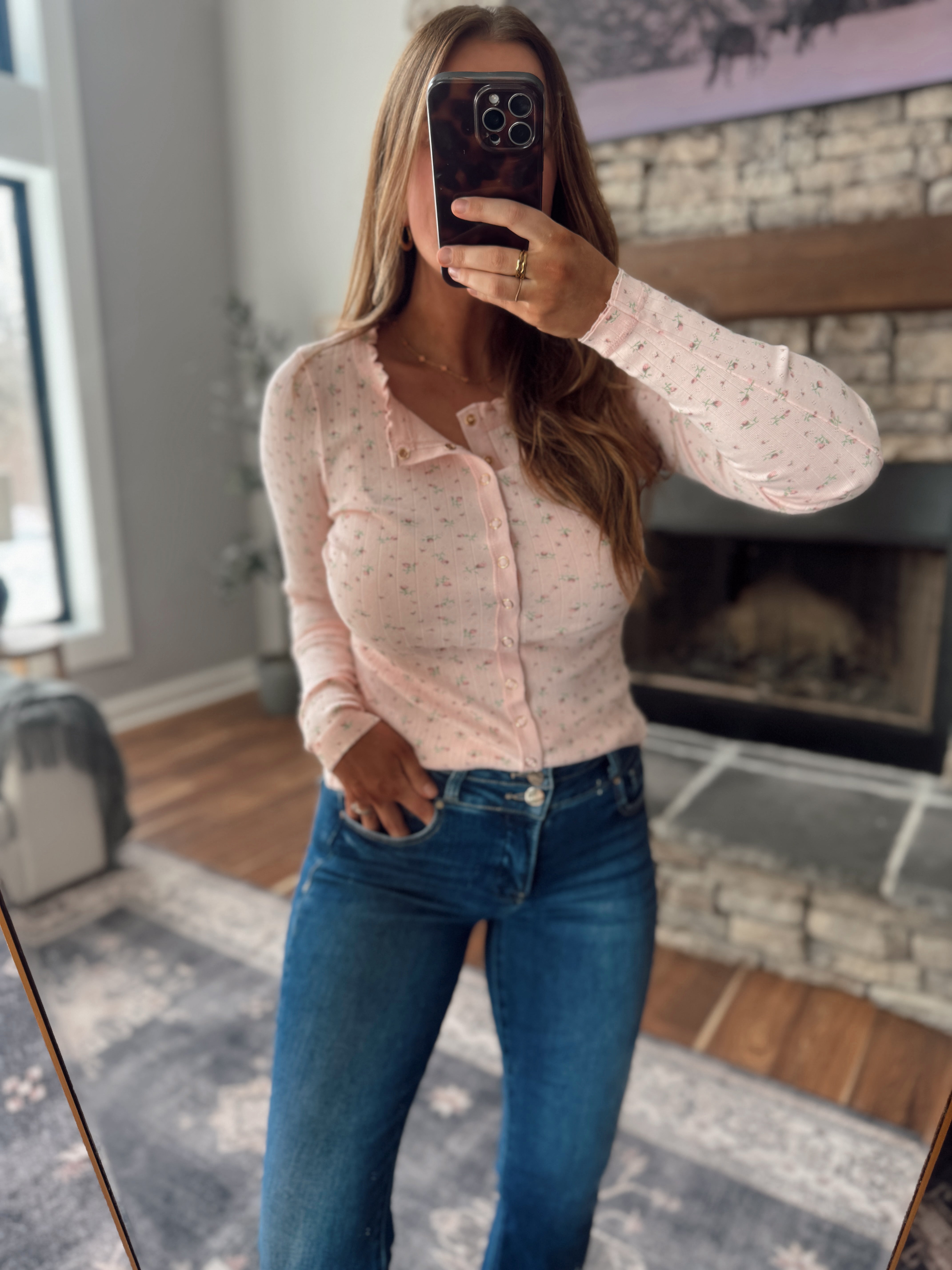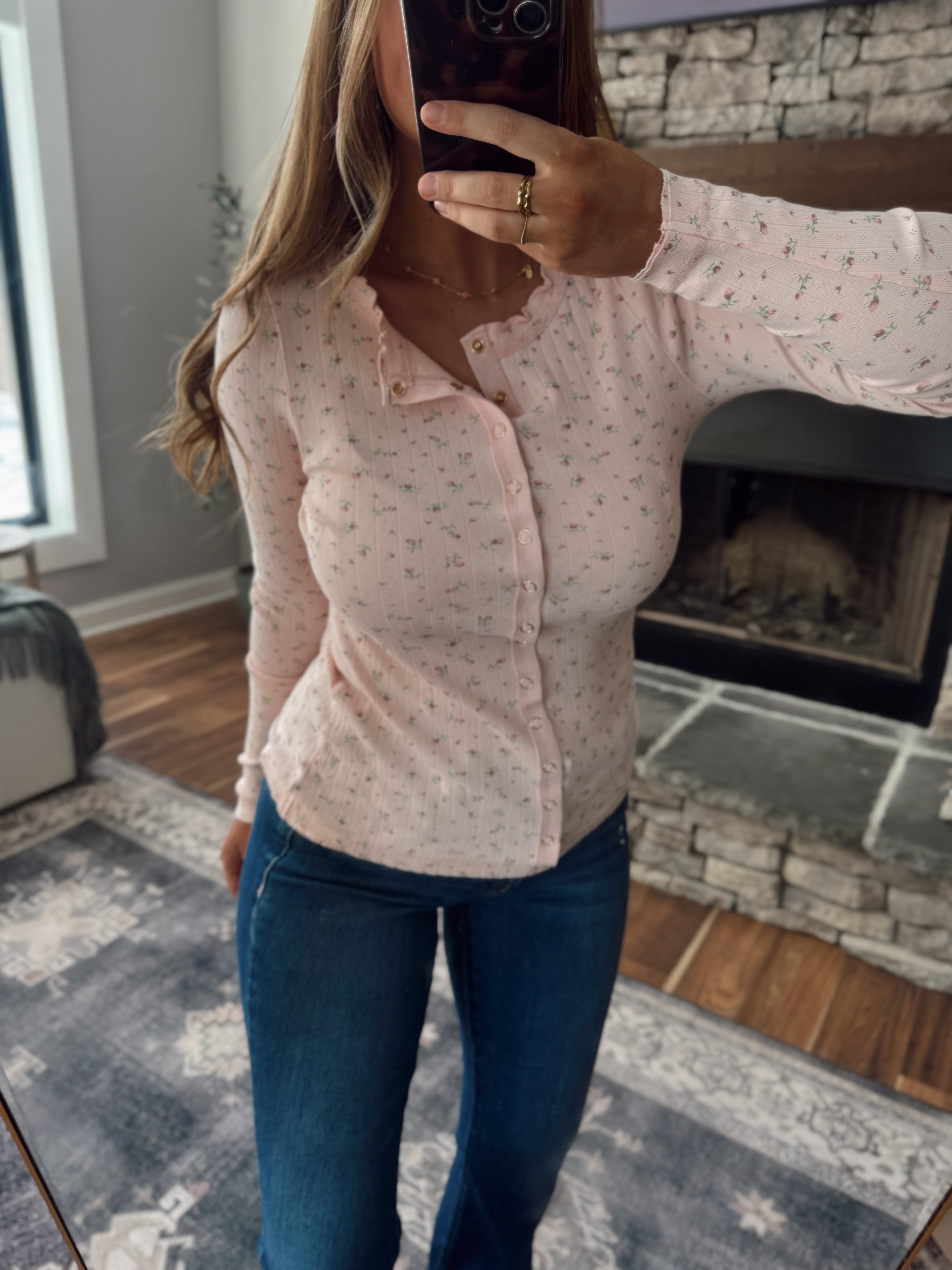 Soft, feminine, and effortlessly flattering. This ribbed button-front top features a delicate ditsy floral print with the sweetest scalloped neckline for a romantic, elevated touch. The stretchy ribbed fabric hugs just right while staying comfortable enough for all-day wear.